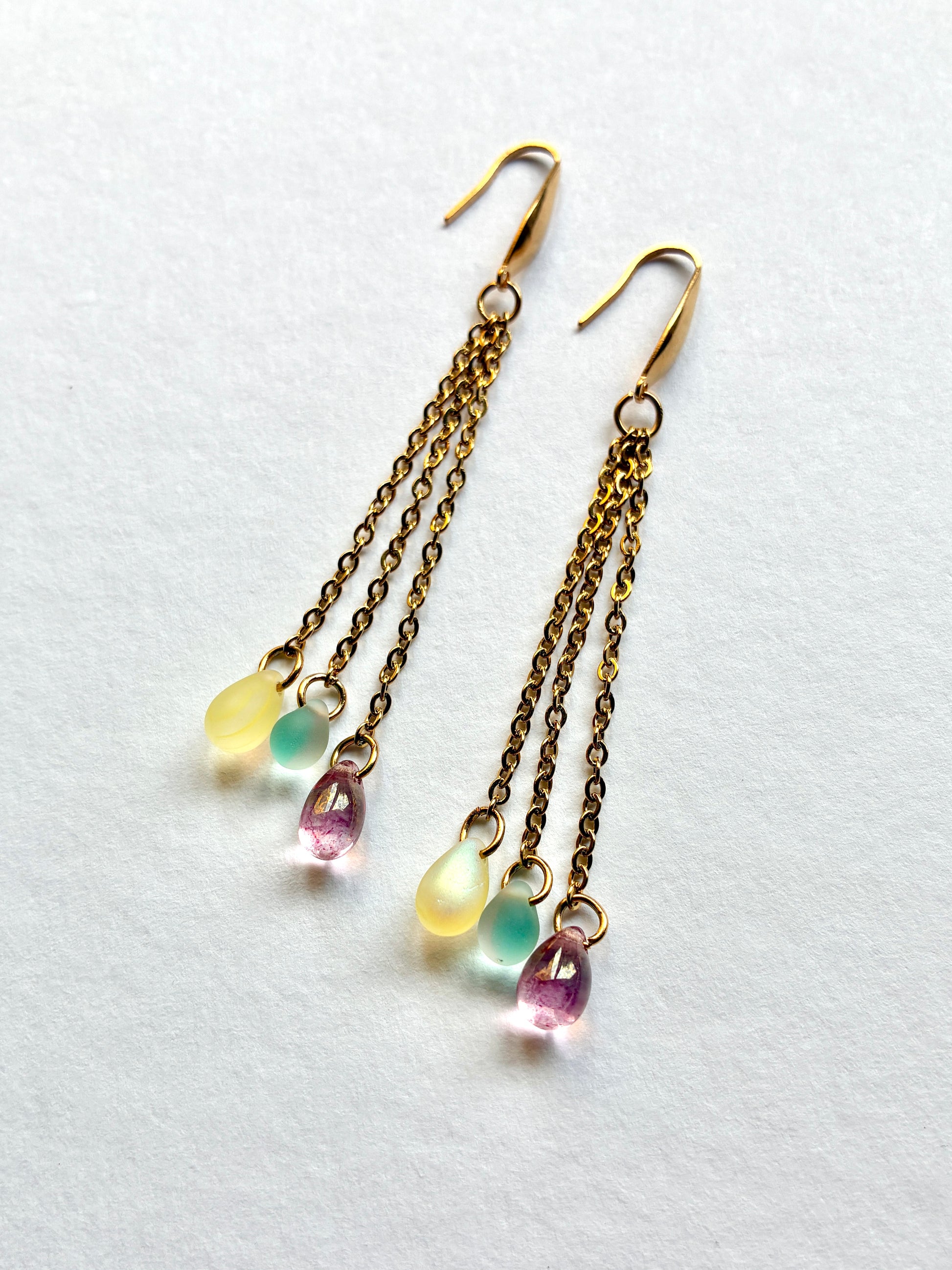 Les Gouttes Sorbet dansent au bout de leurs chaînes dorées, comme des perles nées d’un été enchanté. Leurs teintes douces évoquent des sorbets fondants dégustés au soleil, quelque part entre rêve et réalité.