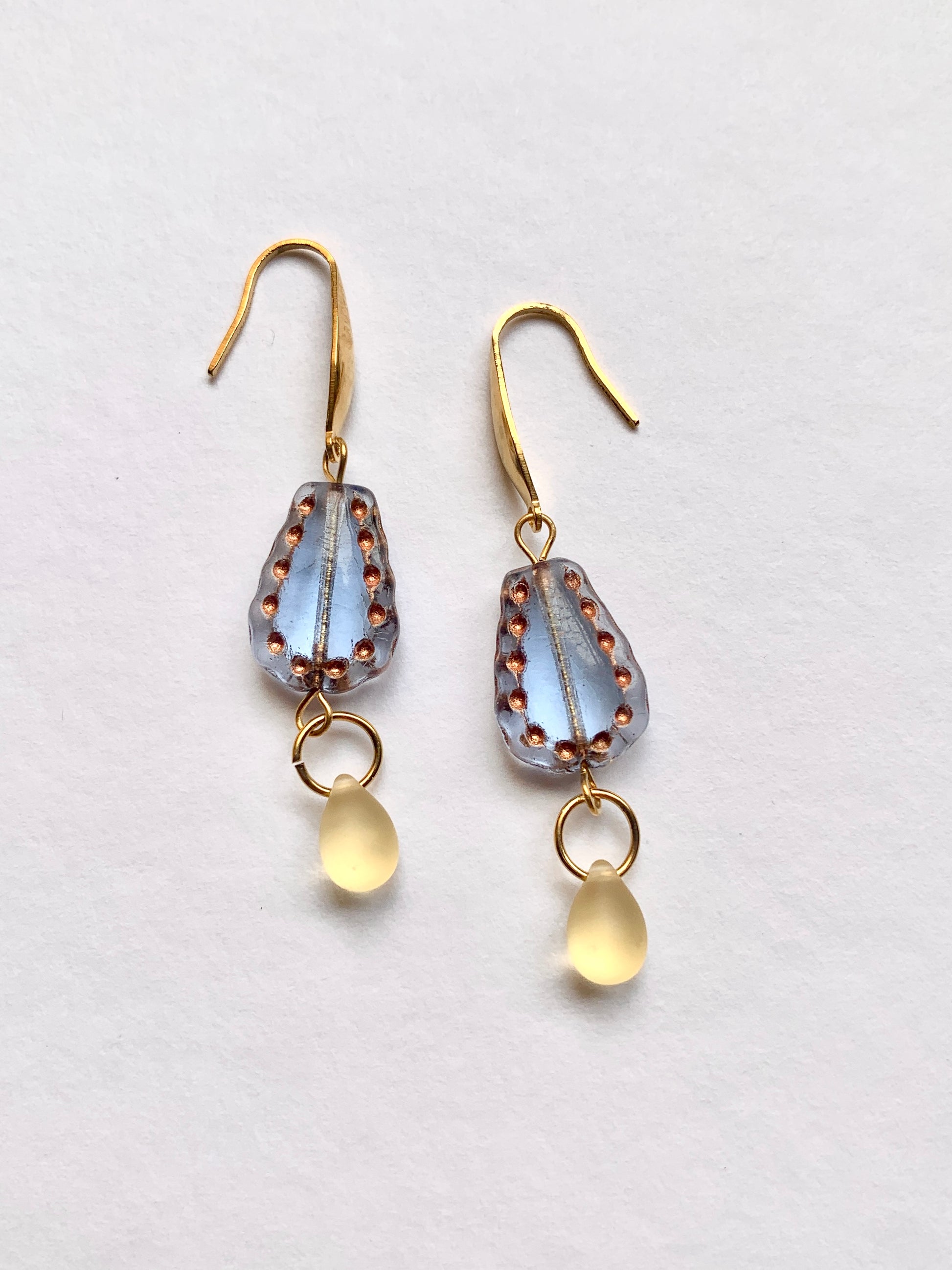 Les perles de verre façonnées artisanalement dévoilent un bleu pastel presque givré, ponctué de détails cuivrés qui rappellent l’ornementation baroque, tout en restant aérien, subtil et résolument chic.