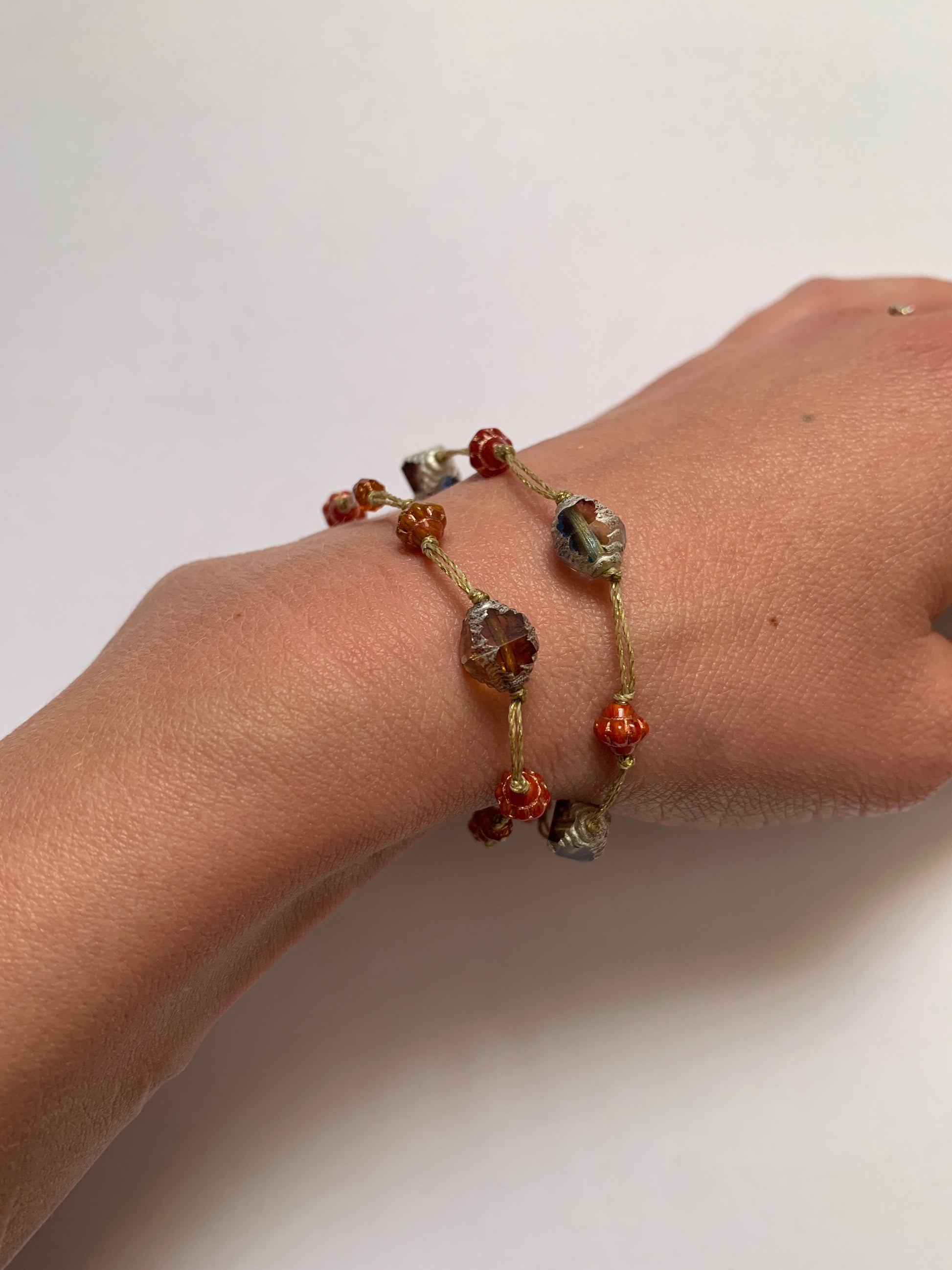 Tel un chapelet de petites lumières, Lanterne Ambrée mêle l’éclat flamboyant des tons oranges et la délicatesse de la perle de verre aux reflets d’Ambre. Monté sur un fil doré léger, ce bijou capte la lumière et la diffuse comme une lueur protectrice. Bohème et raffiné, il évoque les lanternes qui brillent dans la nuit, guides discrets pour les âmes voyageuses.