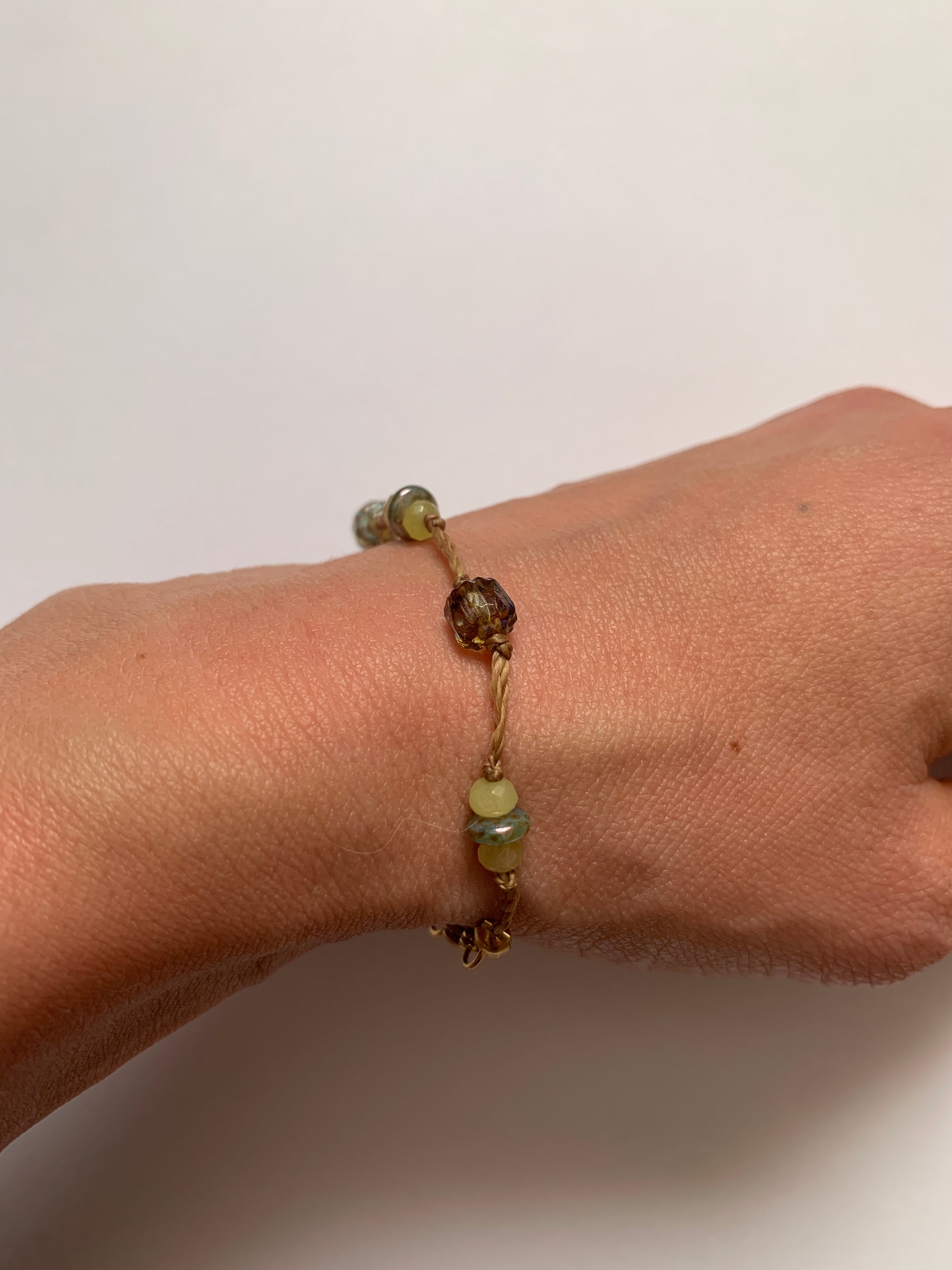 Monté sur une corde fine et résistante, Vert Lumière allie légèreté et caractère. À la fois bohème et élégant, il se porte comme un souffle de nature, un talisman discret qui illumine le poignet de subtils reflets dorés et verts, rappelant la vitalité de la terre et la sérénité des grands espaces.