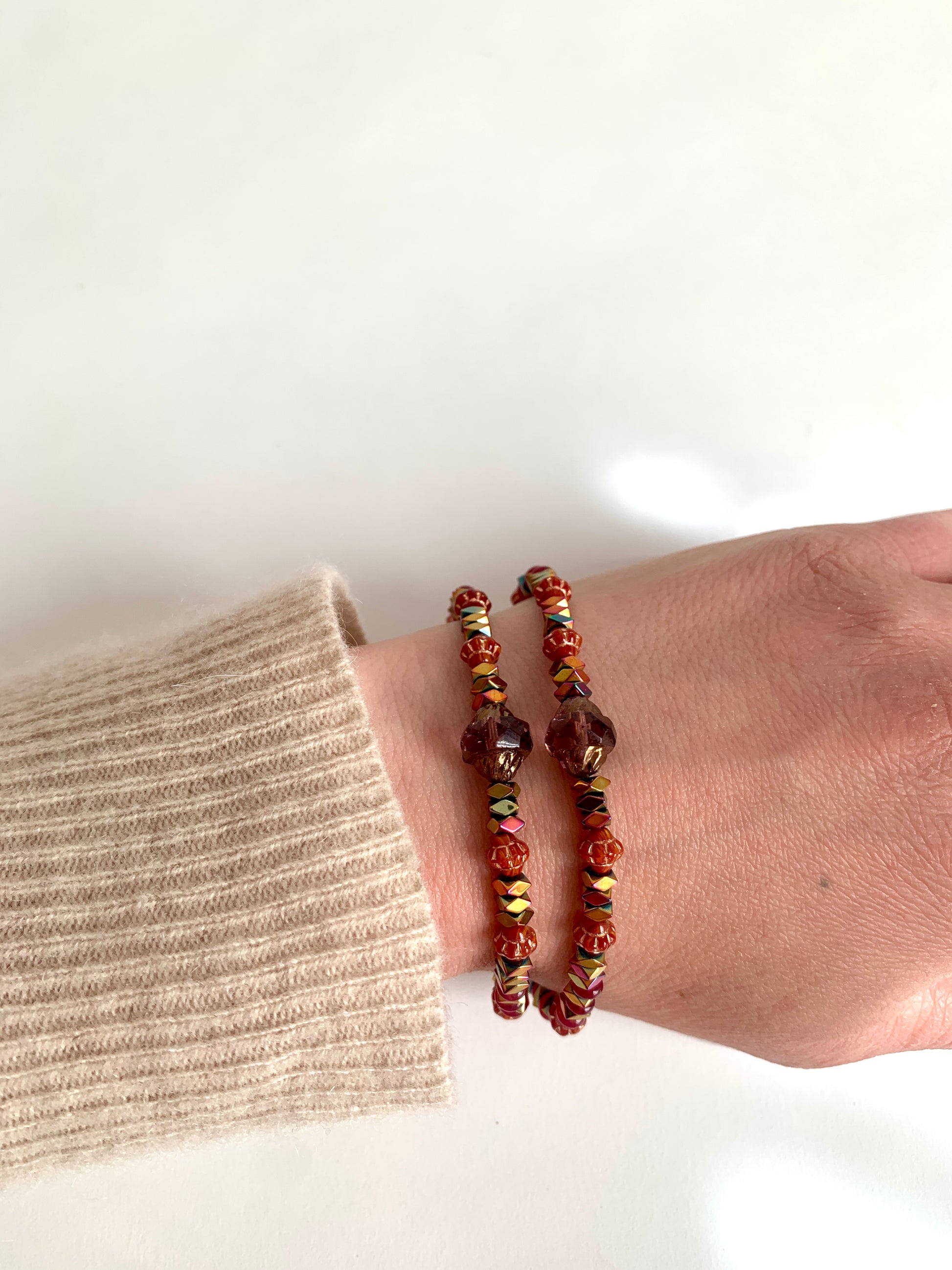 Les perles de verre captent la lumière, les hématites multicolores apportent ancrage et clarté.