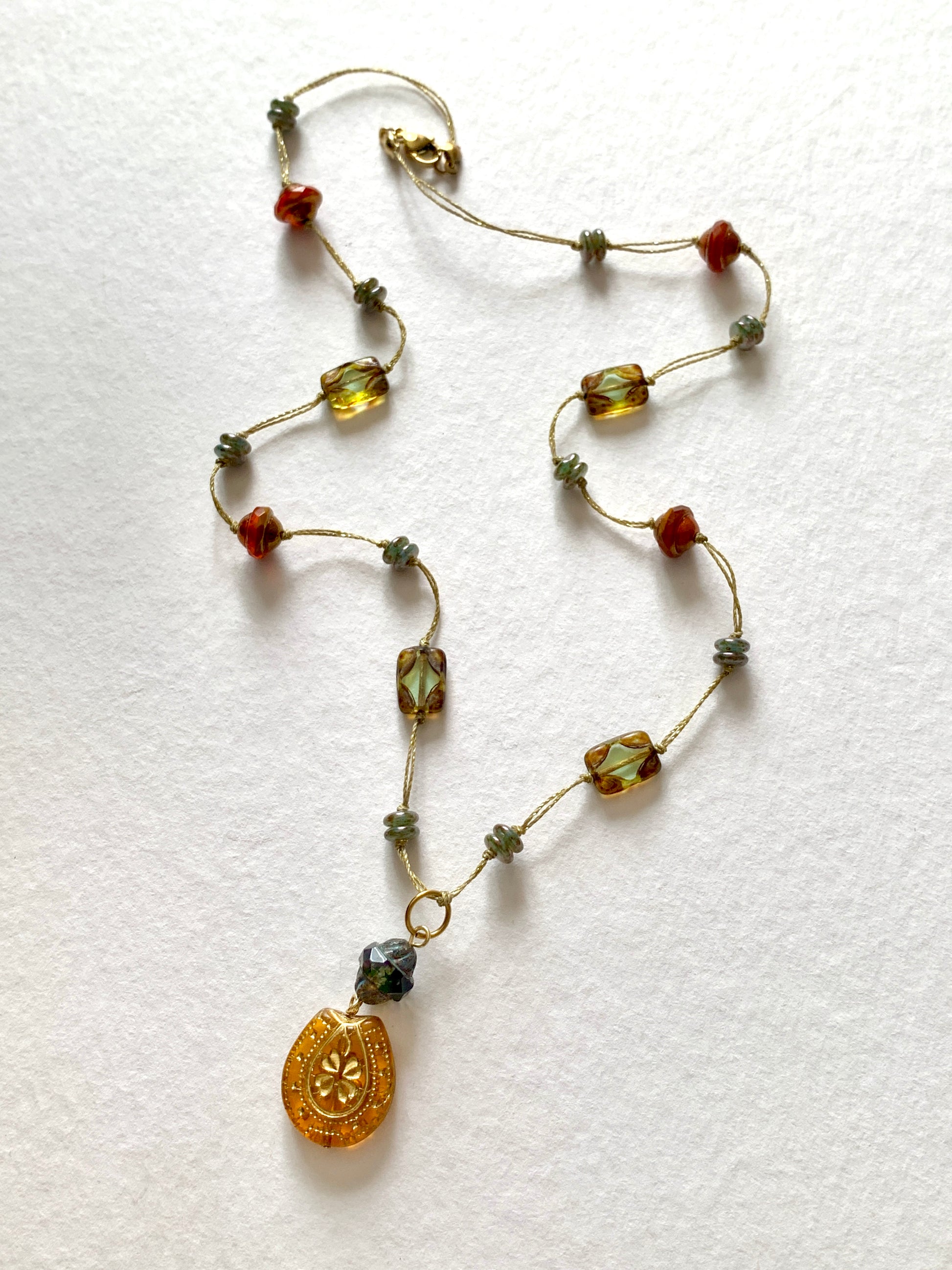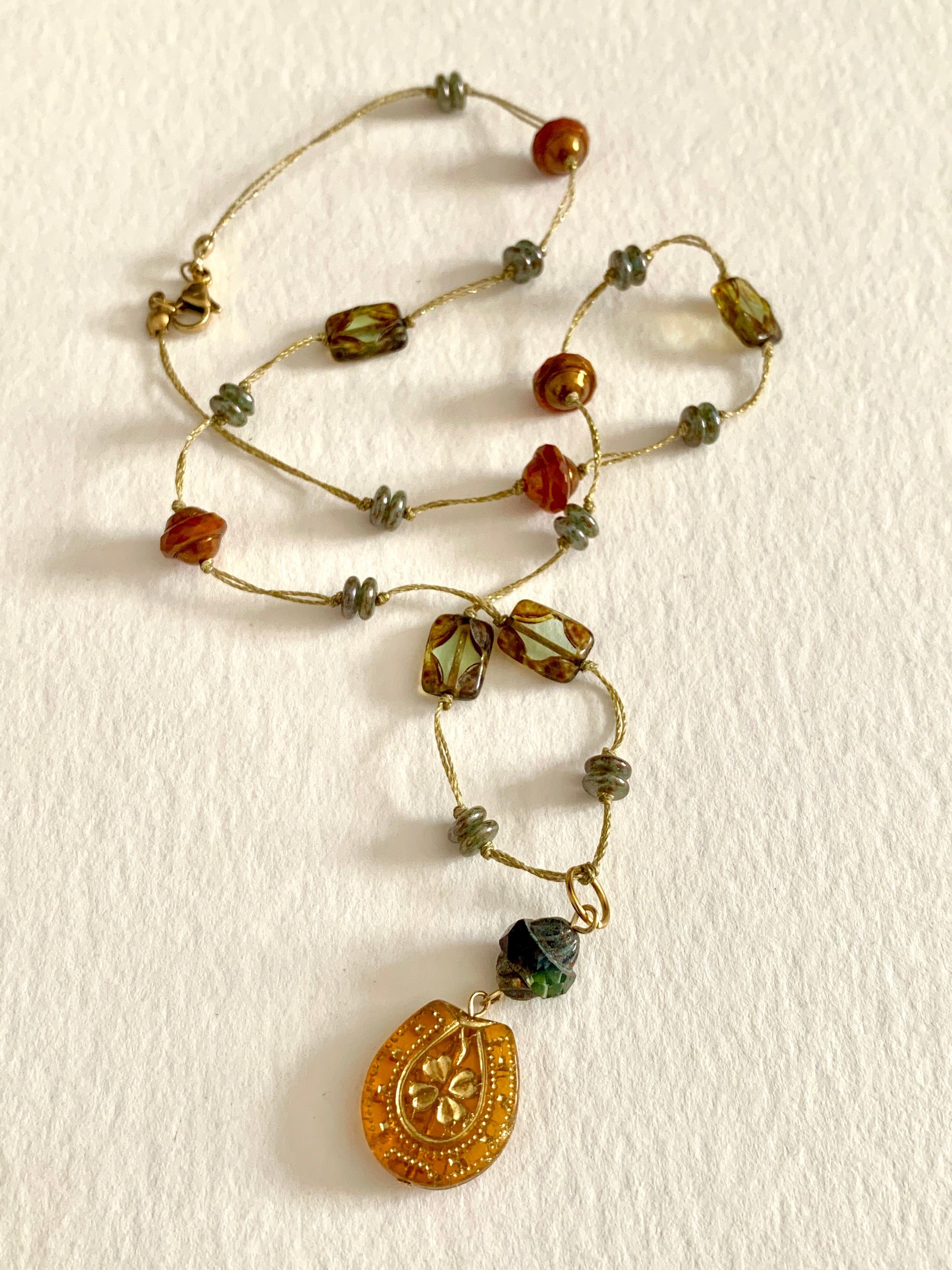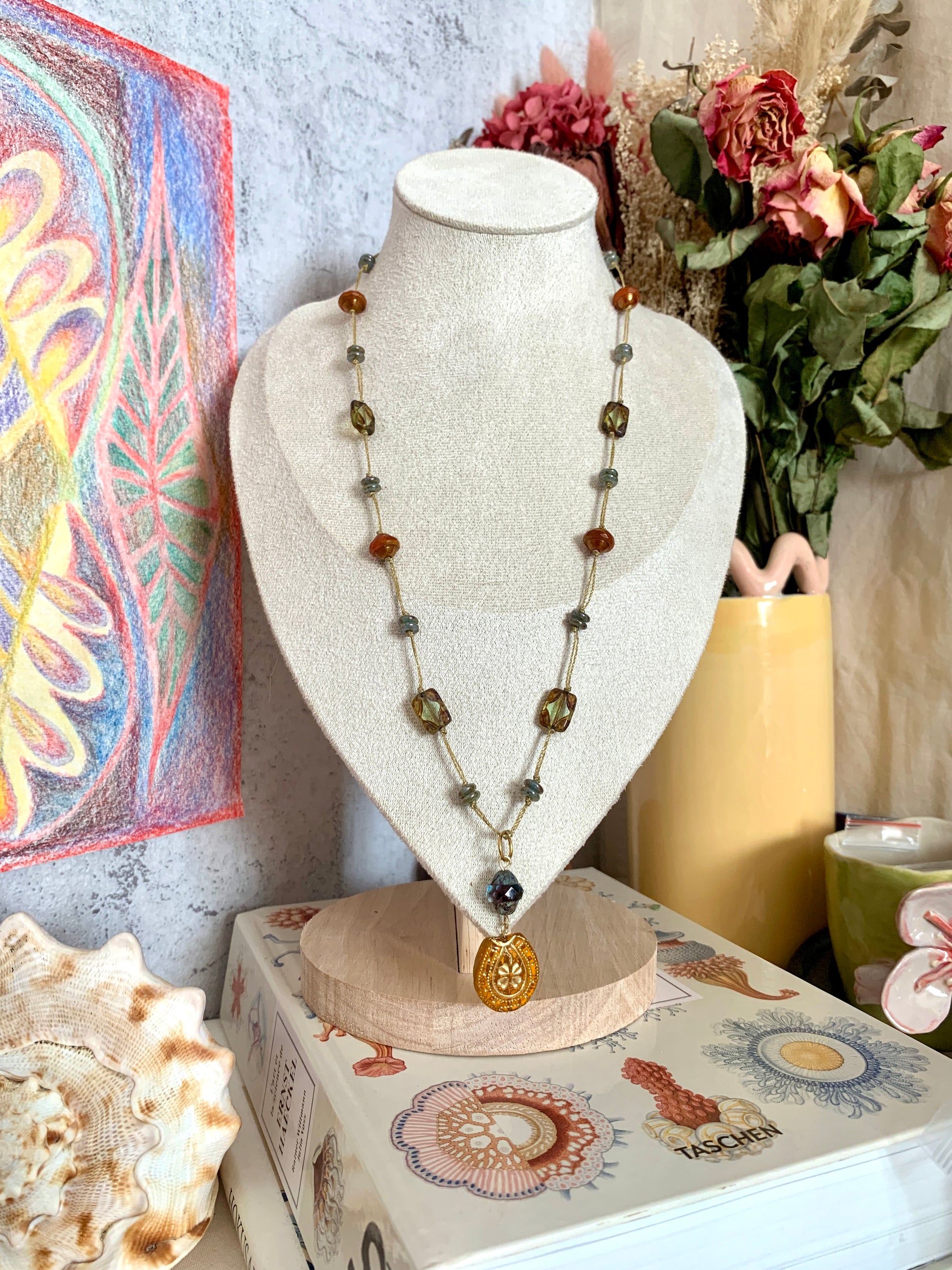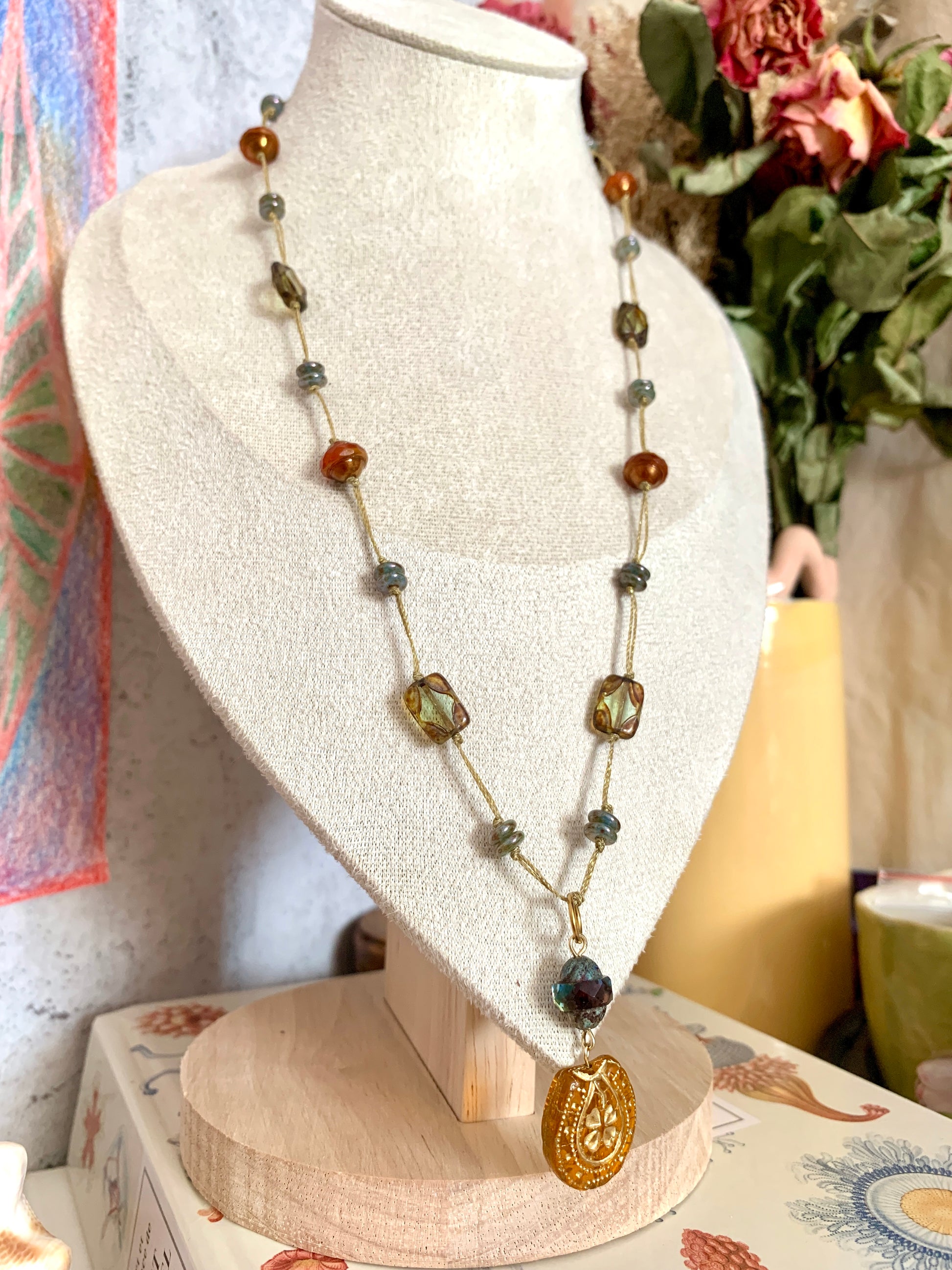 Au creux de ce collier, un fer à cheval en verre ancien abrite un trèfle discret, comme une promesse murmurée à l’univers. Autour de lui, la danse chaude de des perles de verre de couleur orange et kaki.
