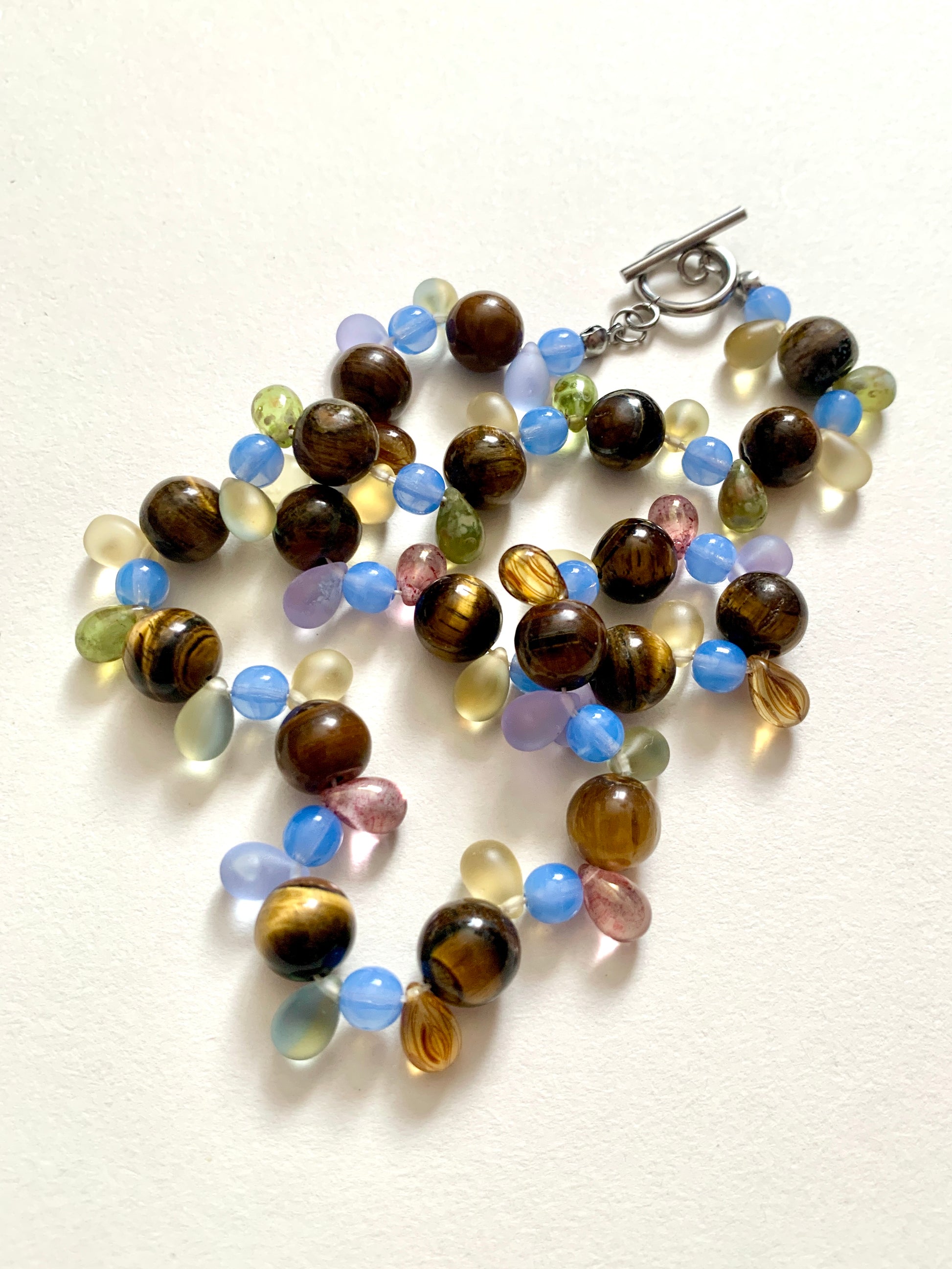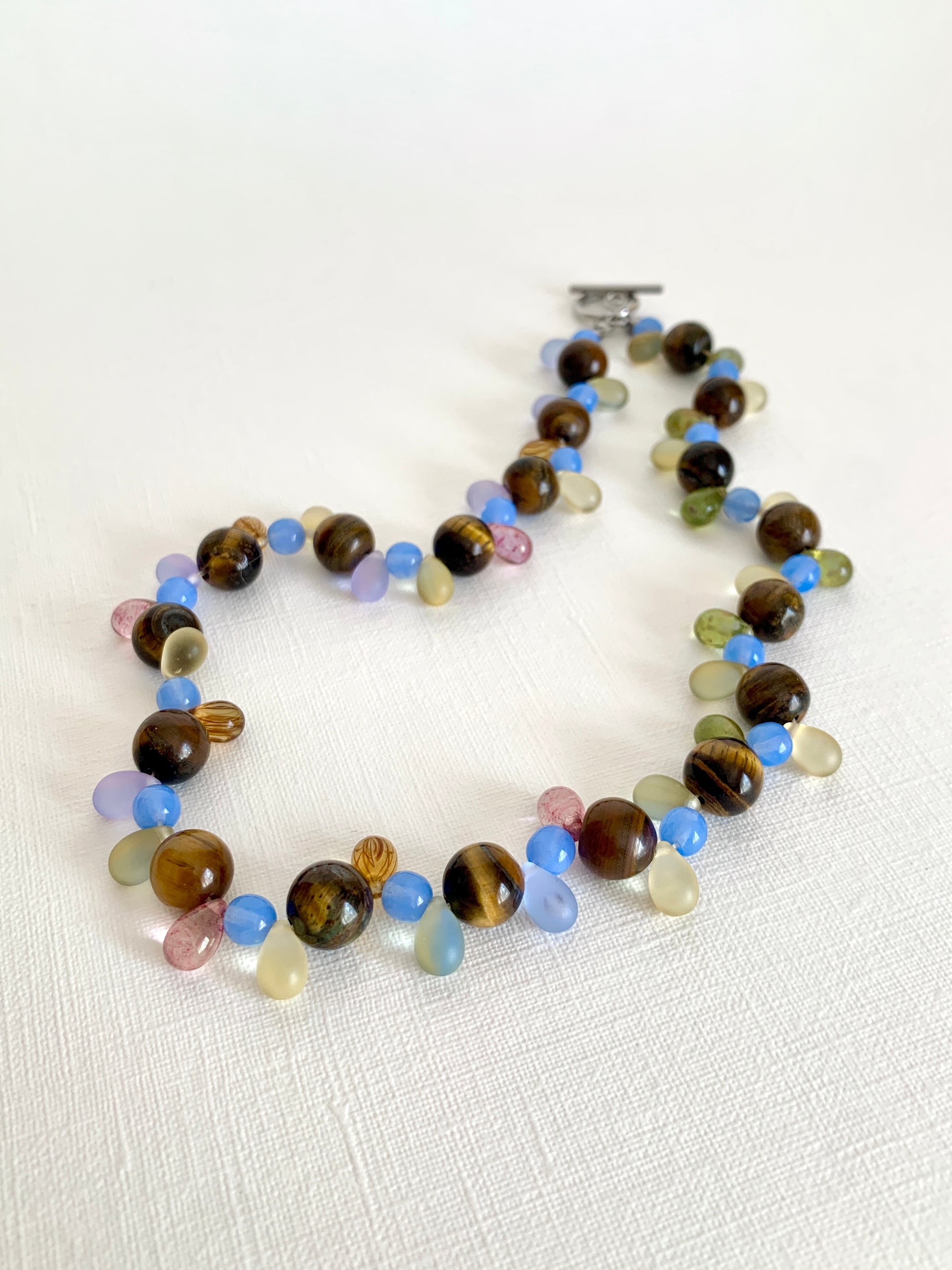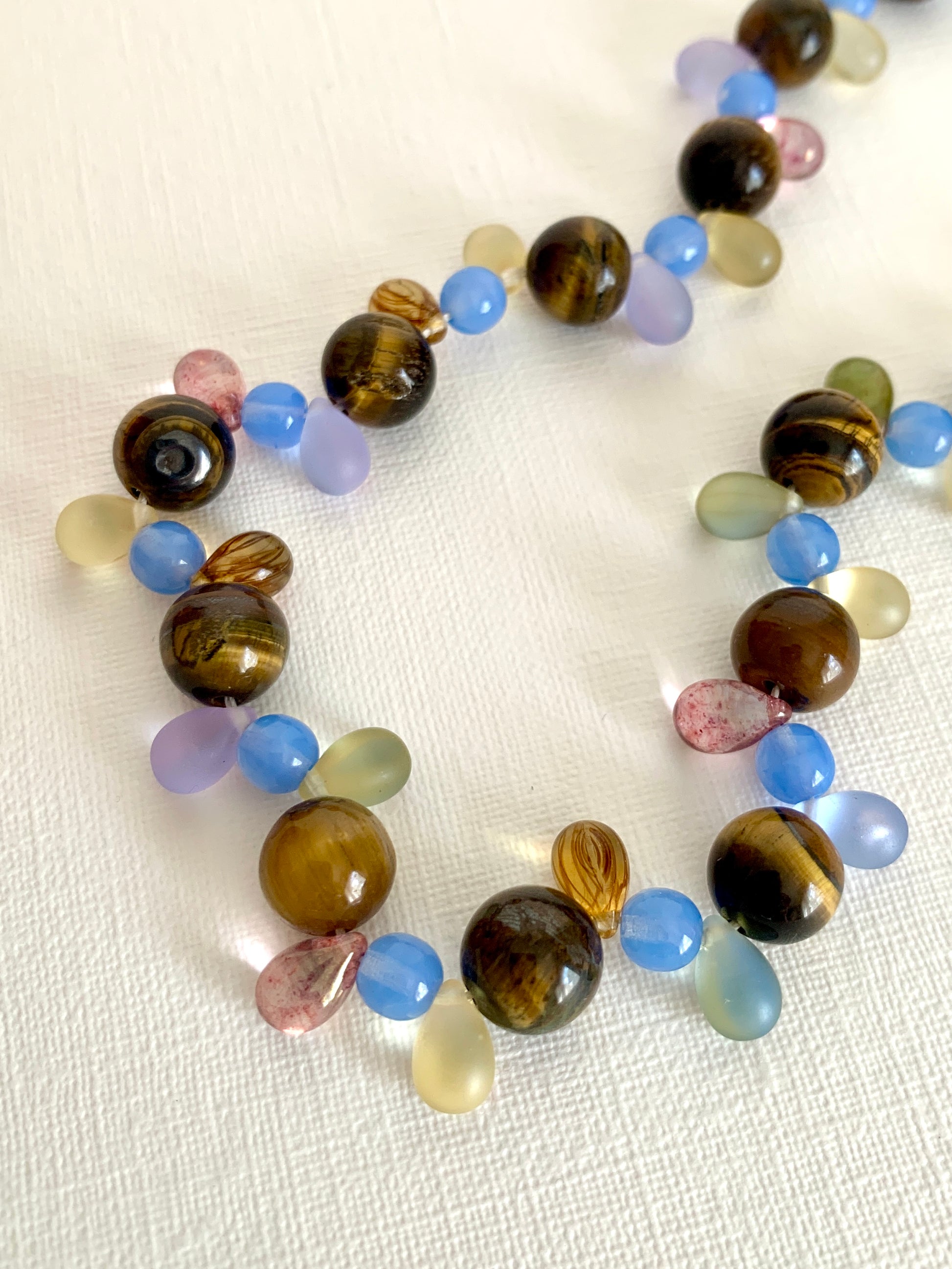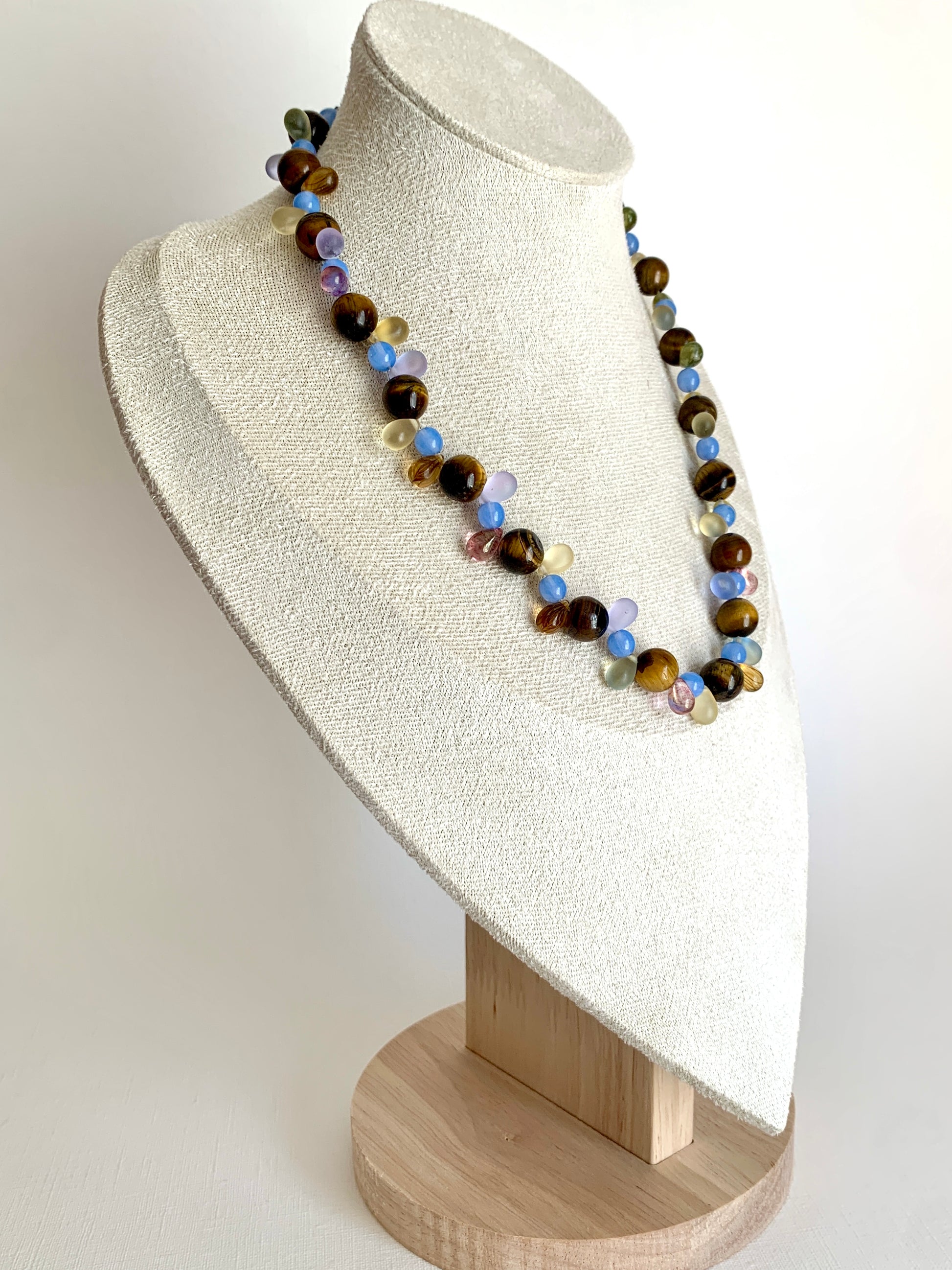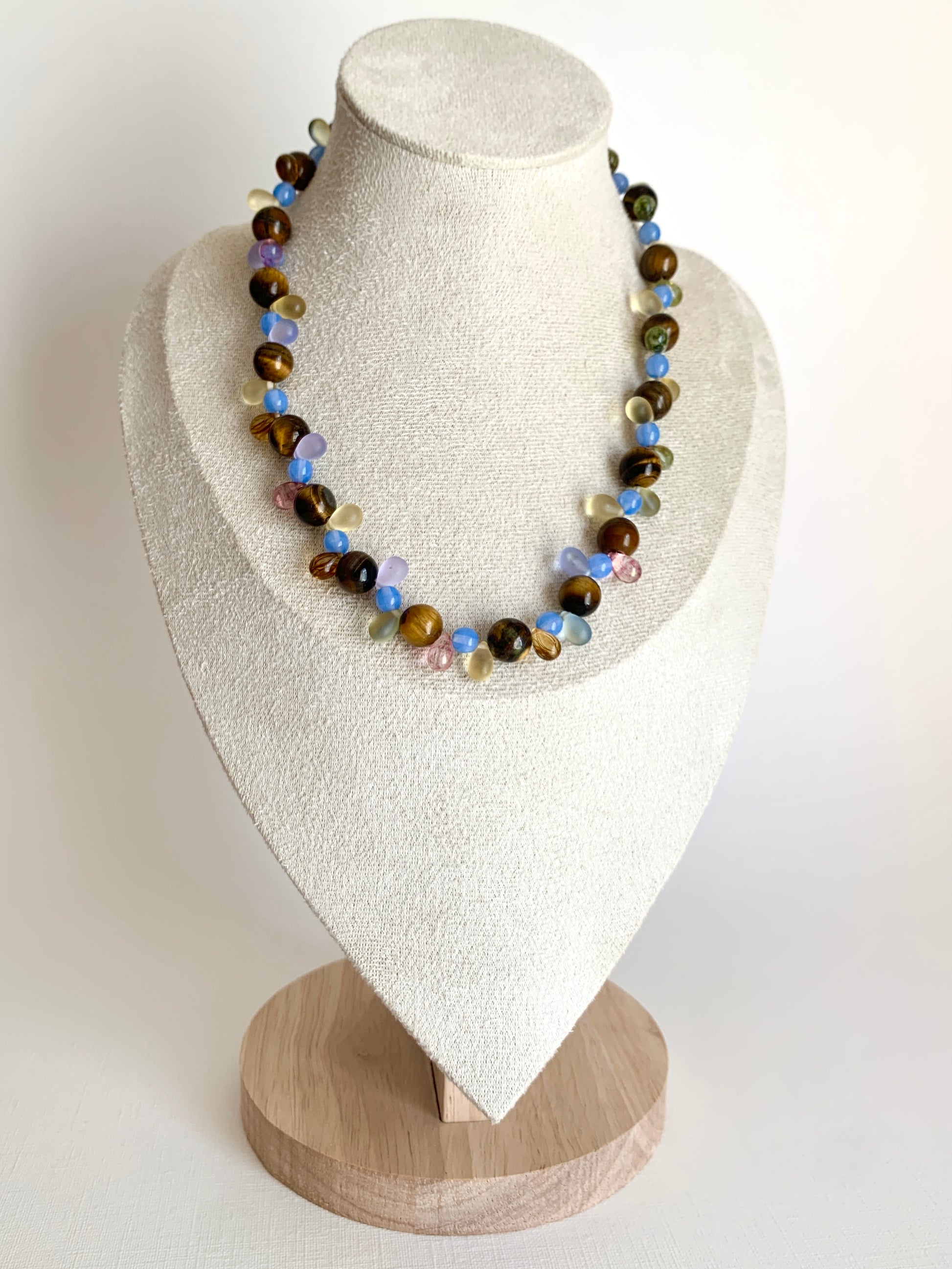 Les perles de verre délicates, captent les reflets d’un matin silencieux, tandis que les pierres d’œil de tigre, puissantes et profondes, ancrent l’ensemble dans une force douce. Connue pour protéger, renforcer la confiance et recentrer l’esprit, cette pierre incarne la stabilité intérieure dans le tumulte du monde.