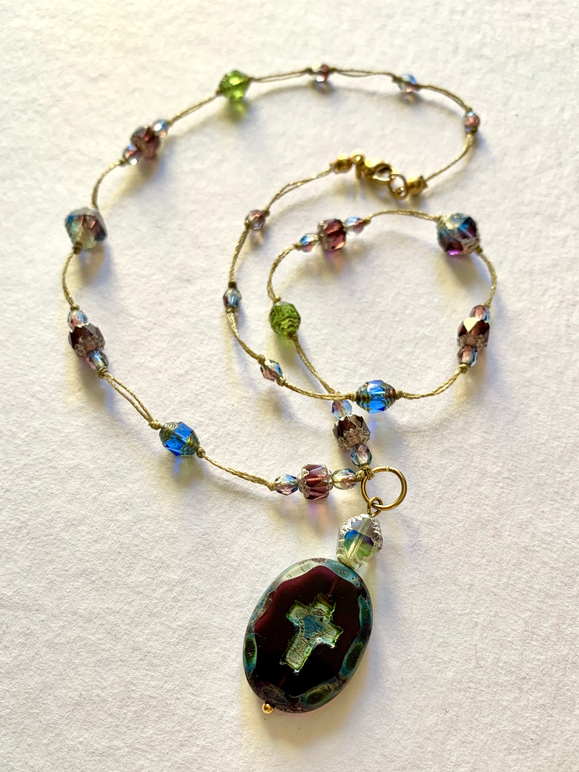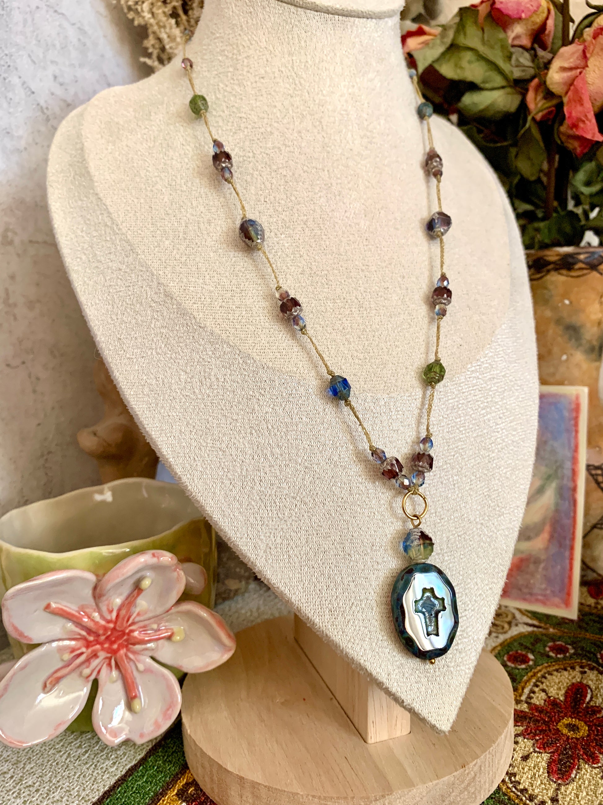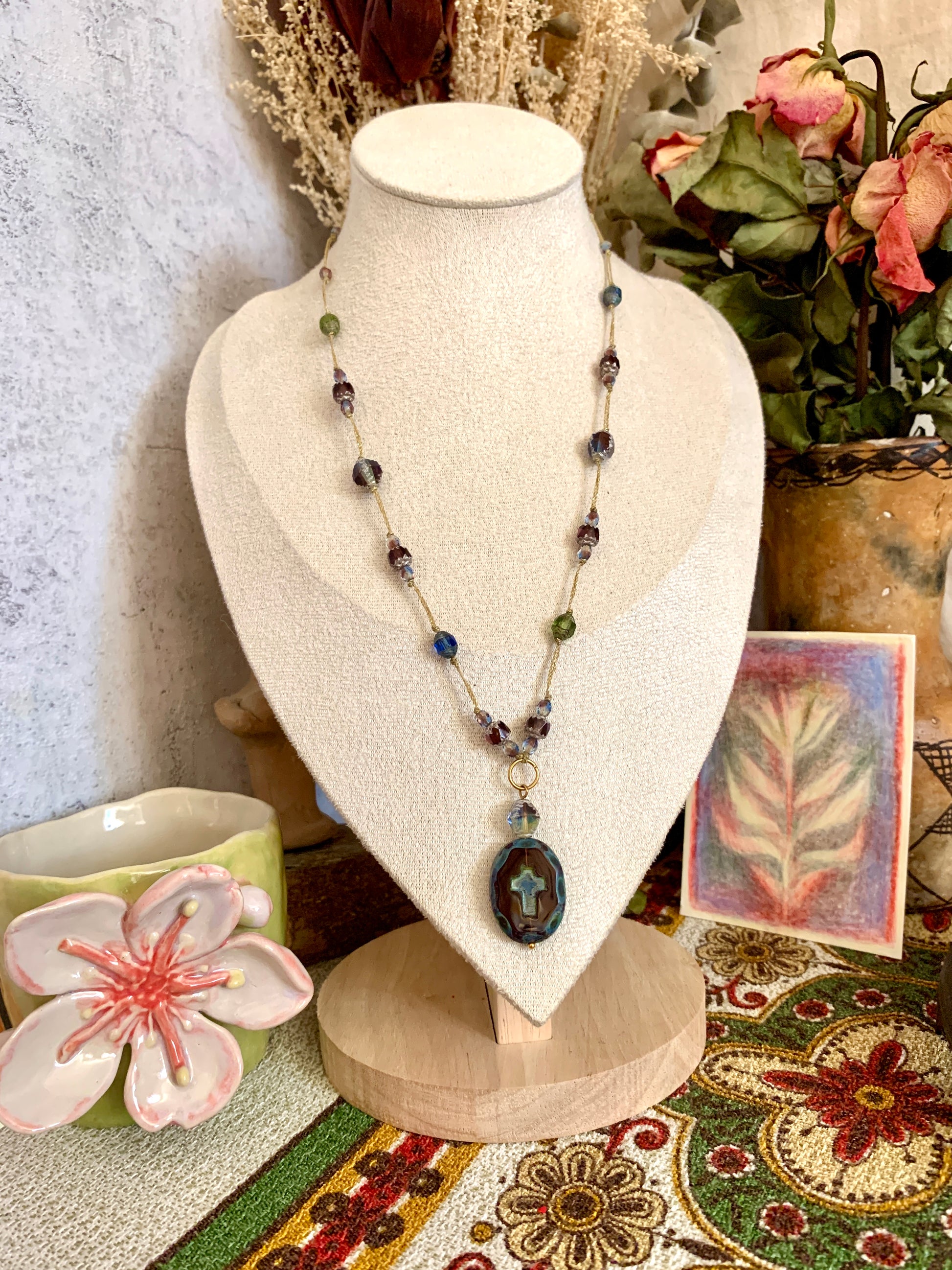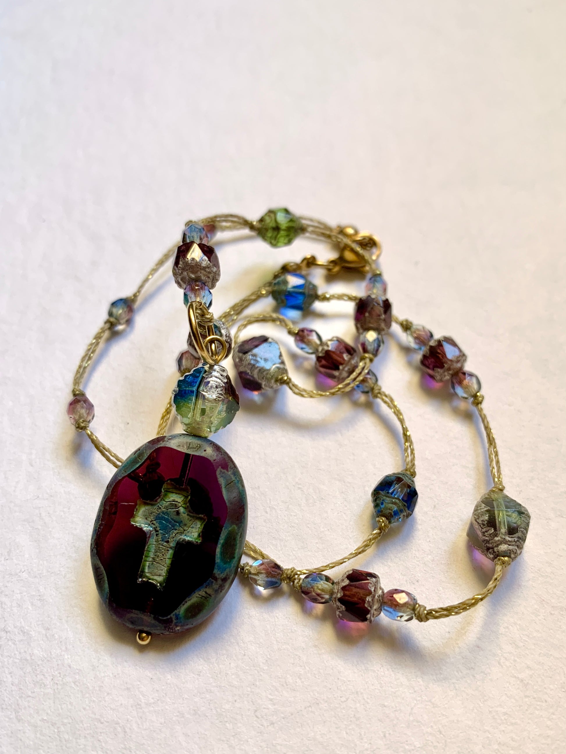 Son médaillon grenat, traversé d’une croix, semble garder en lui la trace d’une prière ancienne.
