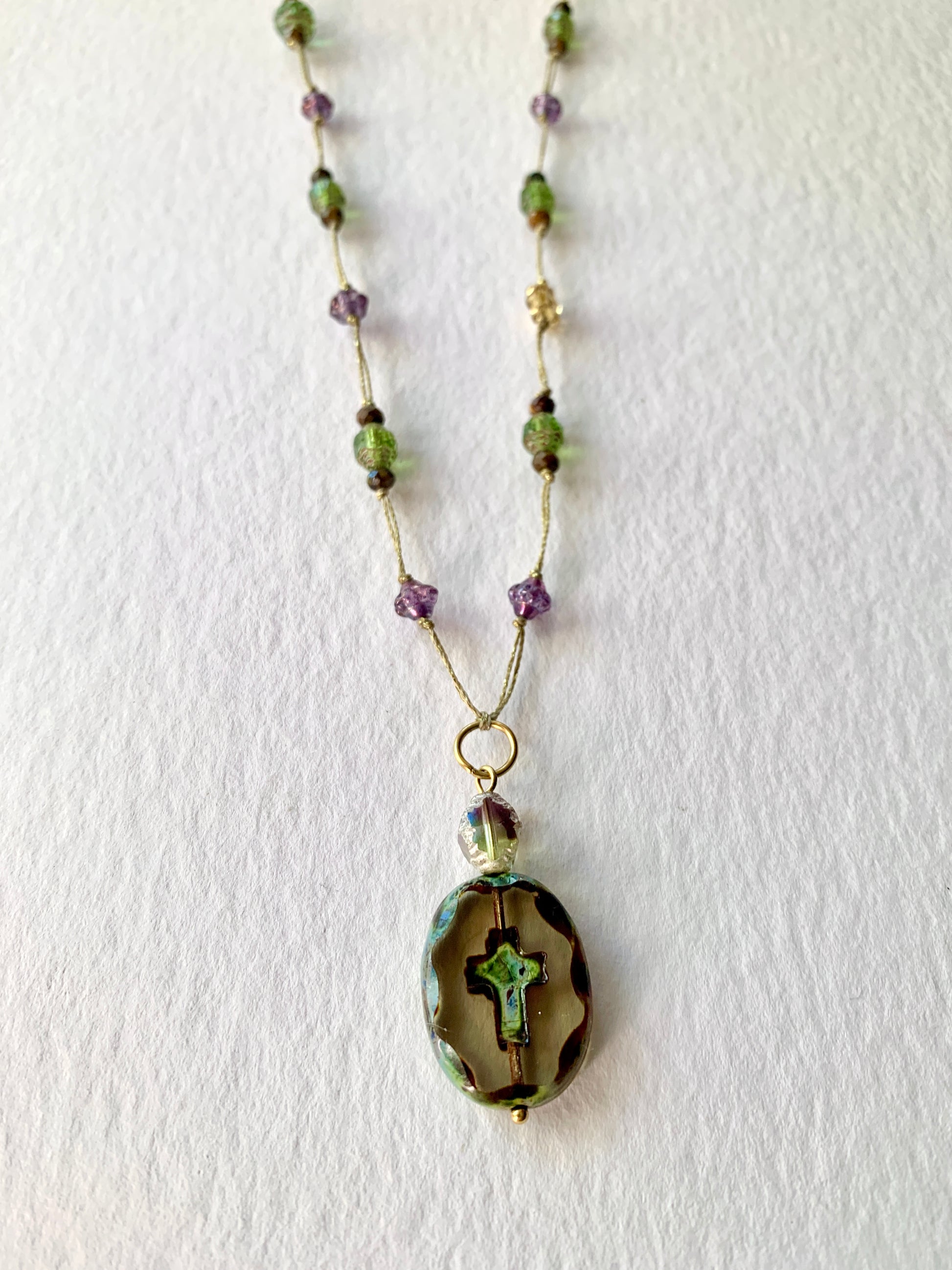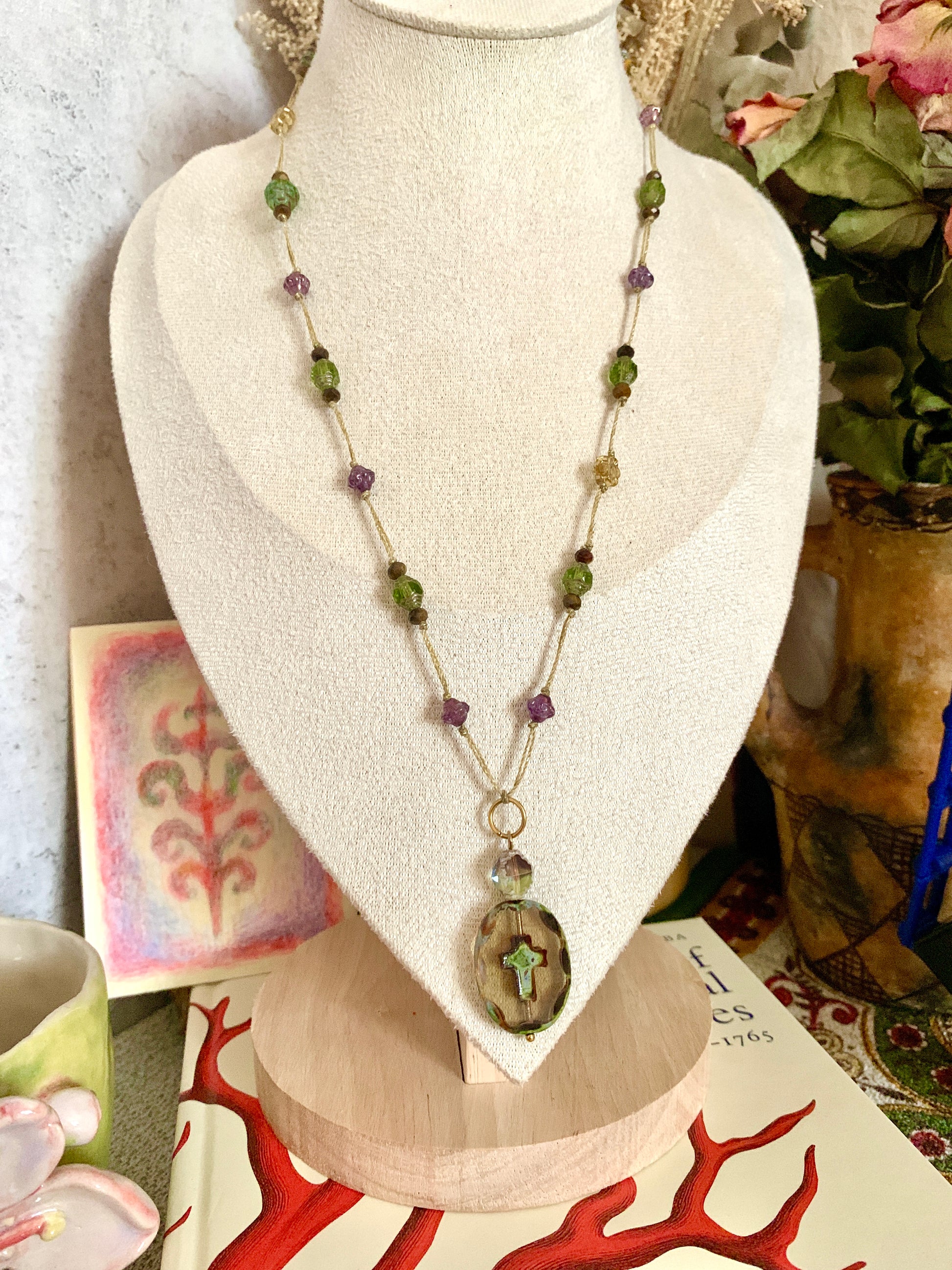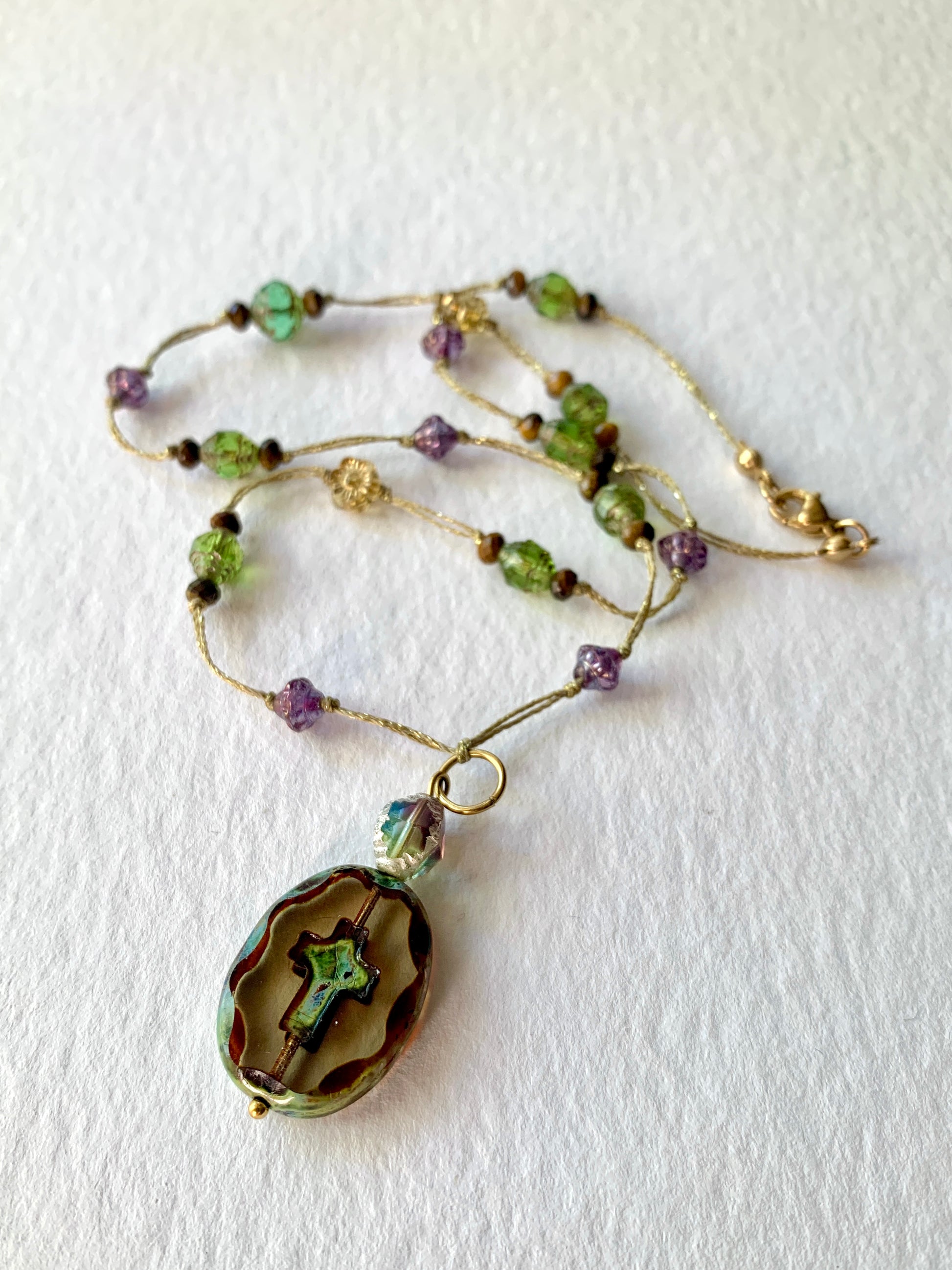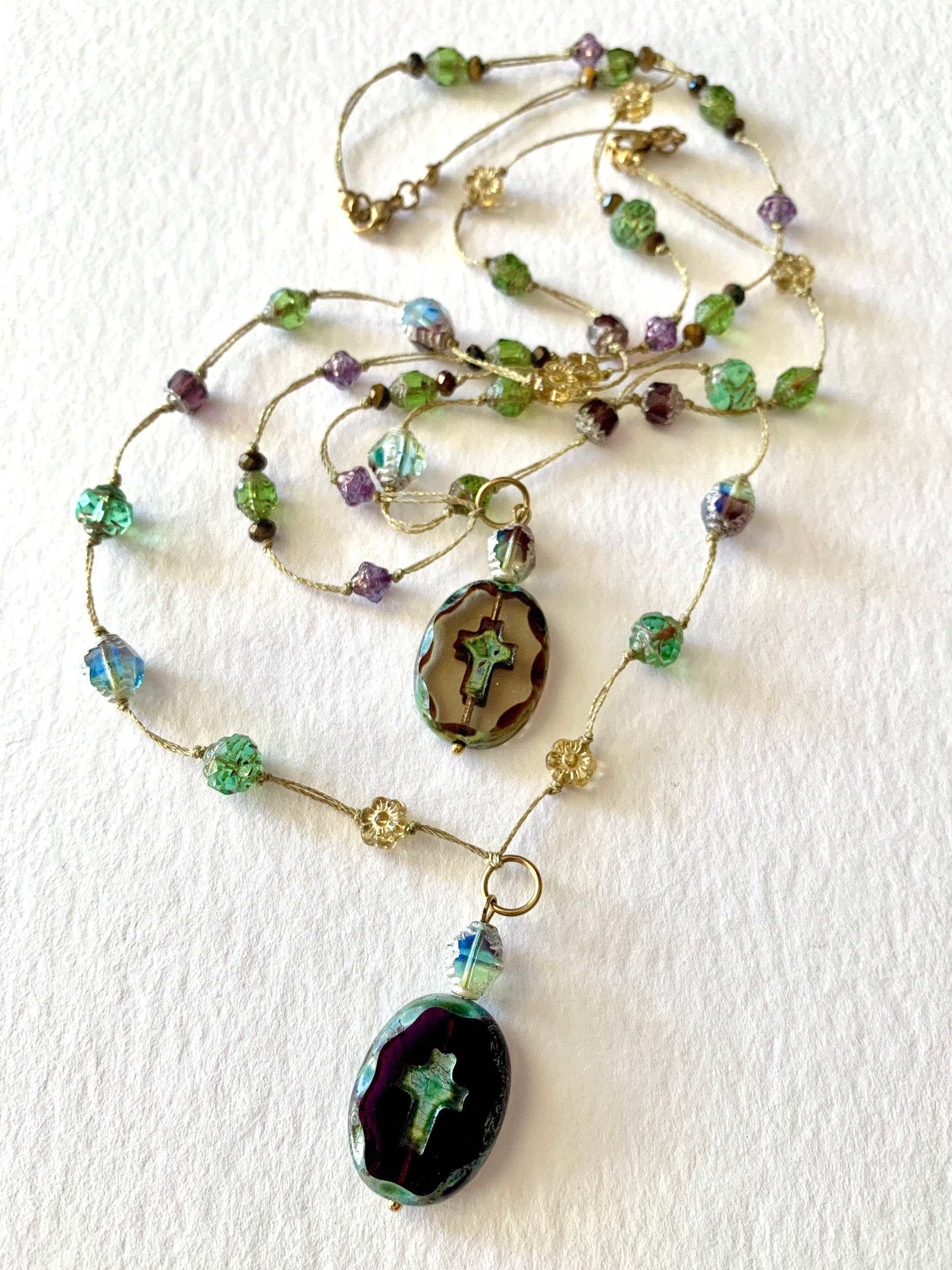 Autour, les perles, œil de tigre, vert lumineux, éclats violets et dorés, rappellent la nature comme guide, la beauté comme prière silencieuse.