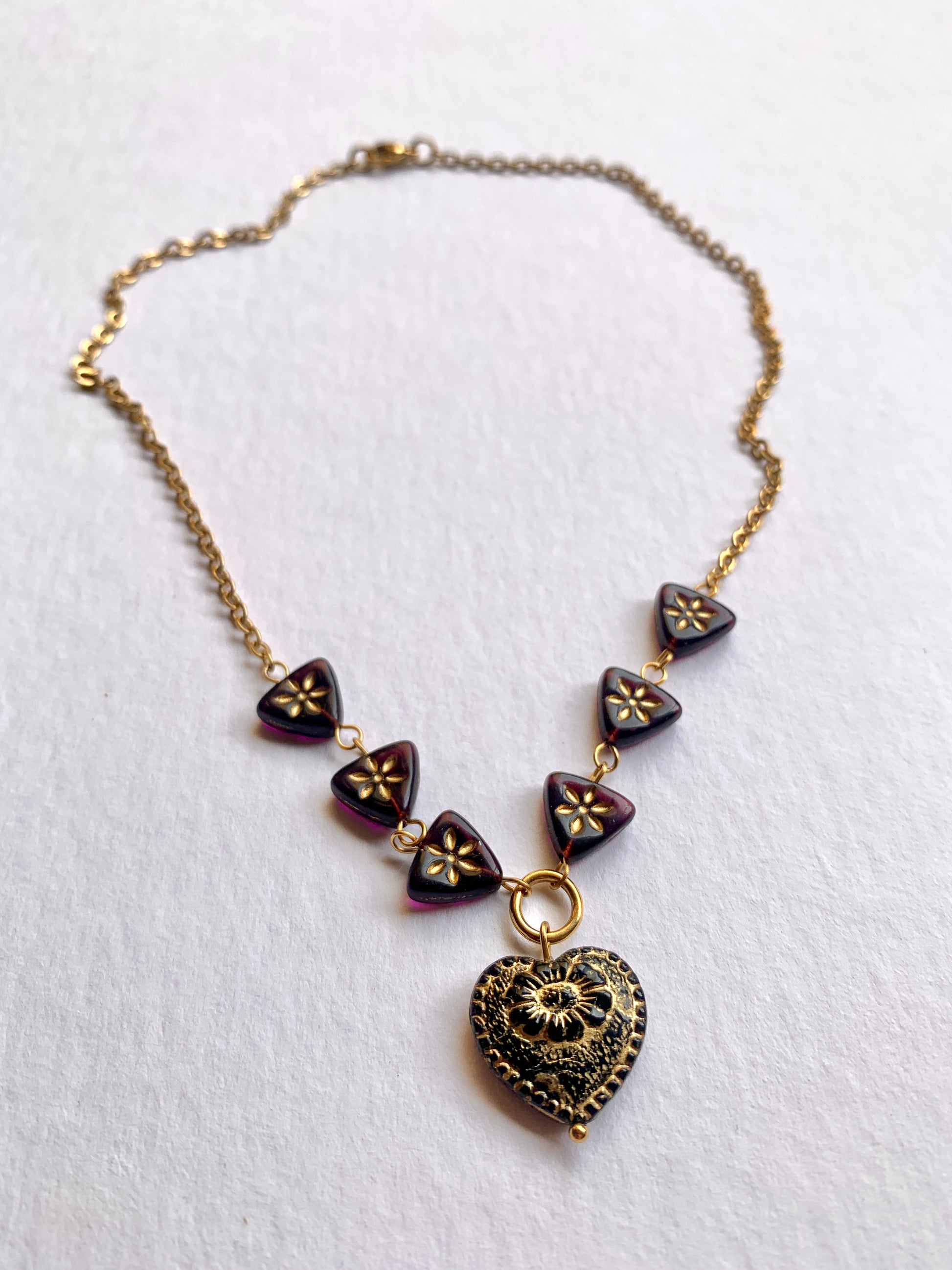 Cœur Baroque est un collier pensé comme une relique précieuse, façonné en perles de verre et illuminé de petites fleurs dorées qui semblent figées dans le temps.