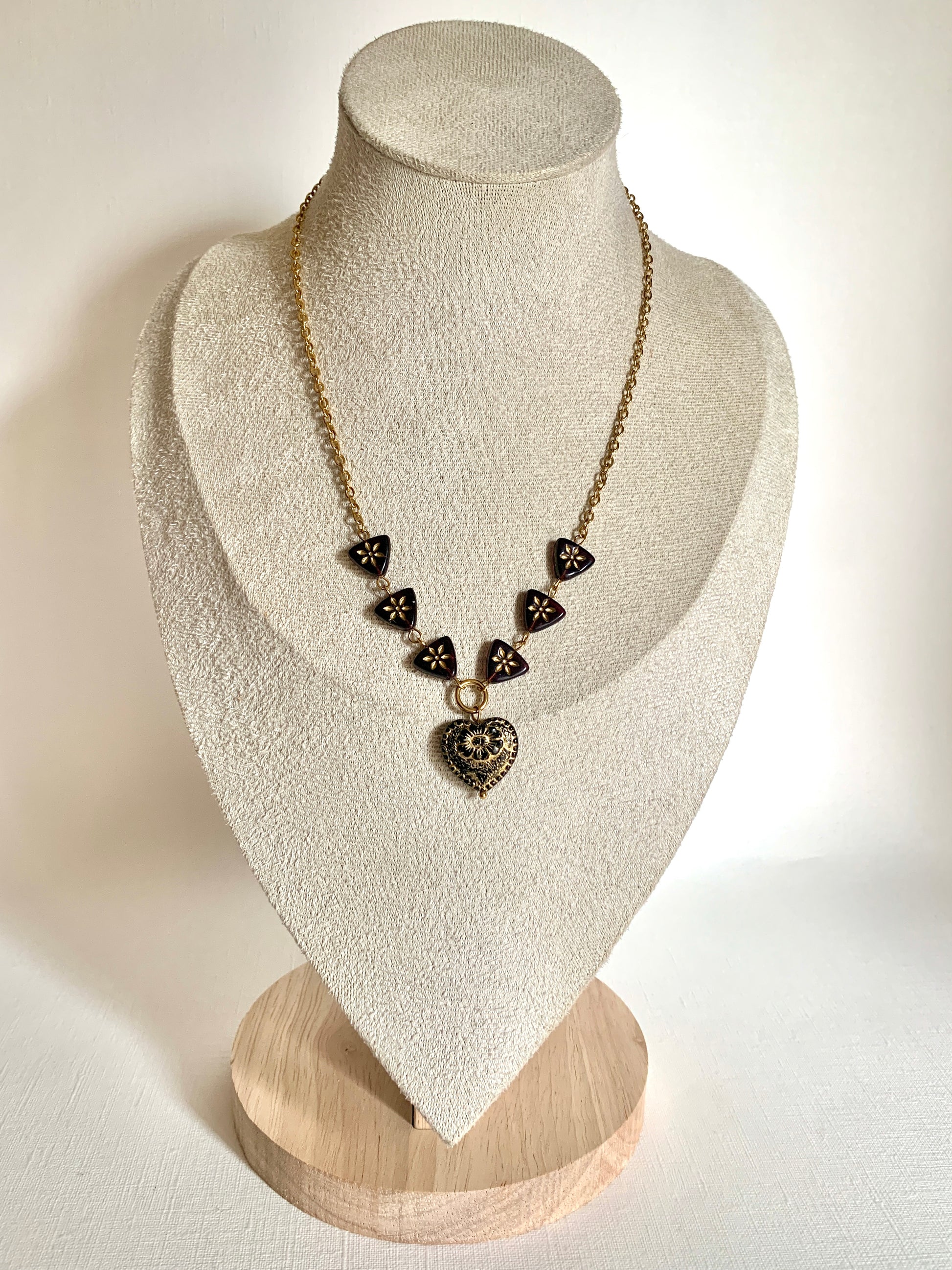 Chaque triangle noir orné de pétales dorés évoque un jardin secret, un éclat noble et délicat qui guide le regard vers le pendentif en forme de cœur, travaillé comme une miniature baroque.
