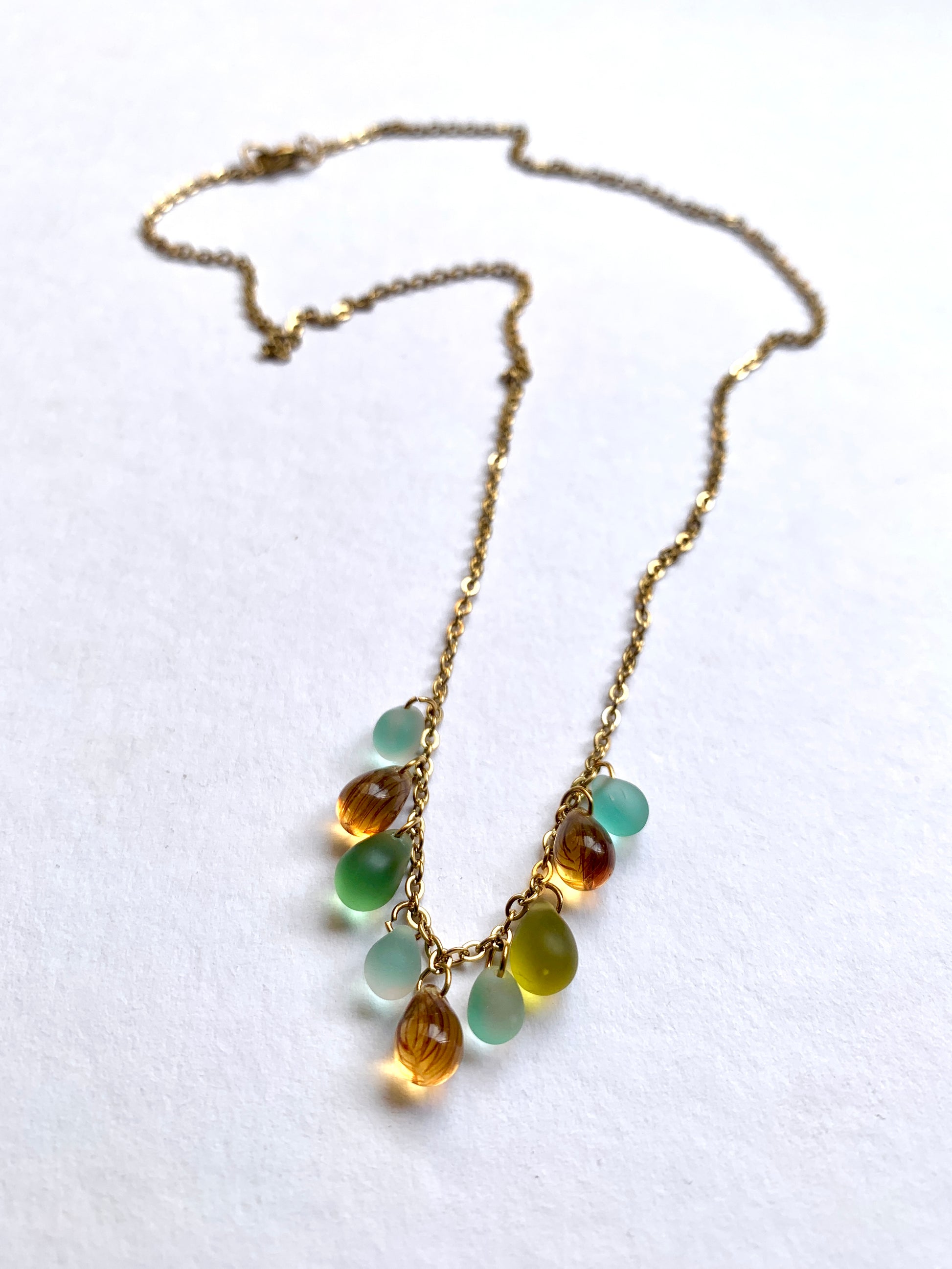 Perles de verre montées sur une chaine en acier inoxydable.