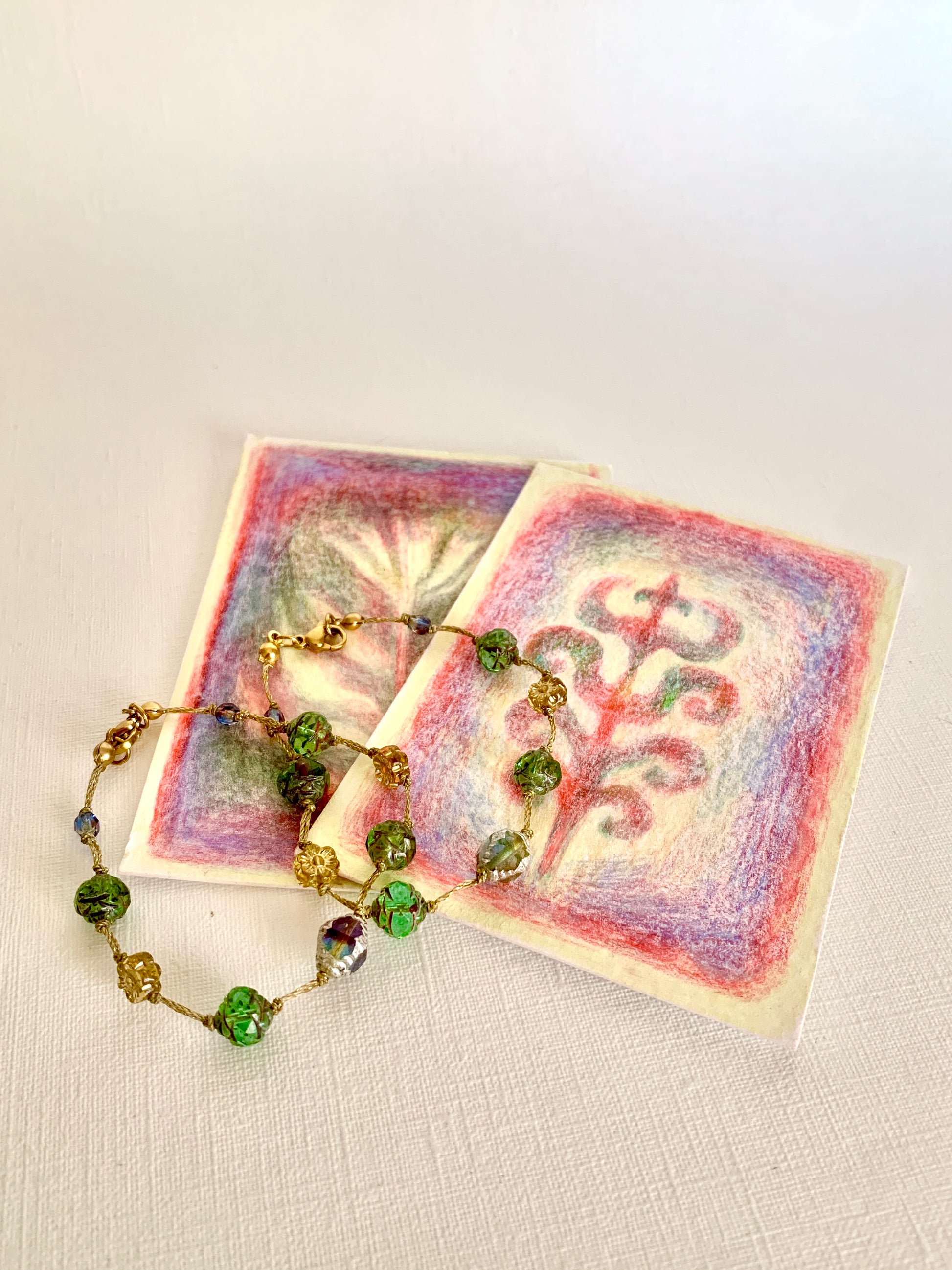 De même, certaines perles de verre dorées sont délicatement teintées : avec le temps, un contact répété avec l’eau peut estomper leur finition dorée.