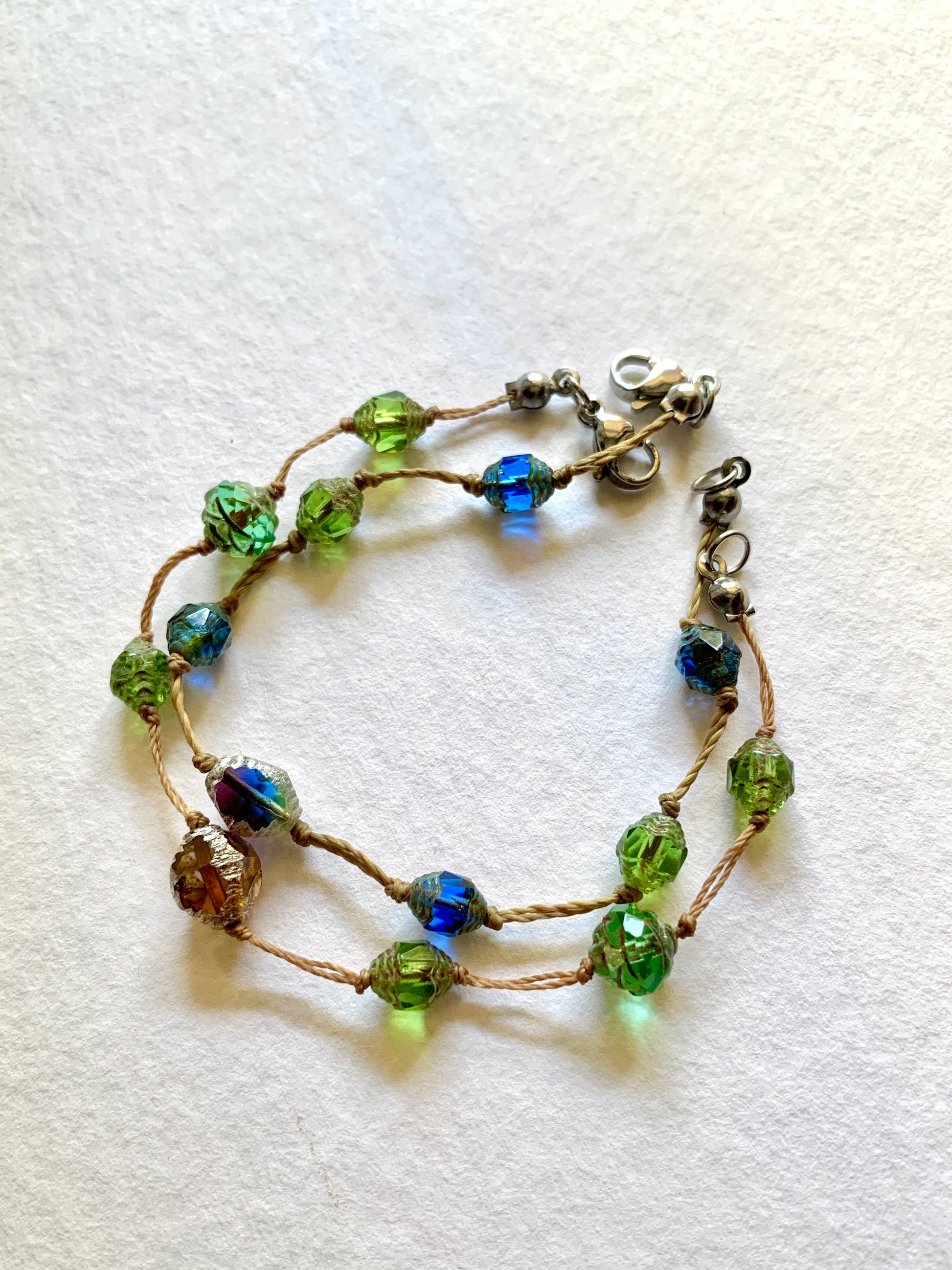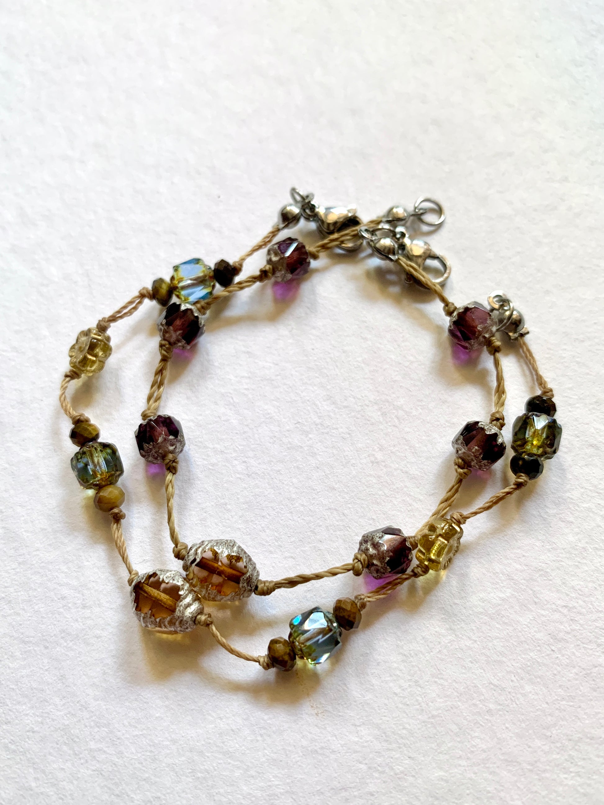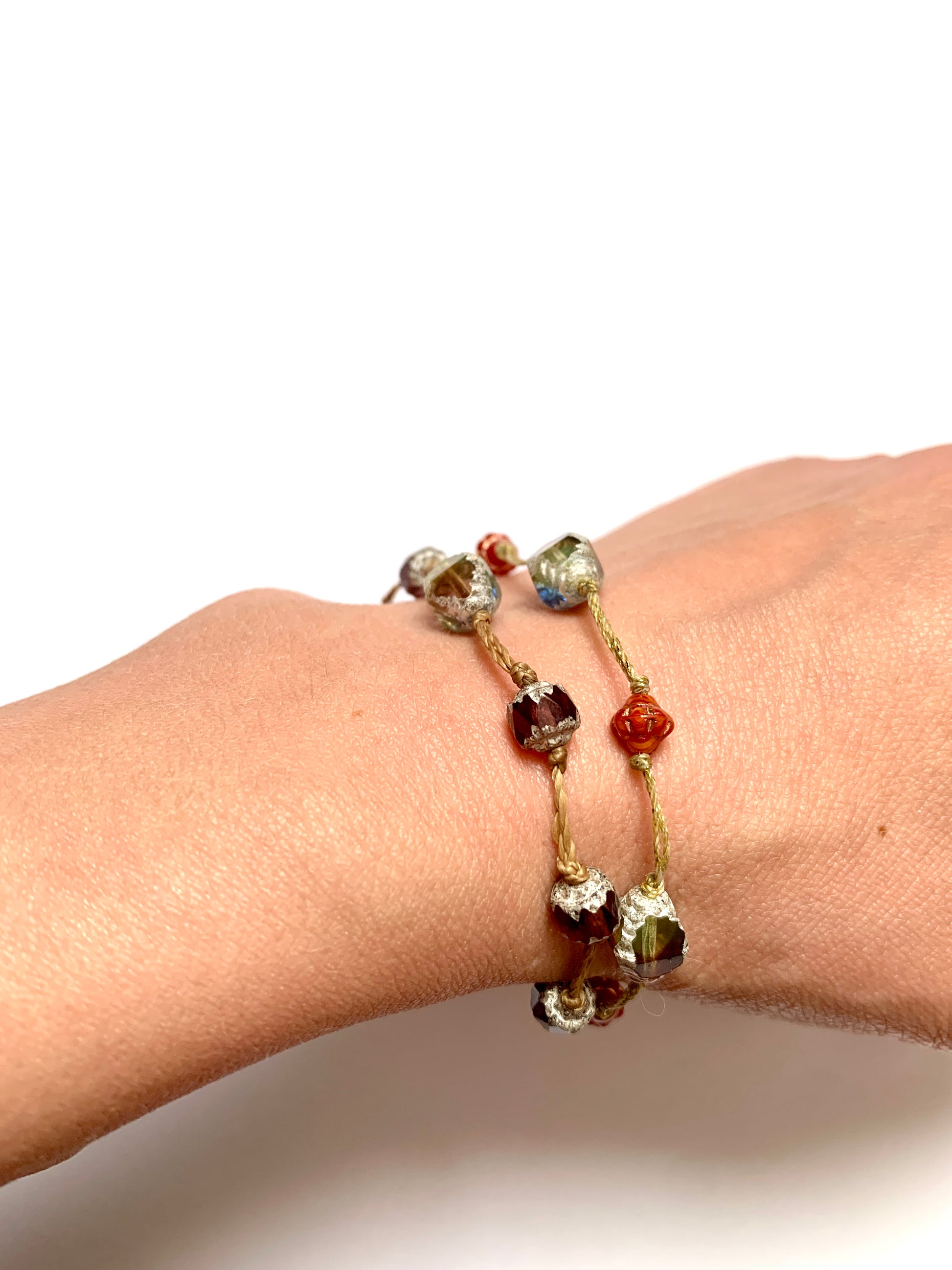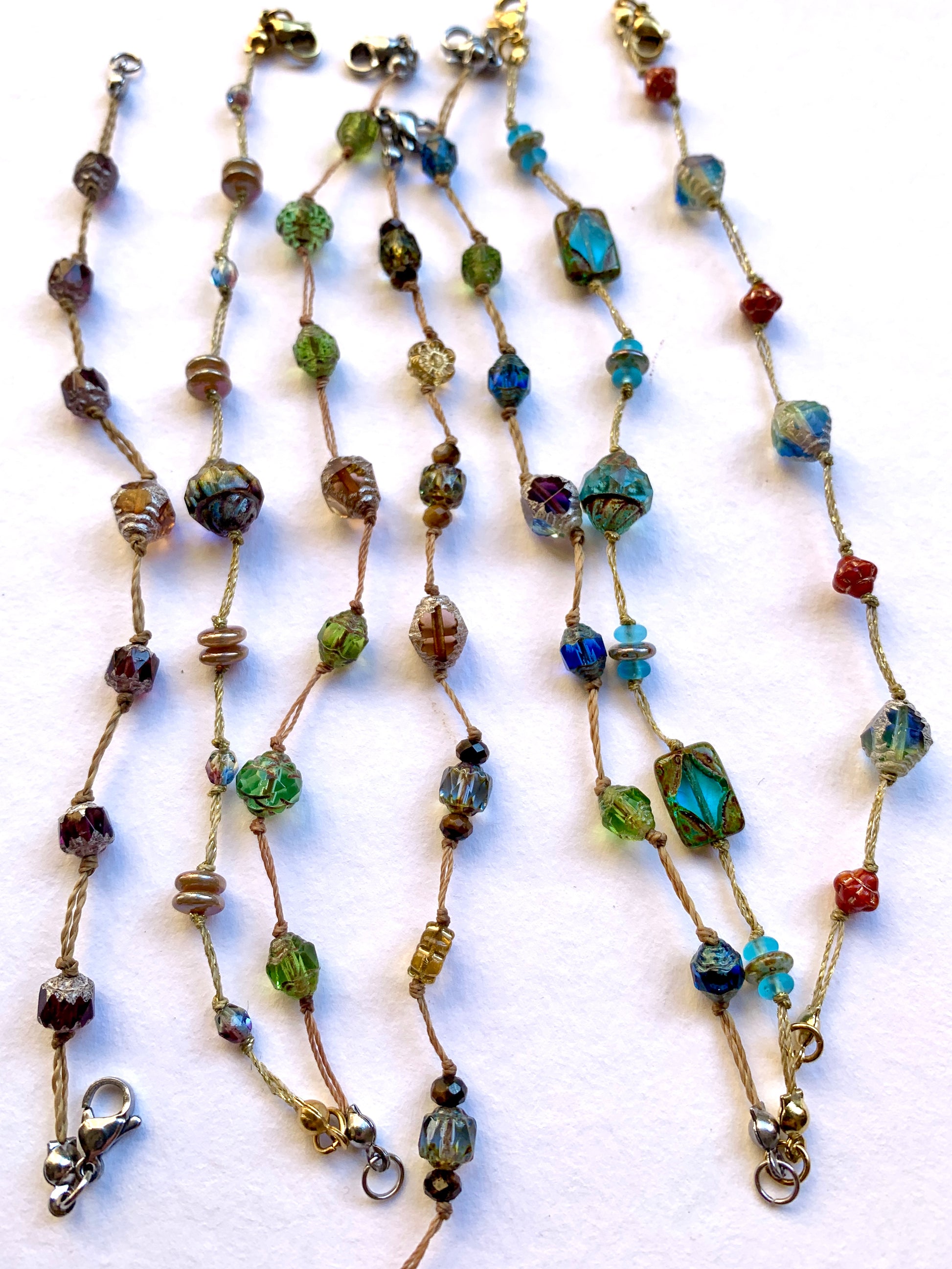 Perles de verre Tchèque montées sur une corde cirée résistante.