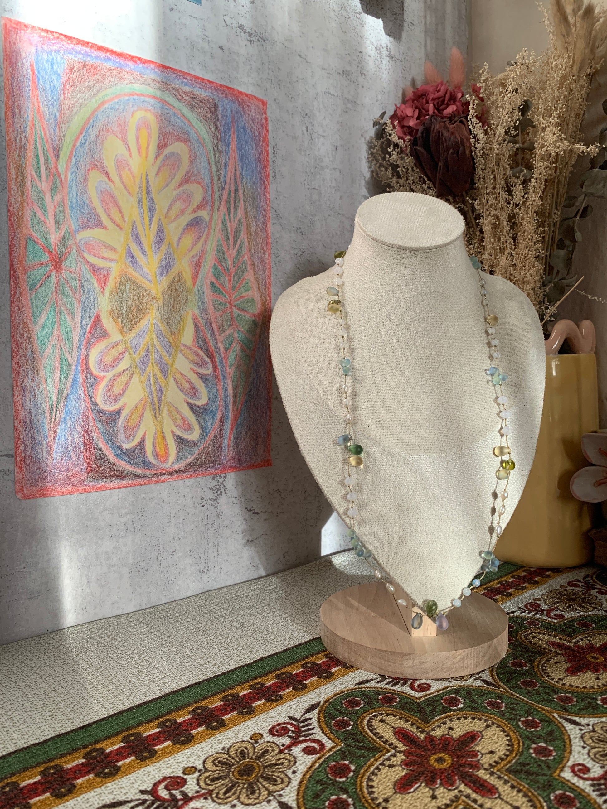Le collier Rosée Marine capture la délicatesse des gouttes salées qui se déposent à l’aube sur les fleurs des rivages. Ses perles de verre aux reflets bleus, verts et laiteux évoquent des pétales translucides, comme suspendus entre ciel et mer.