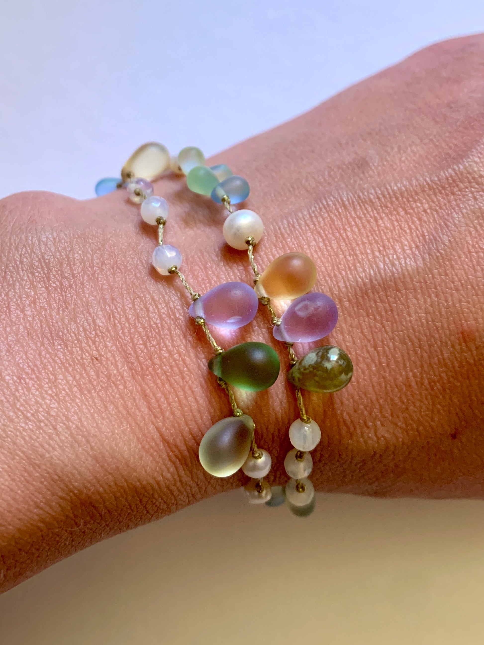 Perles de verre Tchèque montées sur une corde cirée résistante.