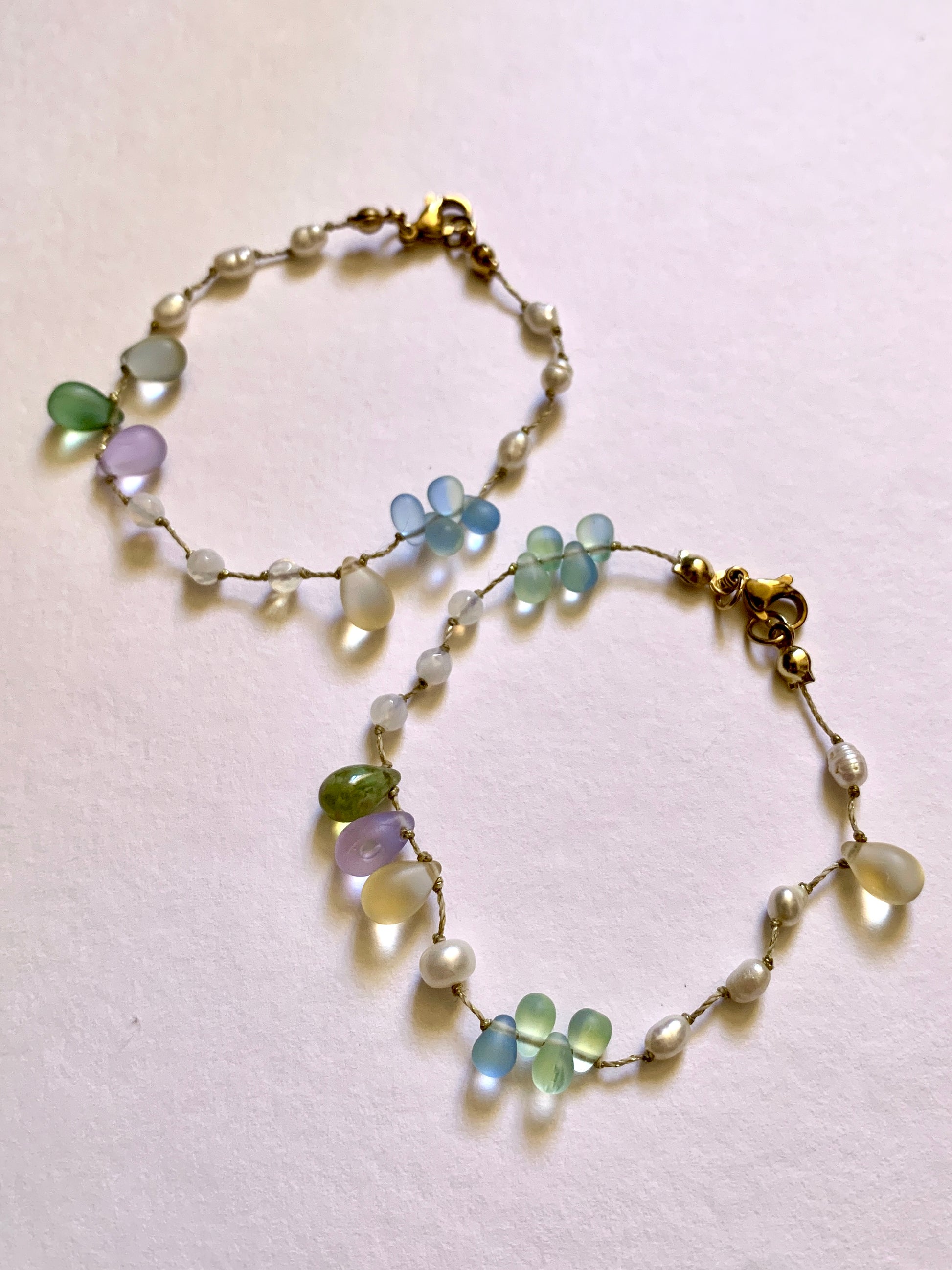 De même, certaines perles de verre dorées sont délicatement teintées : avec le temps, un contact répété avec l’eau peut estomper leur finition dorée.