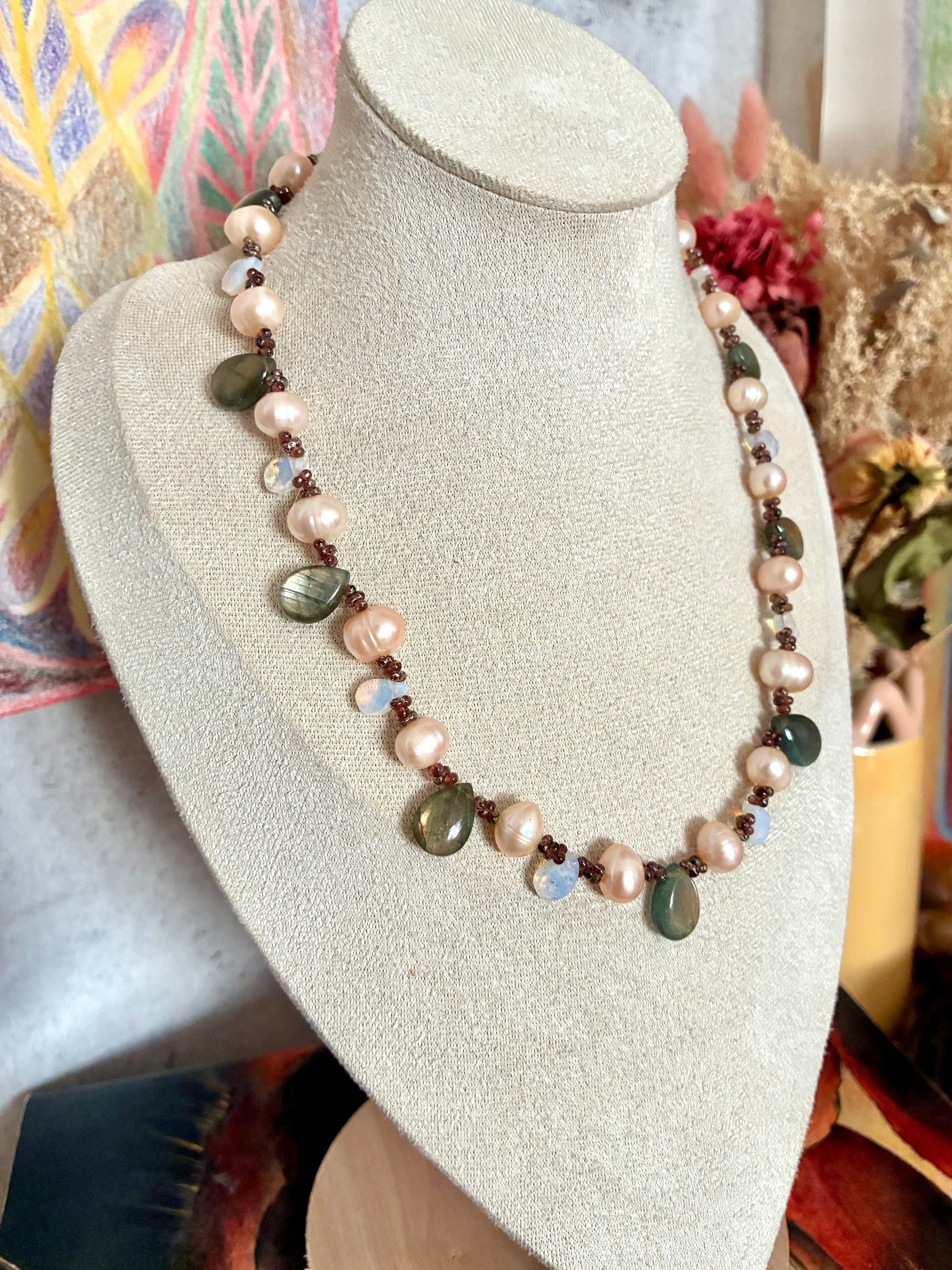 Perles de verre, véritables perles de culture vintage, Opalite et Labradorite.