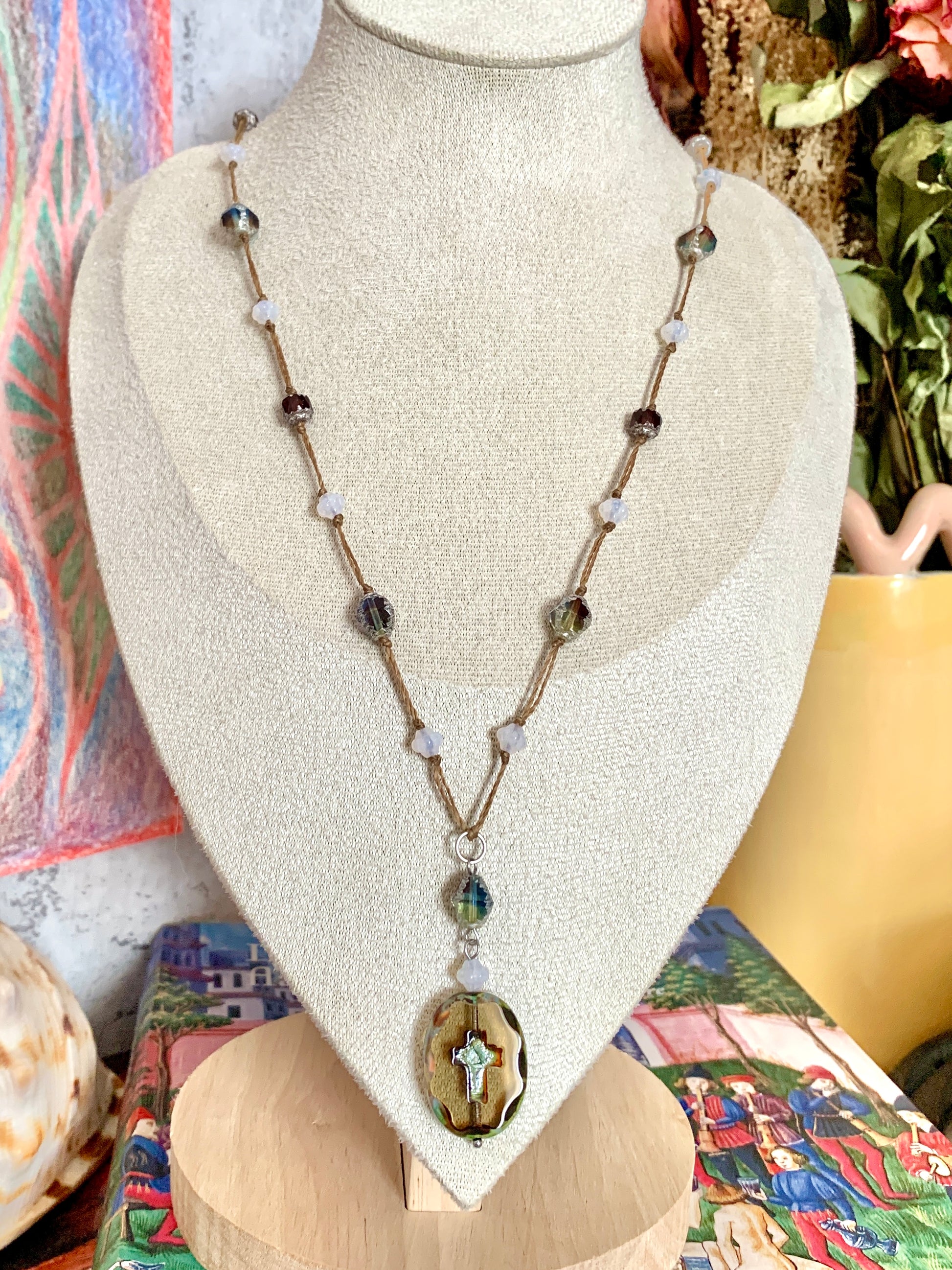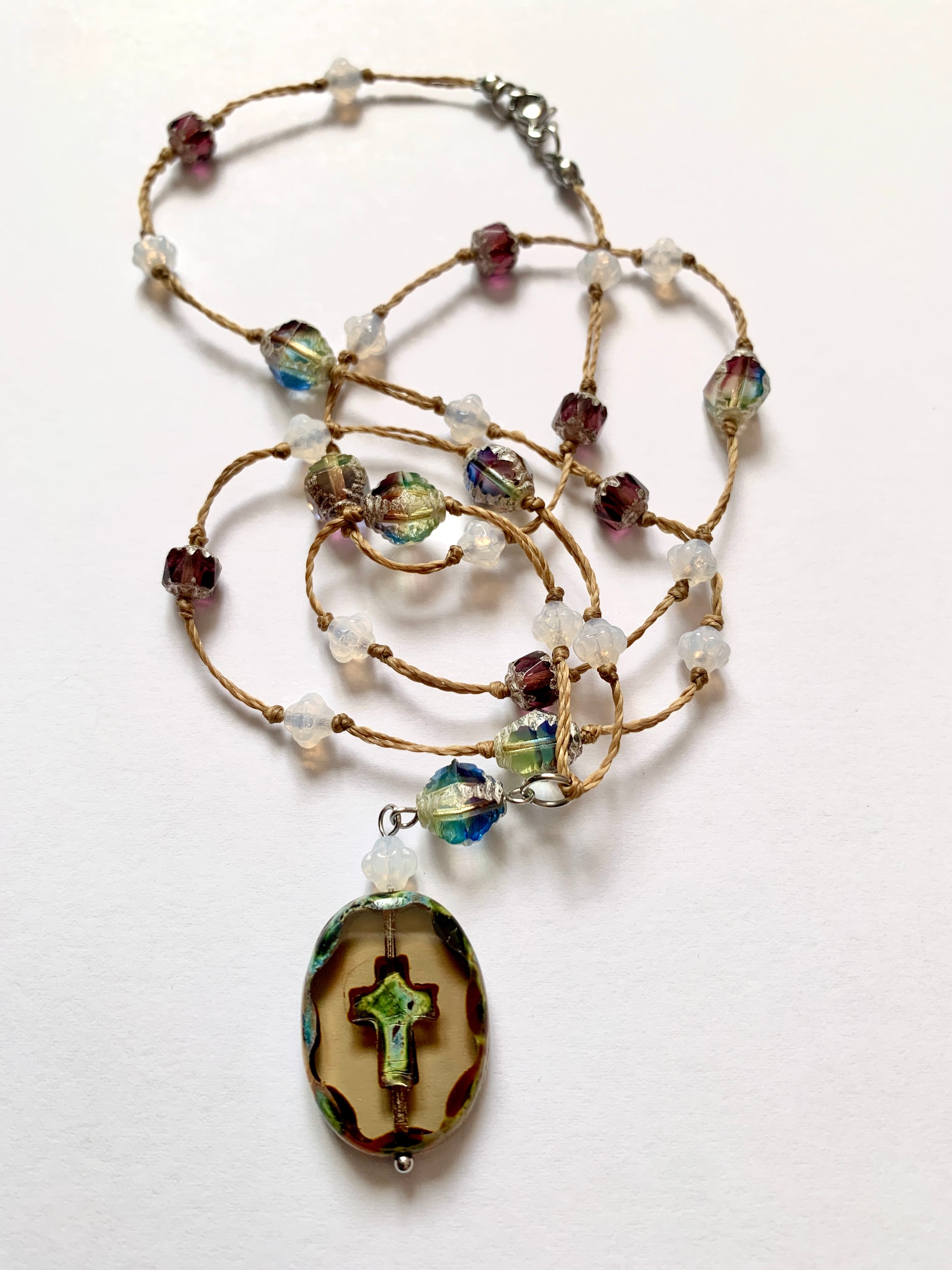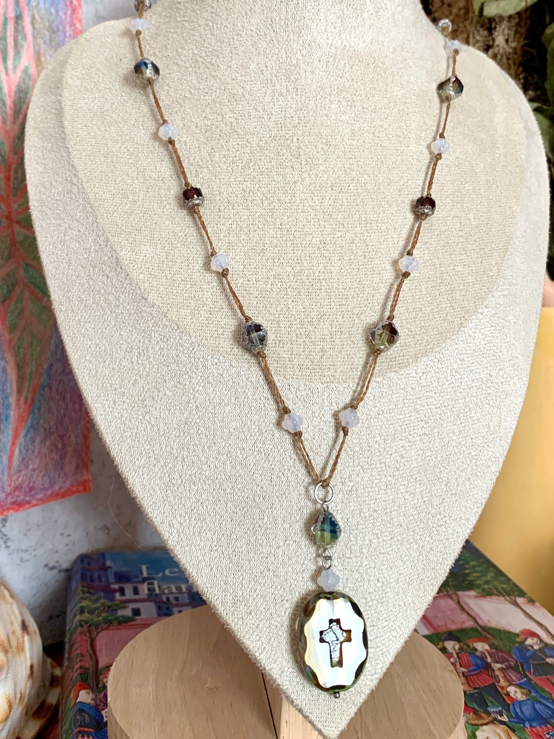 Au cœur de ce collier, une croix lumineuse s’élève comme un talisman. Autour d’elle, les perles de verre colorées scintillent telles de petites lanternes suspendues, offrant au bijou une aura mystique et protectrice.