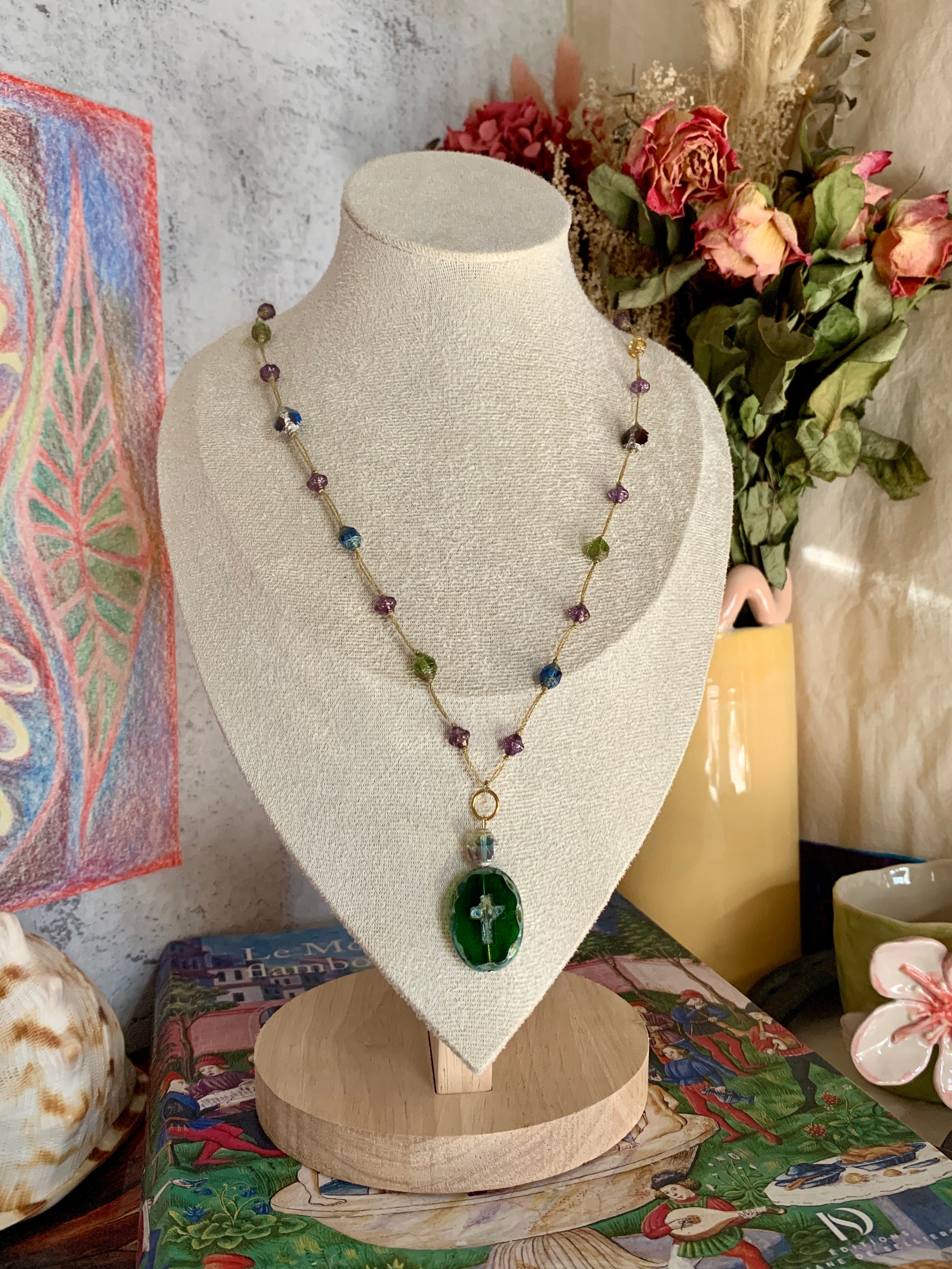 Ce sautoir unique allie la force symbolique de la croix à la magie des perles de verre colorées. En son centre, un médaillon d’un vert profond révèle une croix lumineuse, comme gravée dans le verre, porteuse de mystère et de protection. Autour, les perles aux reflets violets, bleus et verts dansent comme des éclats de vitrail, rappelant les lueurs changeantes des chapelles anciennes baignées de lumière. Croix Enchantée est plus qu’un bijou : c’est une amulette poétique, un talisman bohème à porter comme une promesse de lumière intérieure.