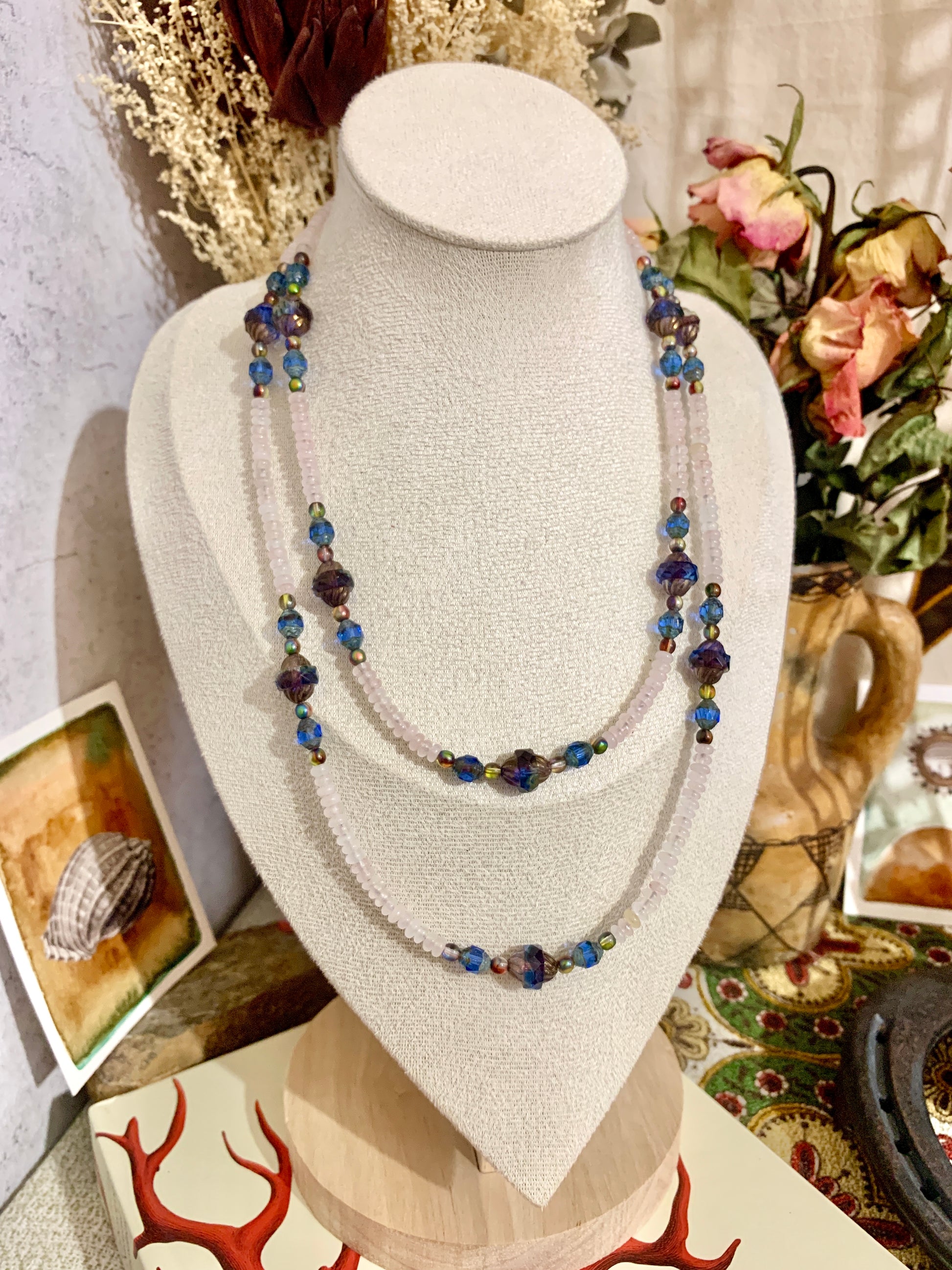 Au cœur du collier, le quartz rose : pierre de douceur et d’harmonie, diffuse son énergie apaisante. On dit qu’il ouvre le cœur, renforce l’amour de soi et invite à l’équilibre émotionnel.