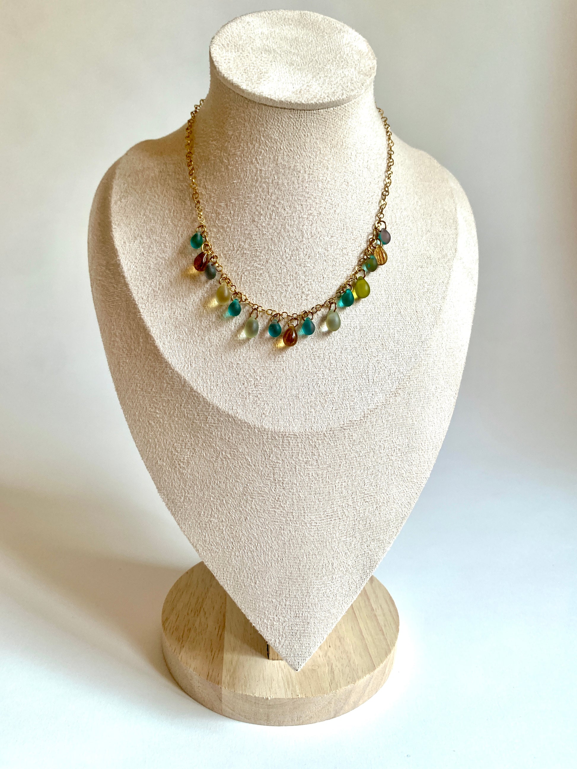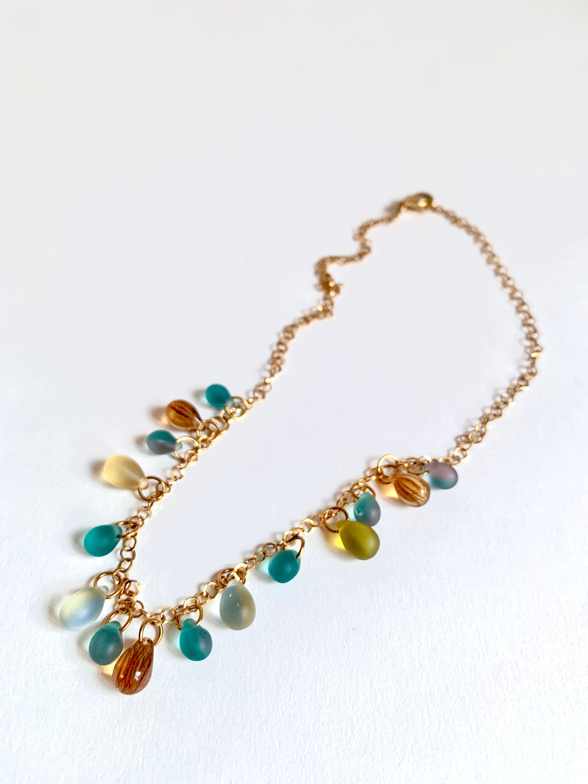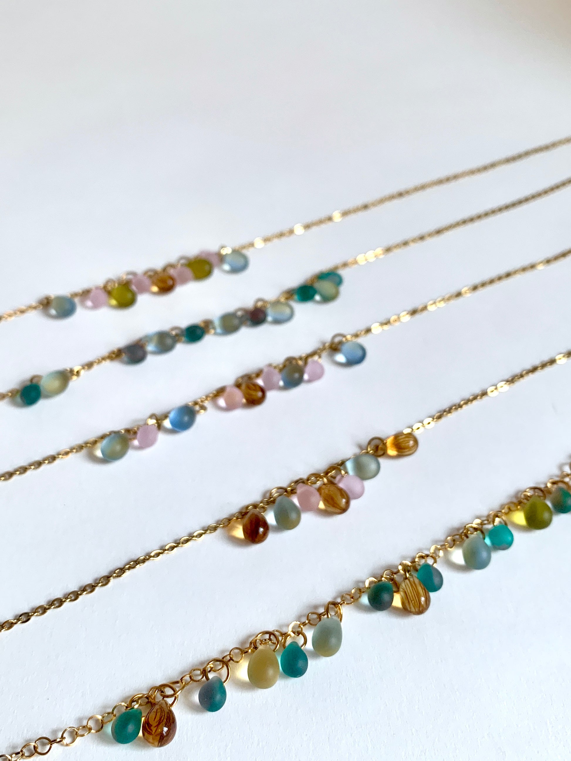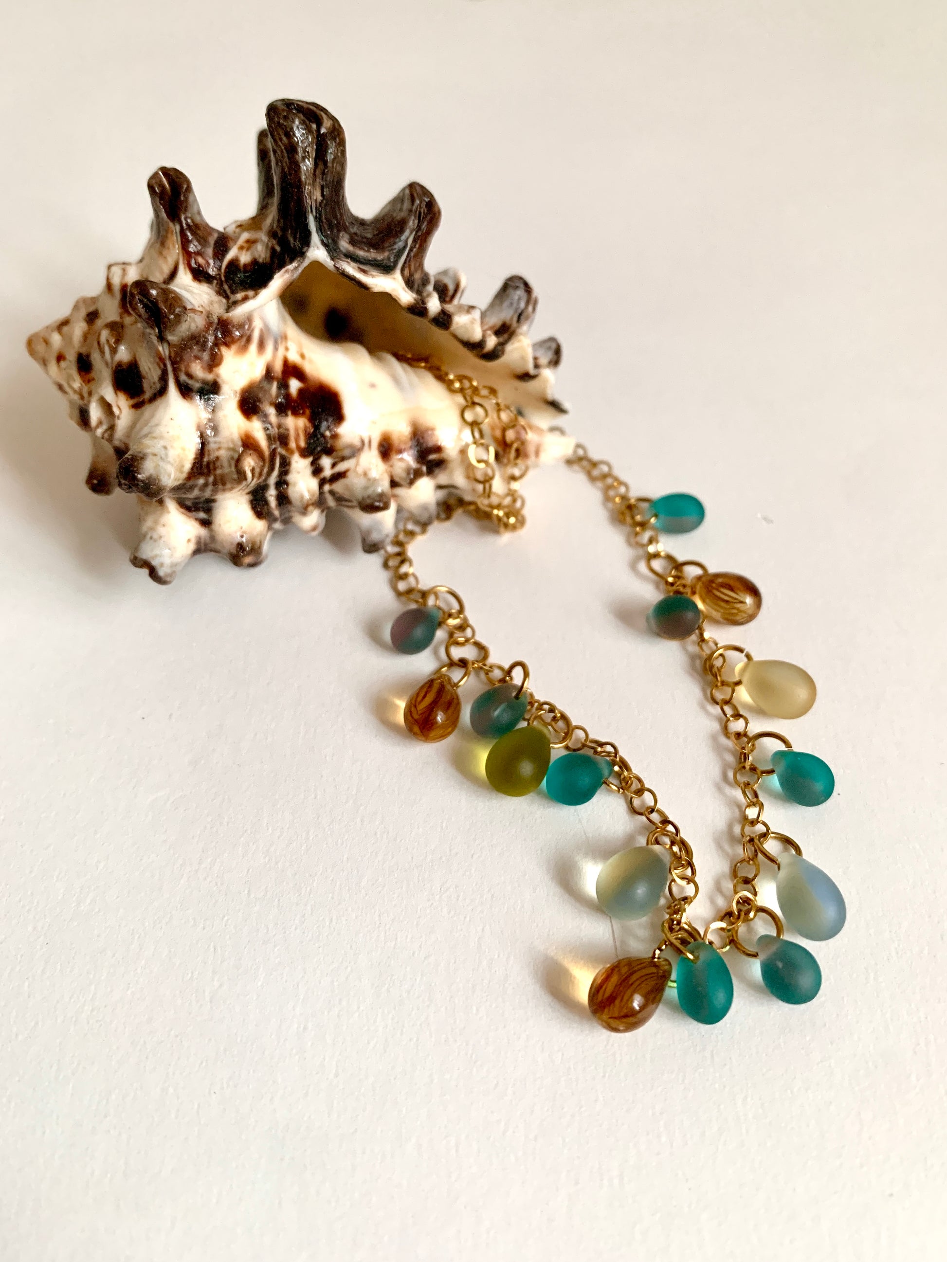 Collier doré d’embruns et de lumière, où chaque perle semble née du ressac. Des larmes d’azur, des éclats miel, des teintes douces comme un lever de soleil sur l’eau.