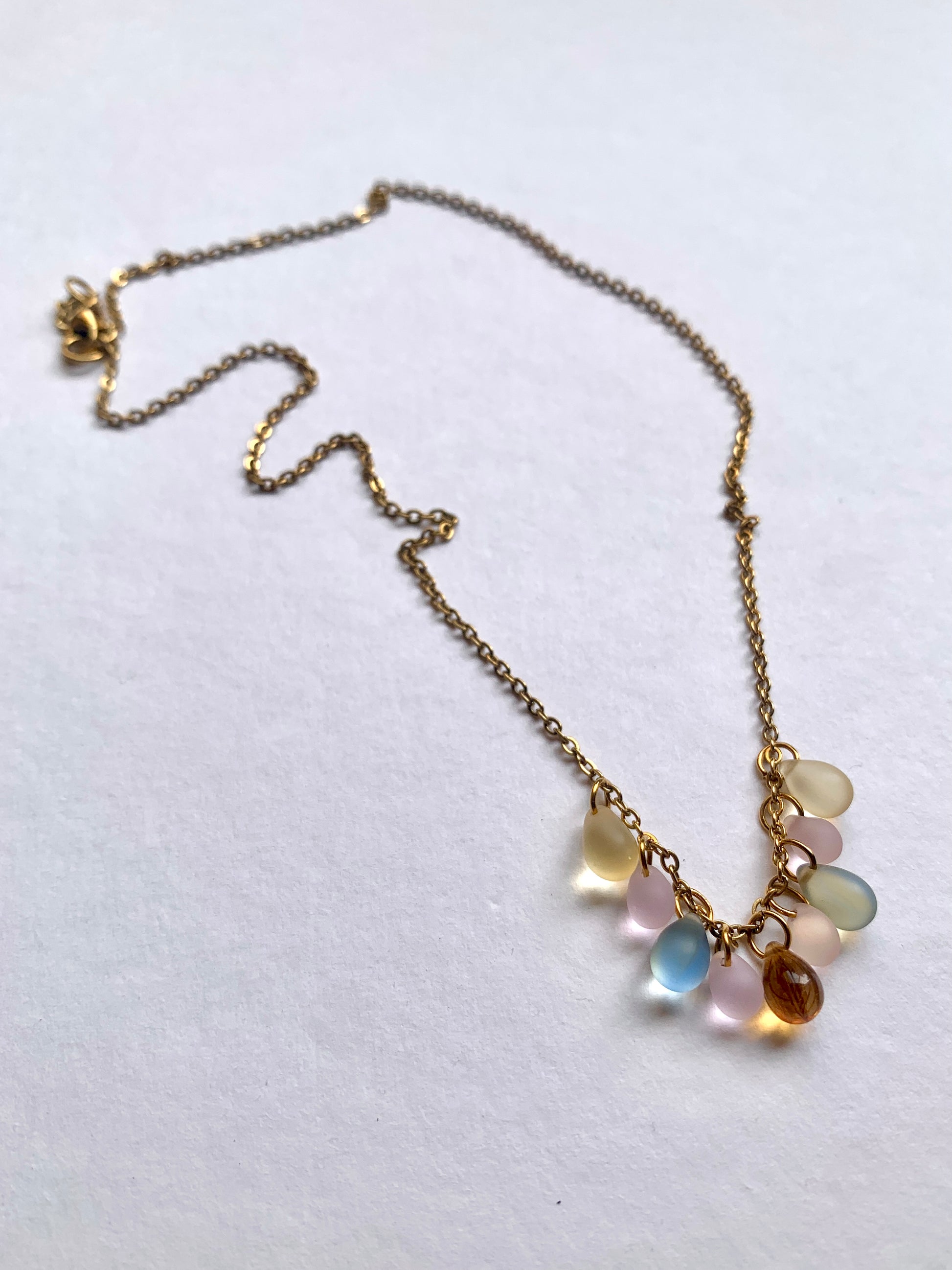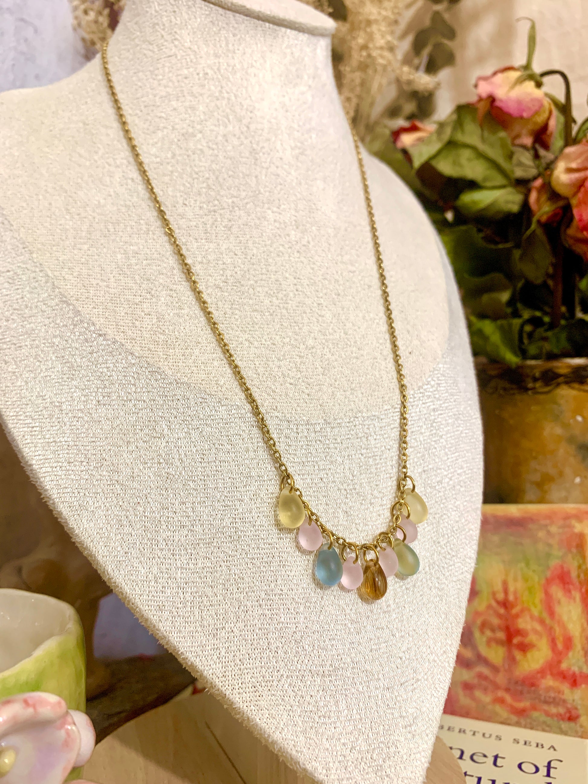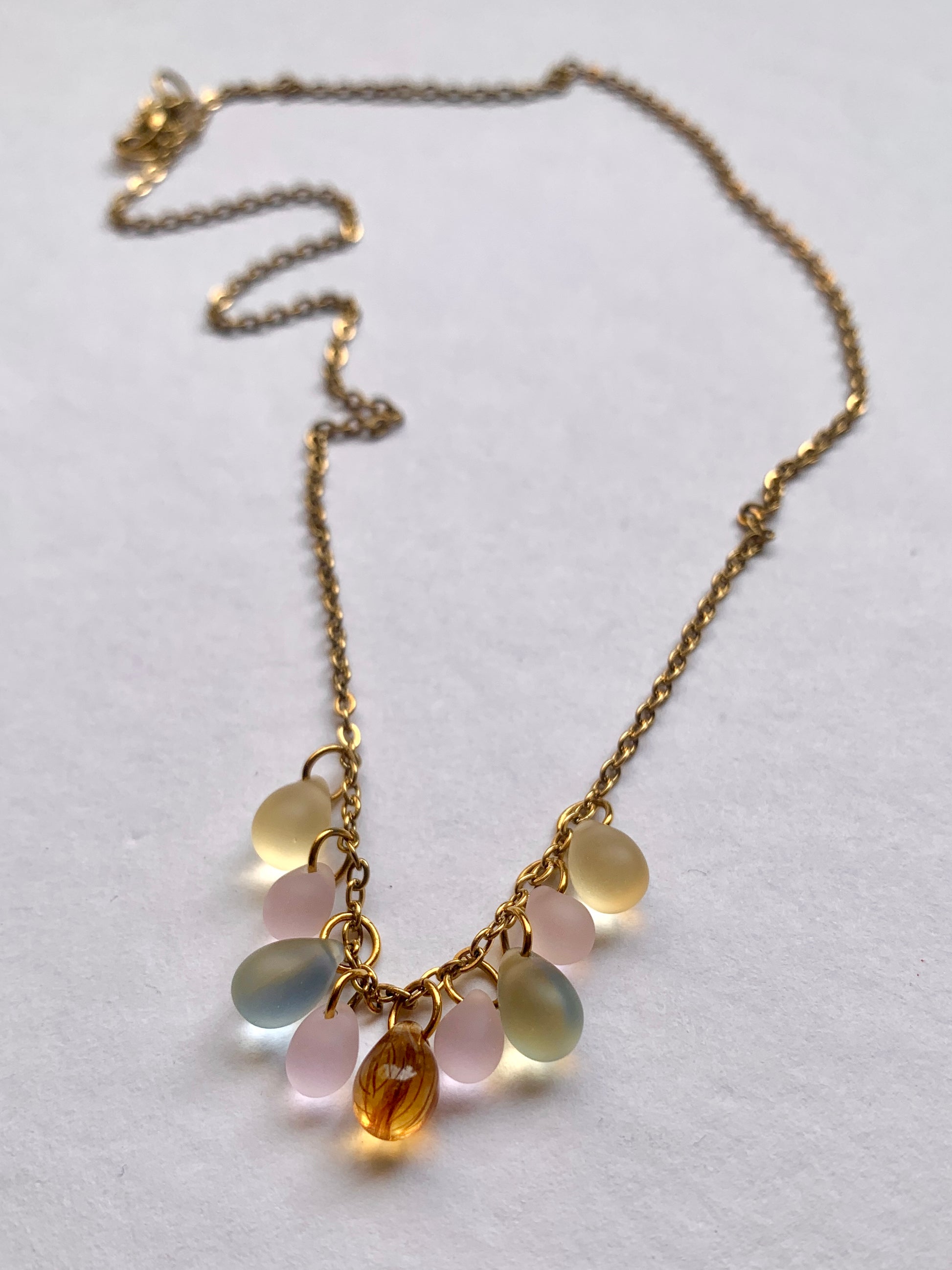 Le collier Gouttes de Grâce réunit des perles de verre aux nuances tendres : rose poudré, bleu brume et miel doré autour d’une perle ambrée centrale, éclatante comme un cœur de soleil.