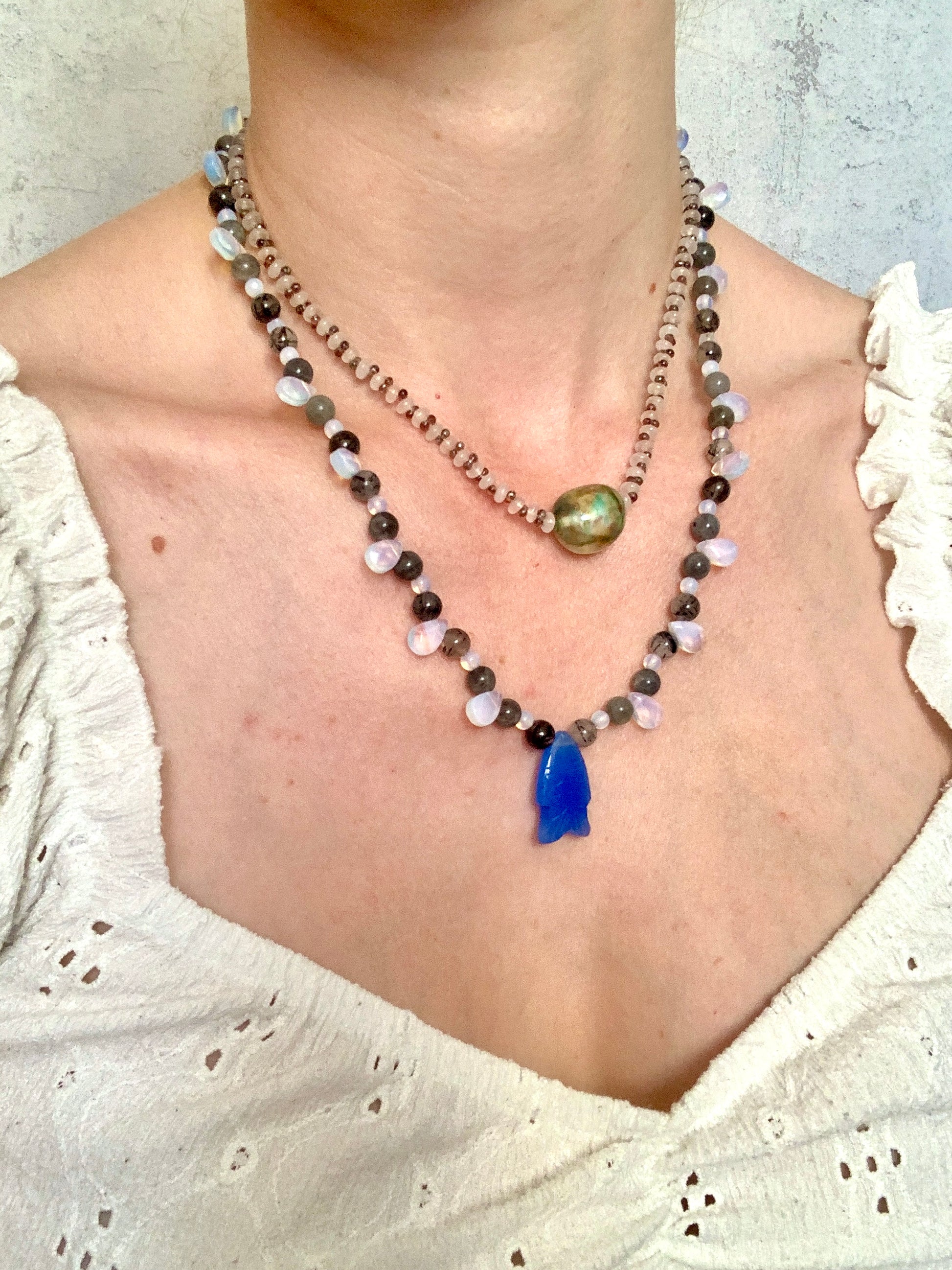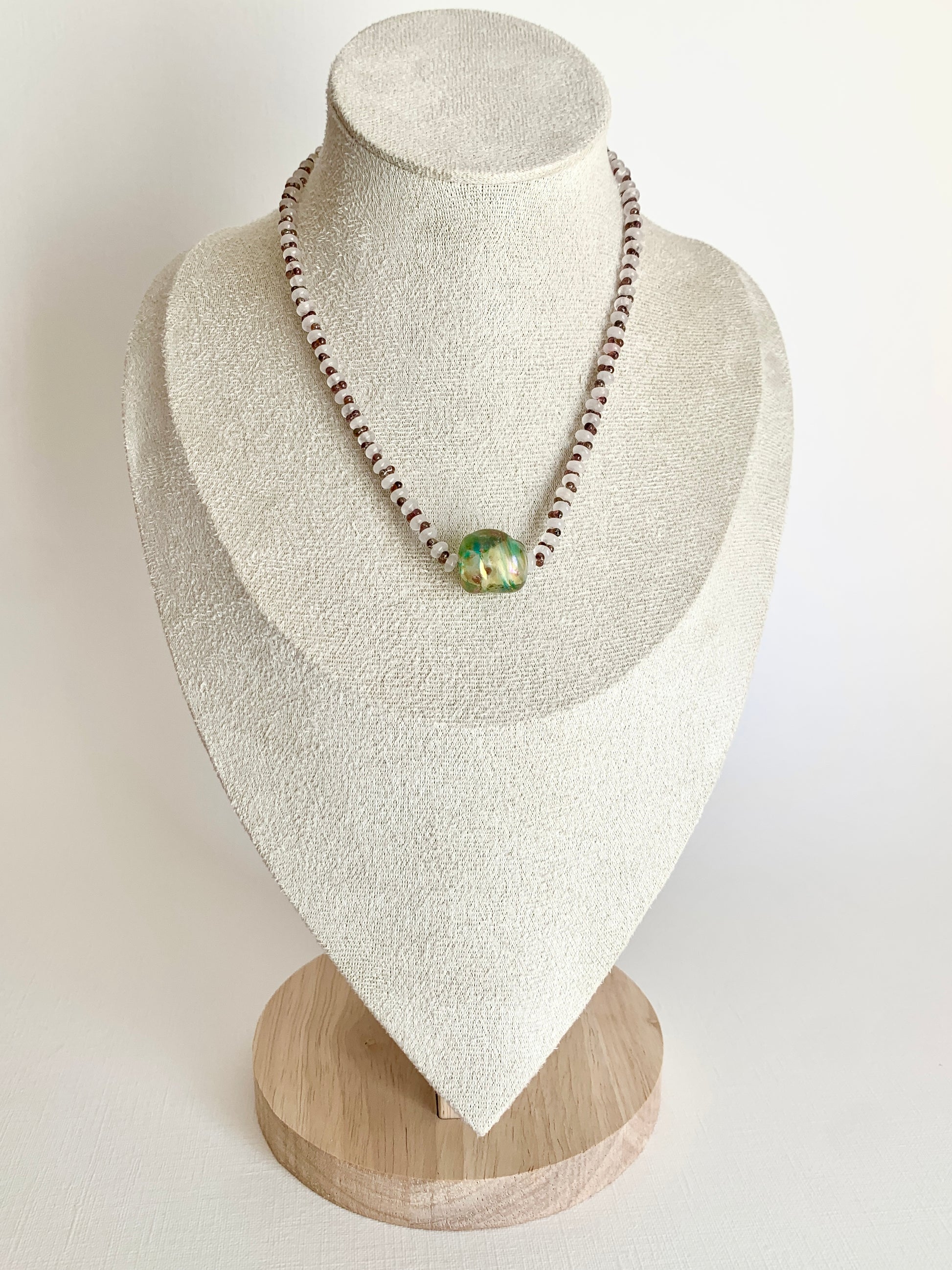 Ce ras-du-cou raffiné marie la transparence lumineuse du quartz blanc, pierre d’équilibre et de recentrage, à une perle rare de verre de Murano vintage, chinée dans un ancien collier. Cette perle verte, parsemée de reflets dorés, semble capturer un instant de lumière filtrée entre les feuillages, un fragment de jardin, figé dans le verre.