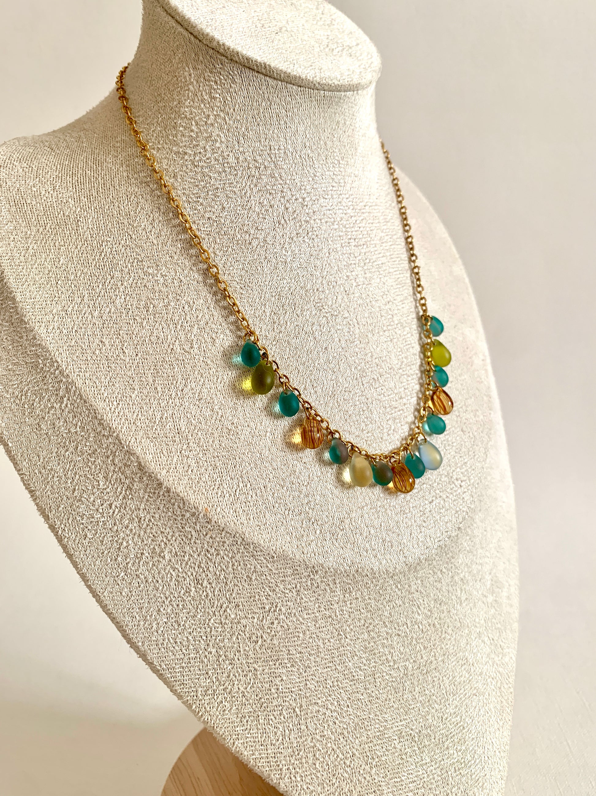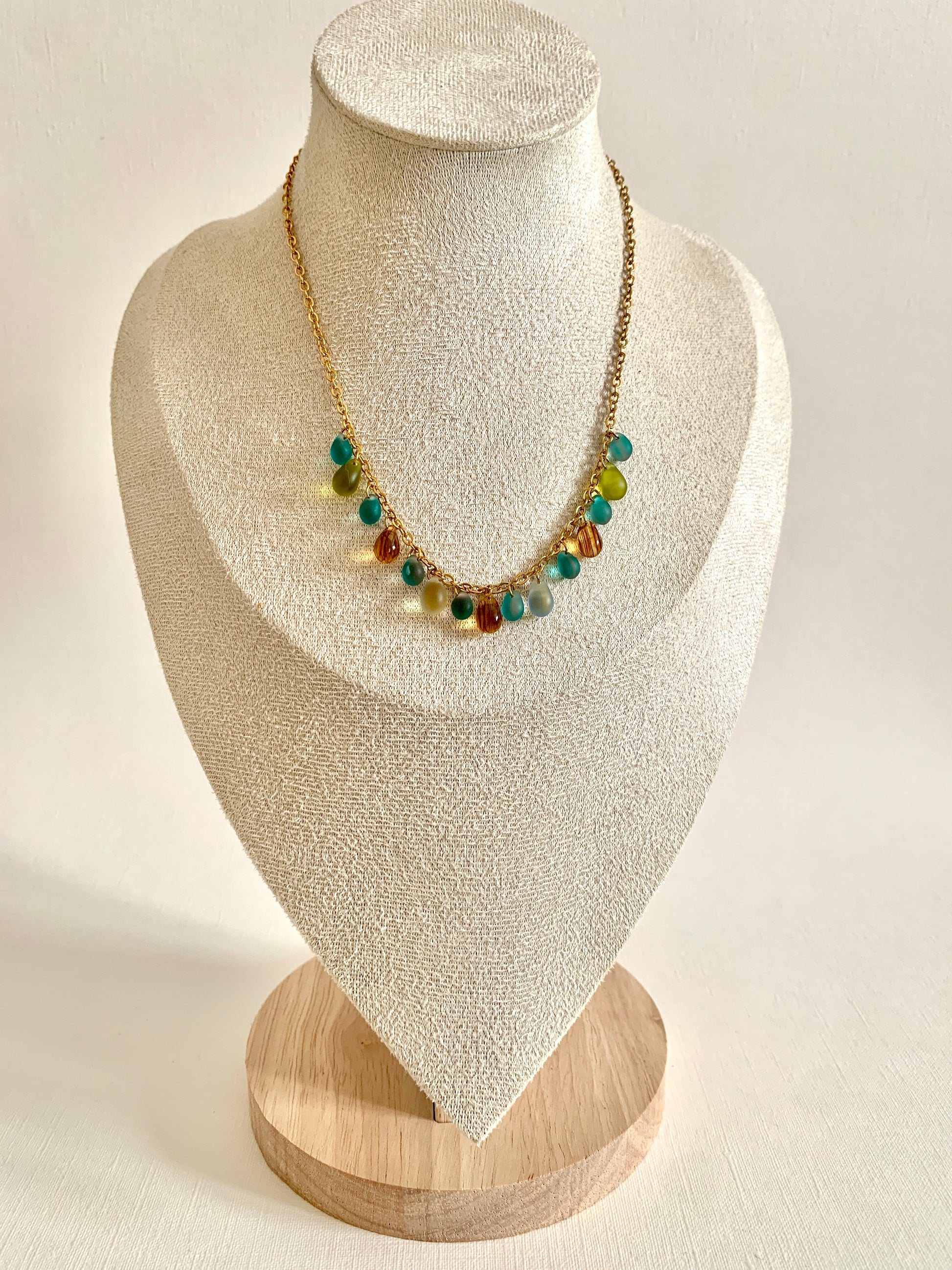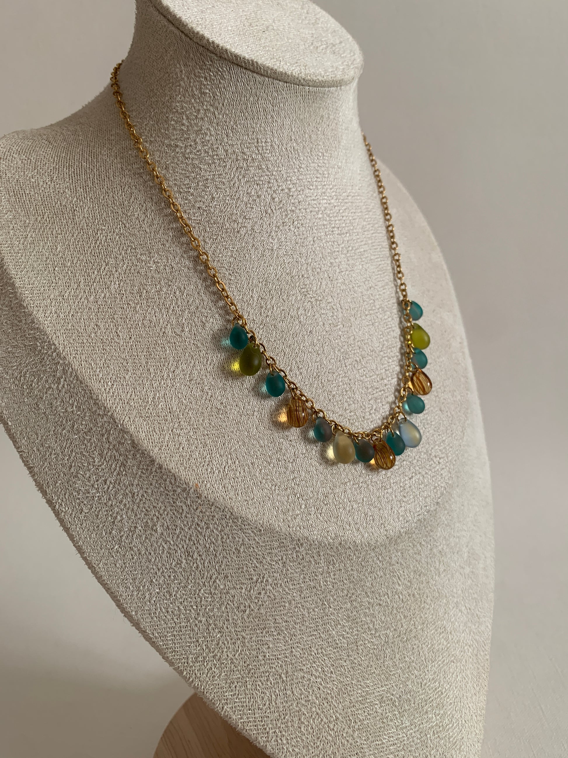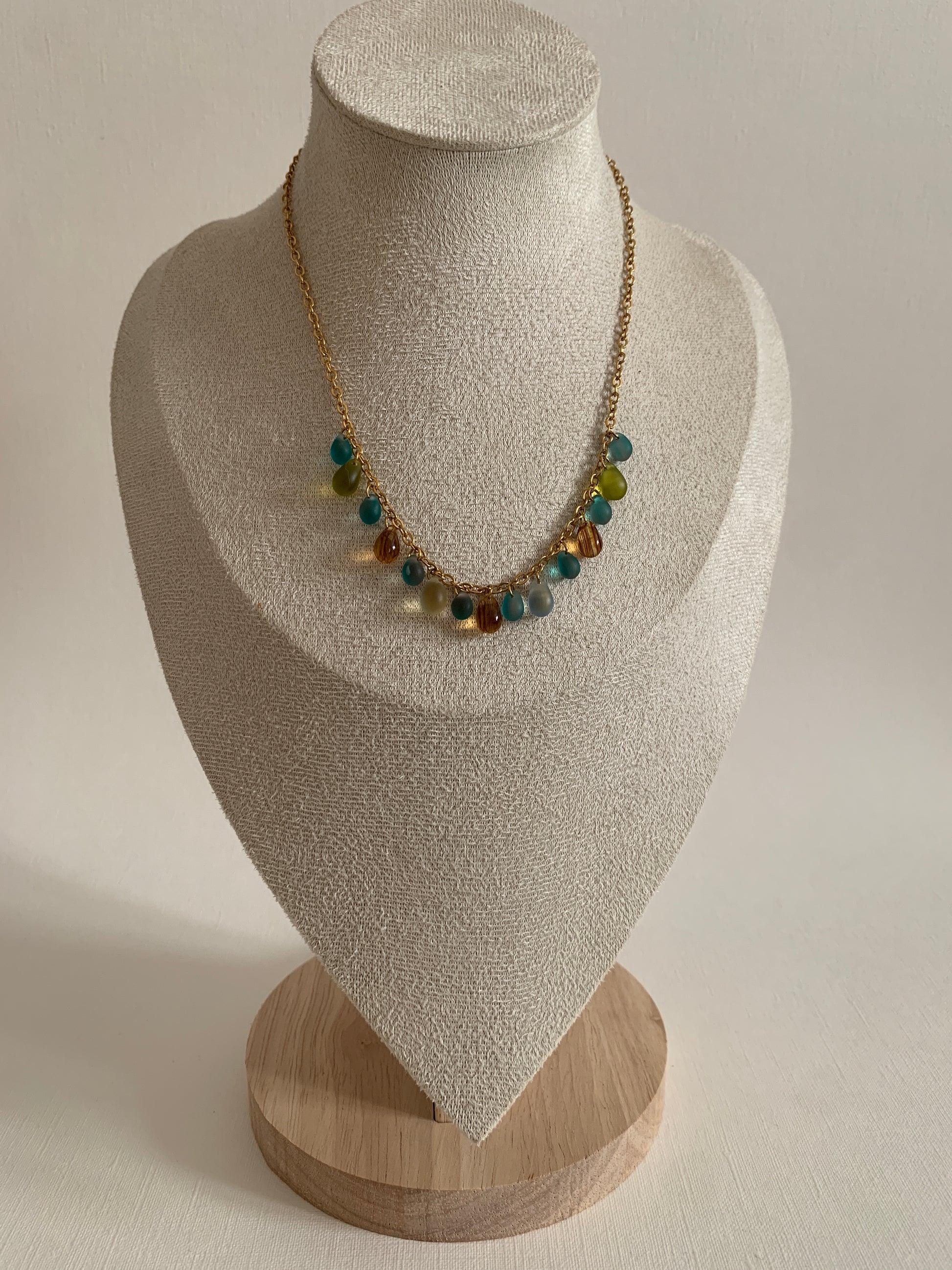 Perles de verre montées sur une chaine en acier inoxydable.