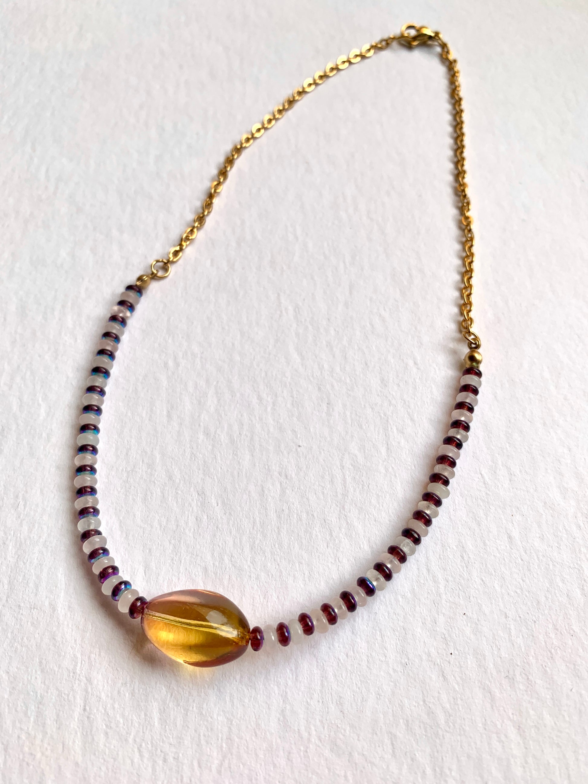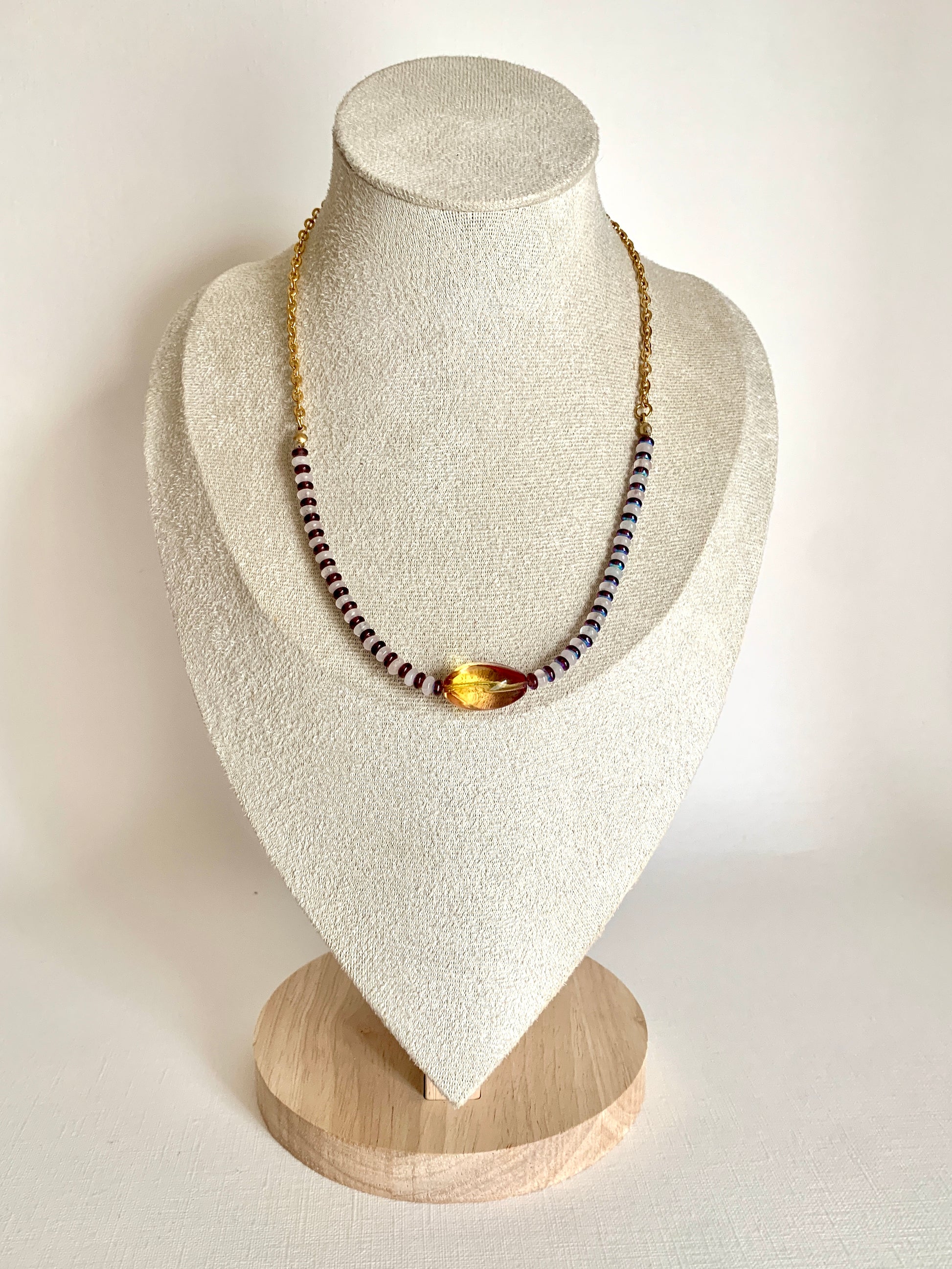 Le collier L’Heure Ambrée capte la magie de ces quelques minutes où le ciel se teinte d’or, de rose et de pourpre. Sa perle centrale, aux reflets changeants comme un couchant d’été, dialogue avec les perles de quartz blanc et de verre, dans un équilibre subtil de chaleur et de transparence.