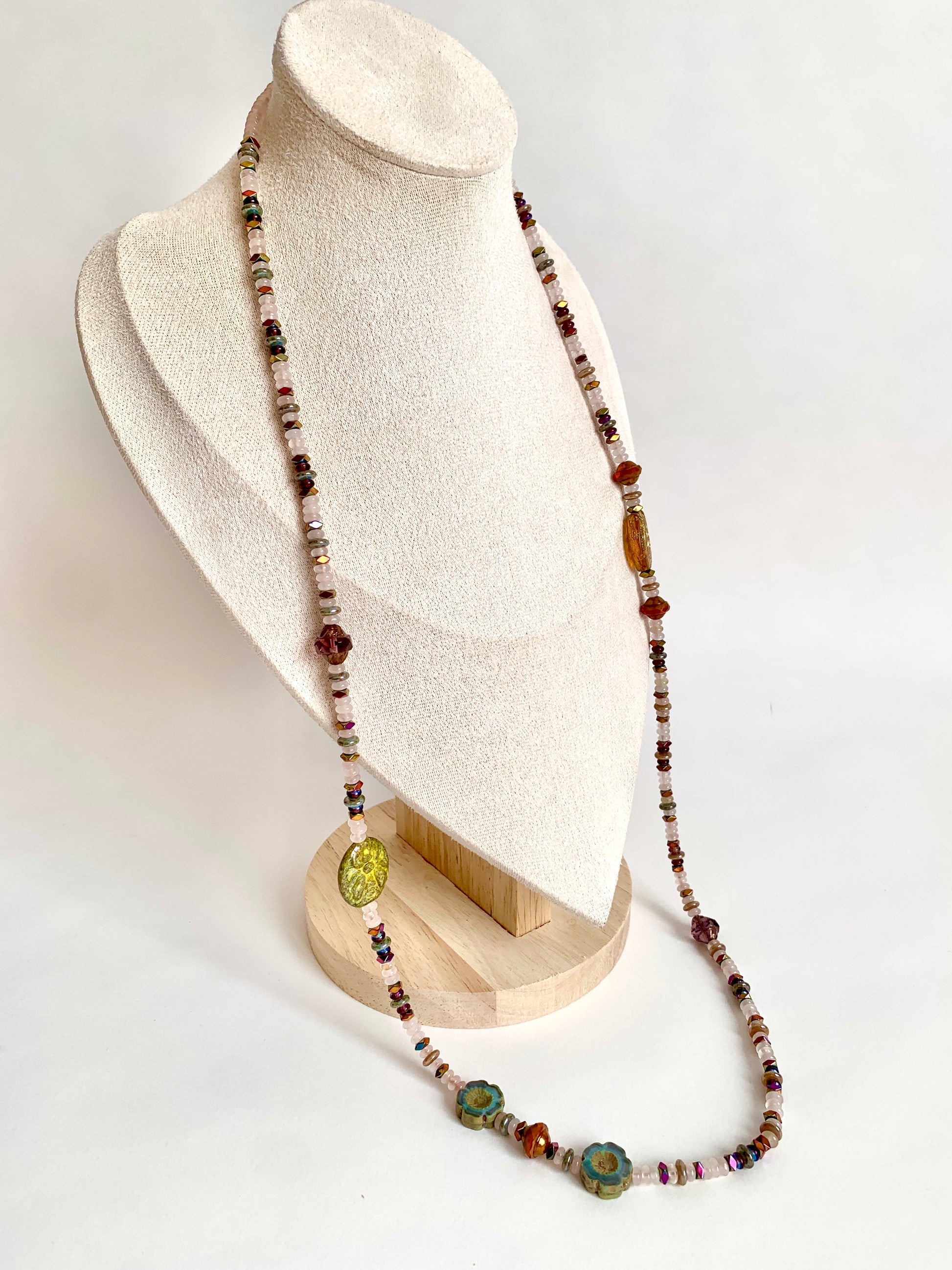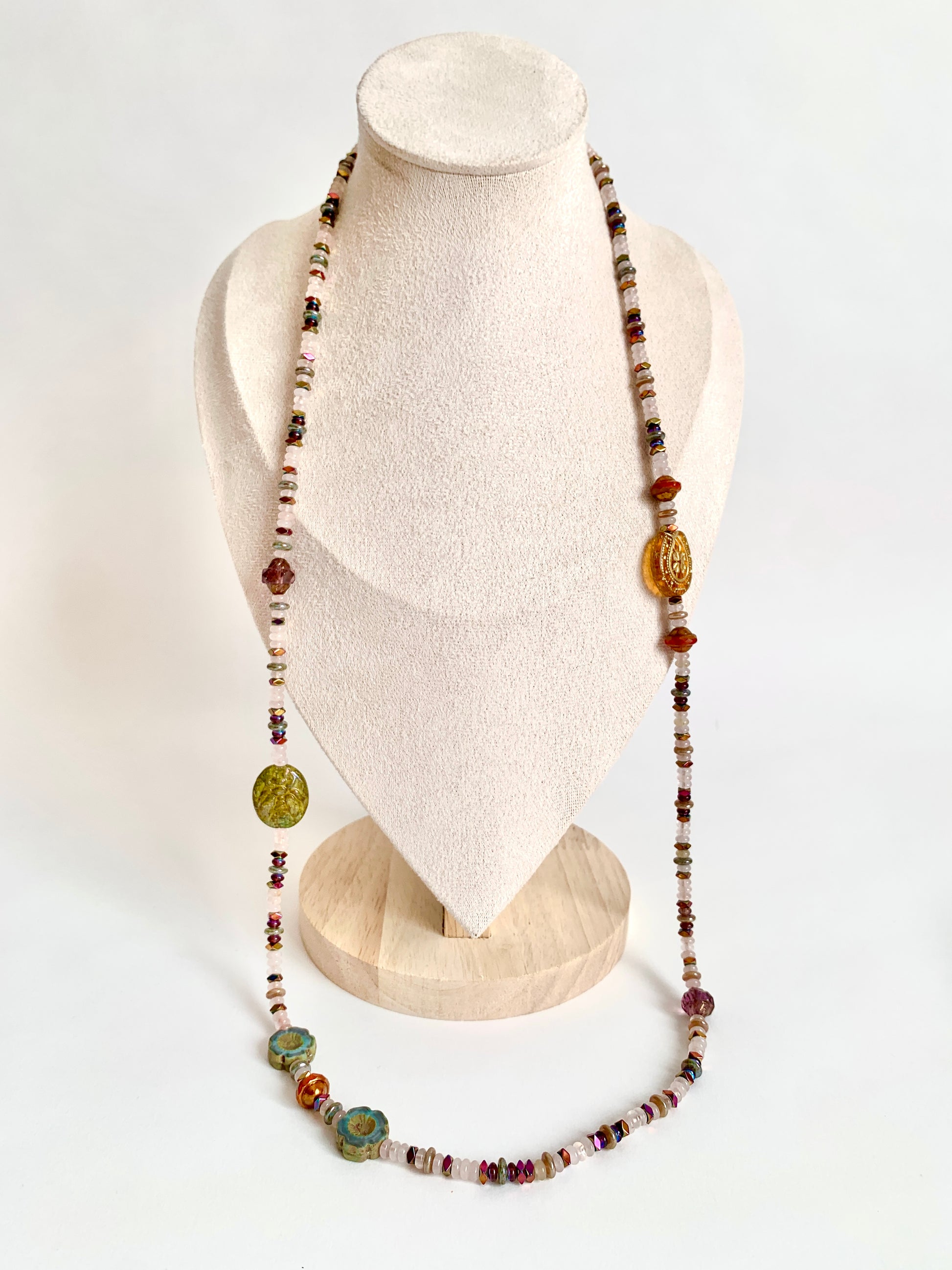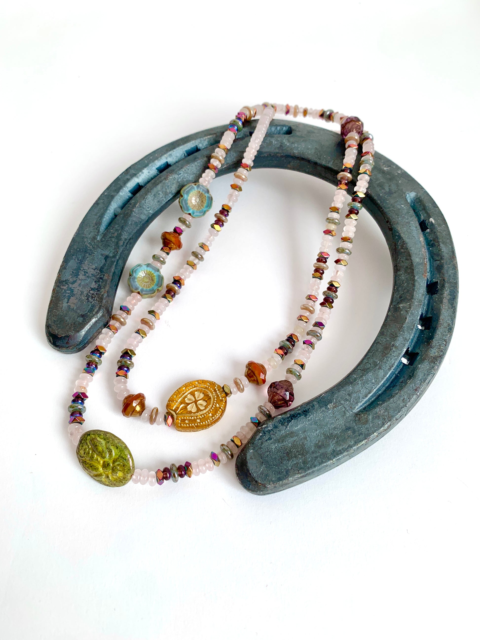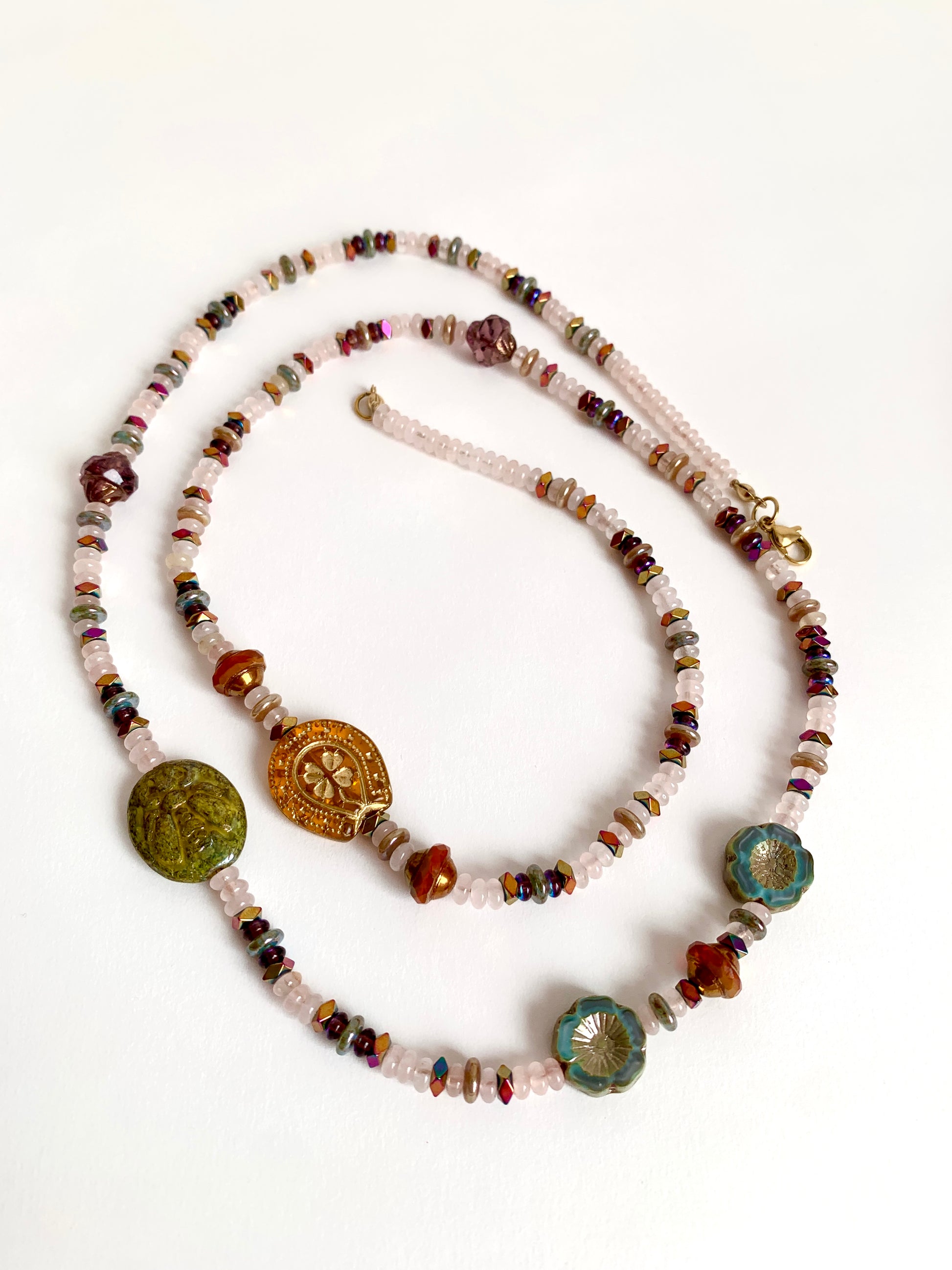 Perles de verre, Hématites multicolores, Quartz rose.