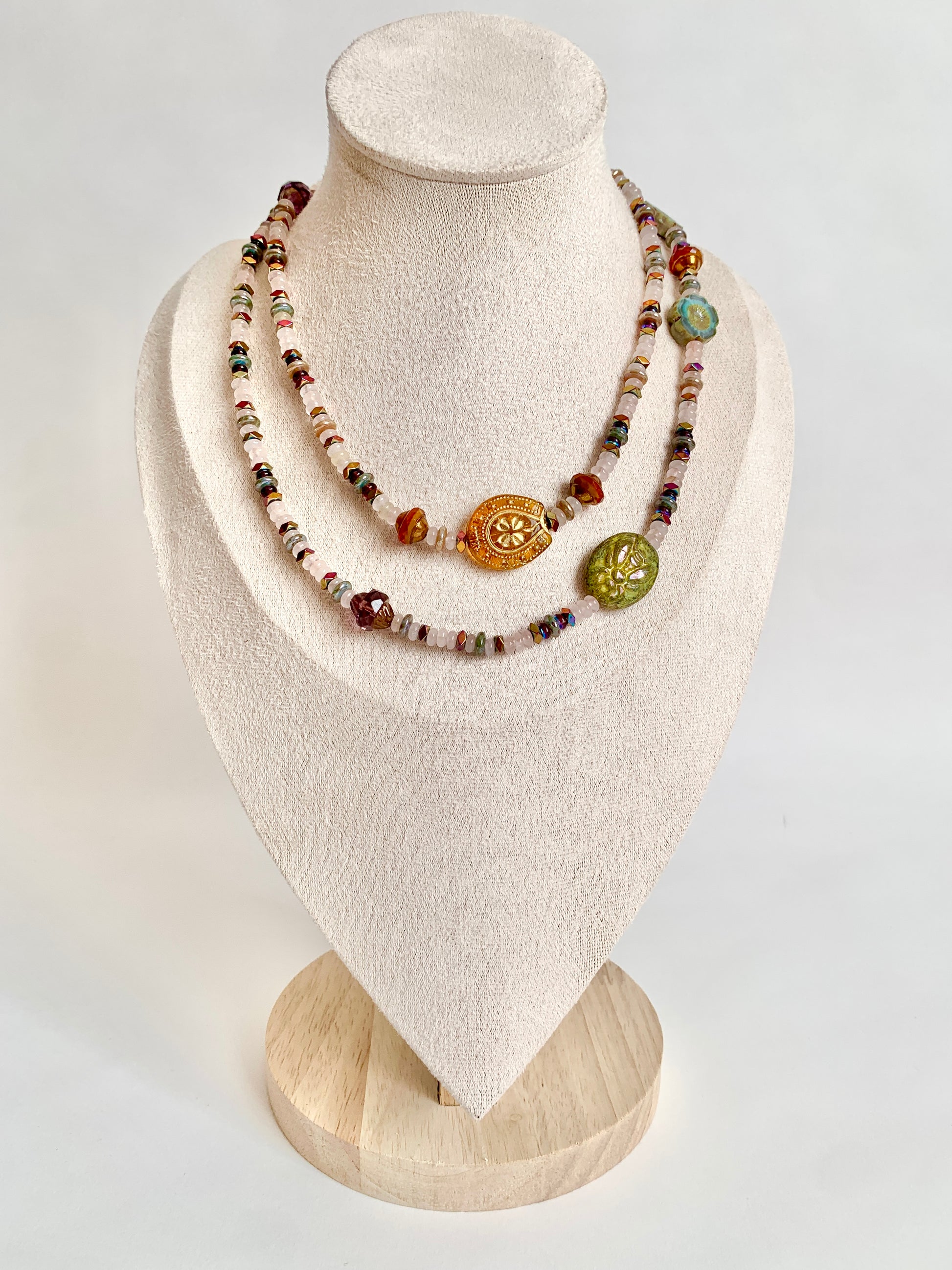 Quelques fleurs de verre ponctuent le collier de leur poésie silencieuse, comme autant de promesses en bouton.