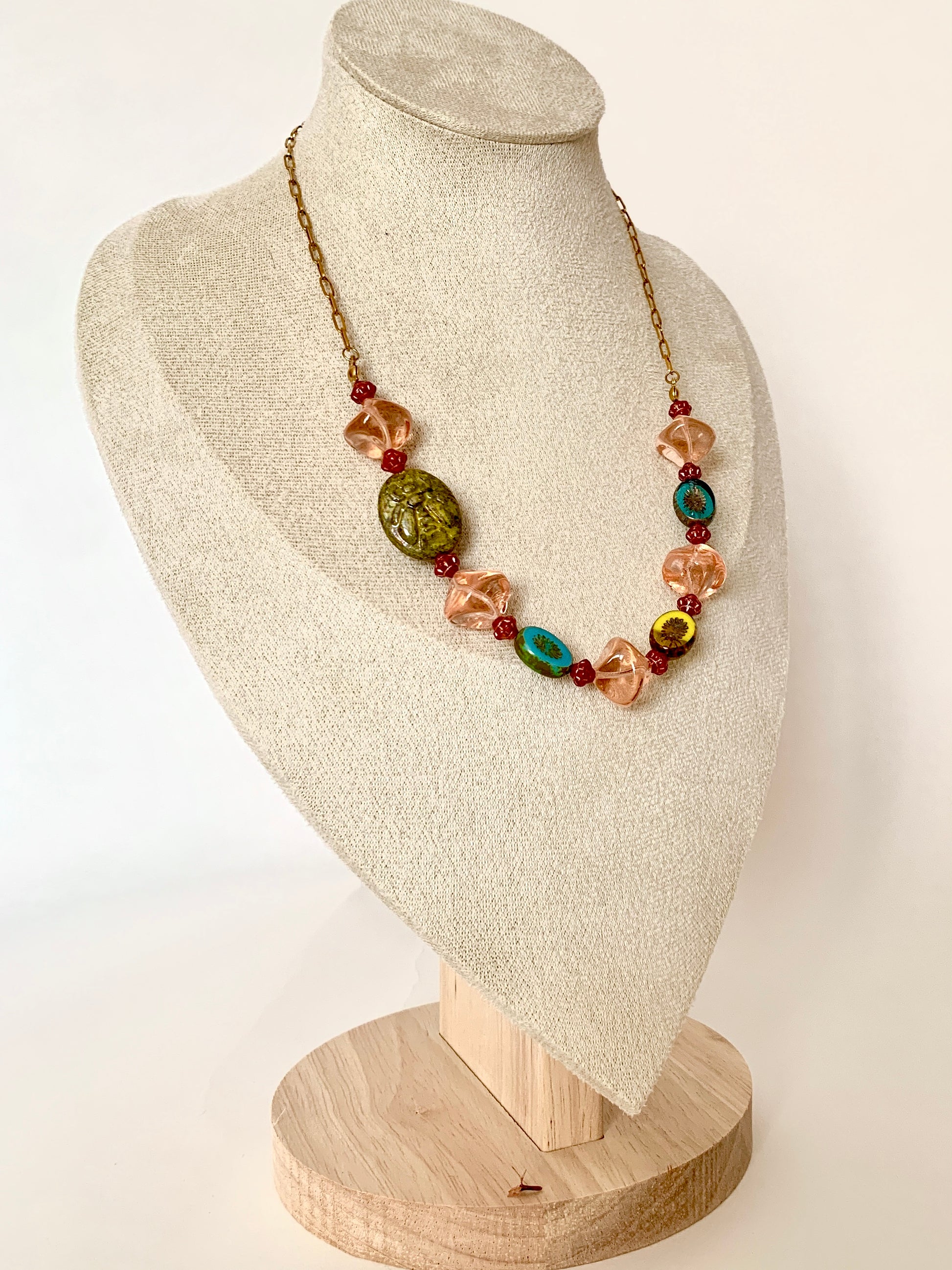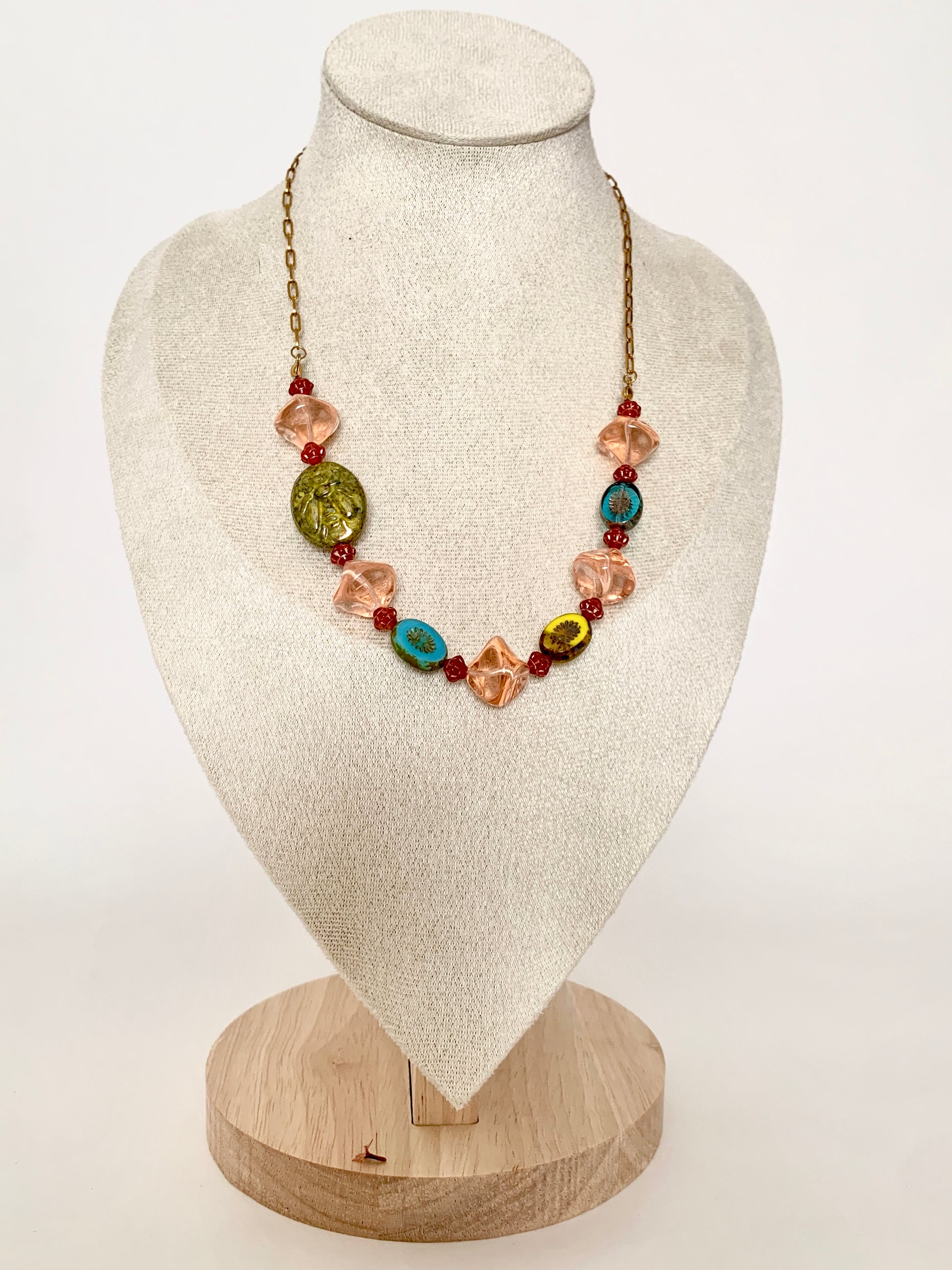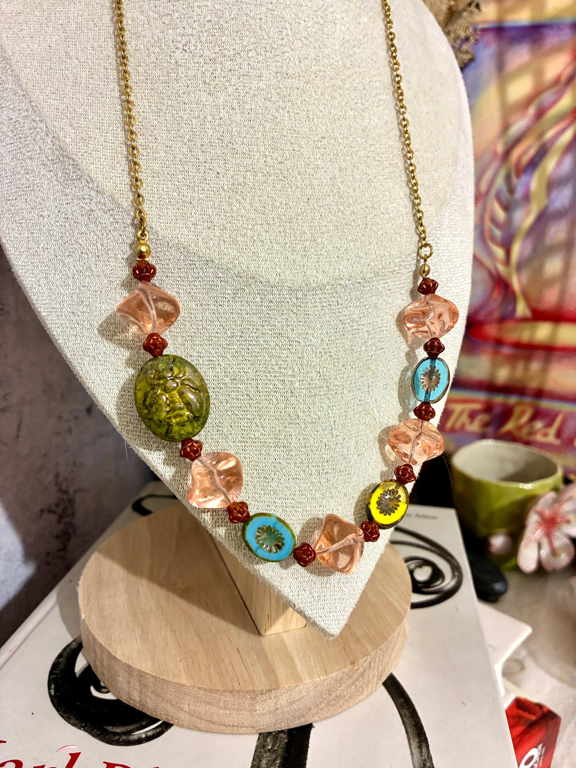 Sous le soleil doré de Provence, une abeille légère butine les couleurs d’un jardin en fleurs : le rose tendre des amandiers, le vert patiné des oliviers, le turquoise éclatant d’un ciel d’été. La Butineuse du Sud est née de cette image : un collier vibrant de poésie et d’héritage.