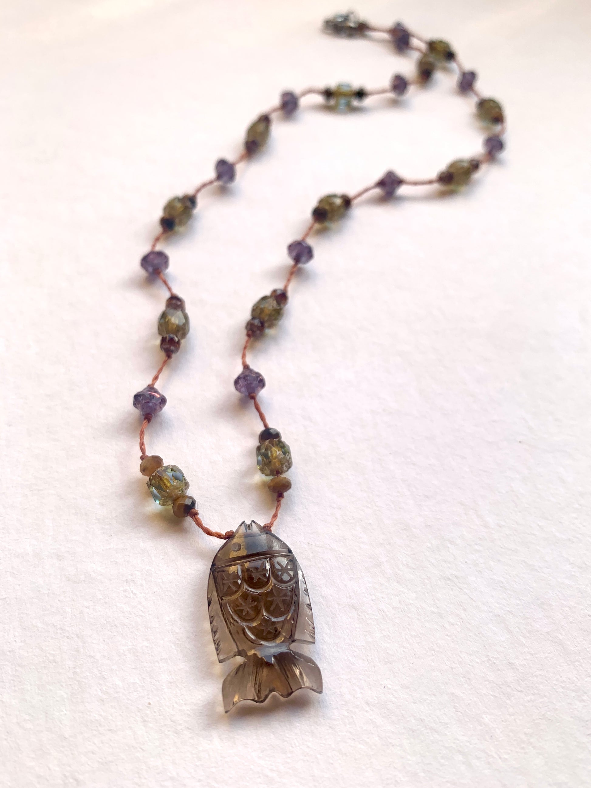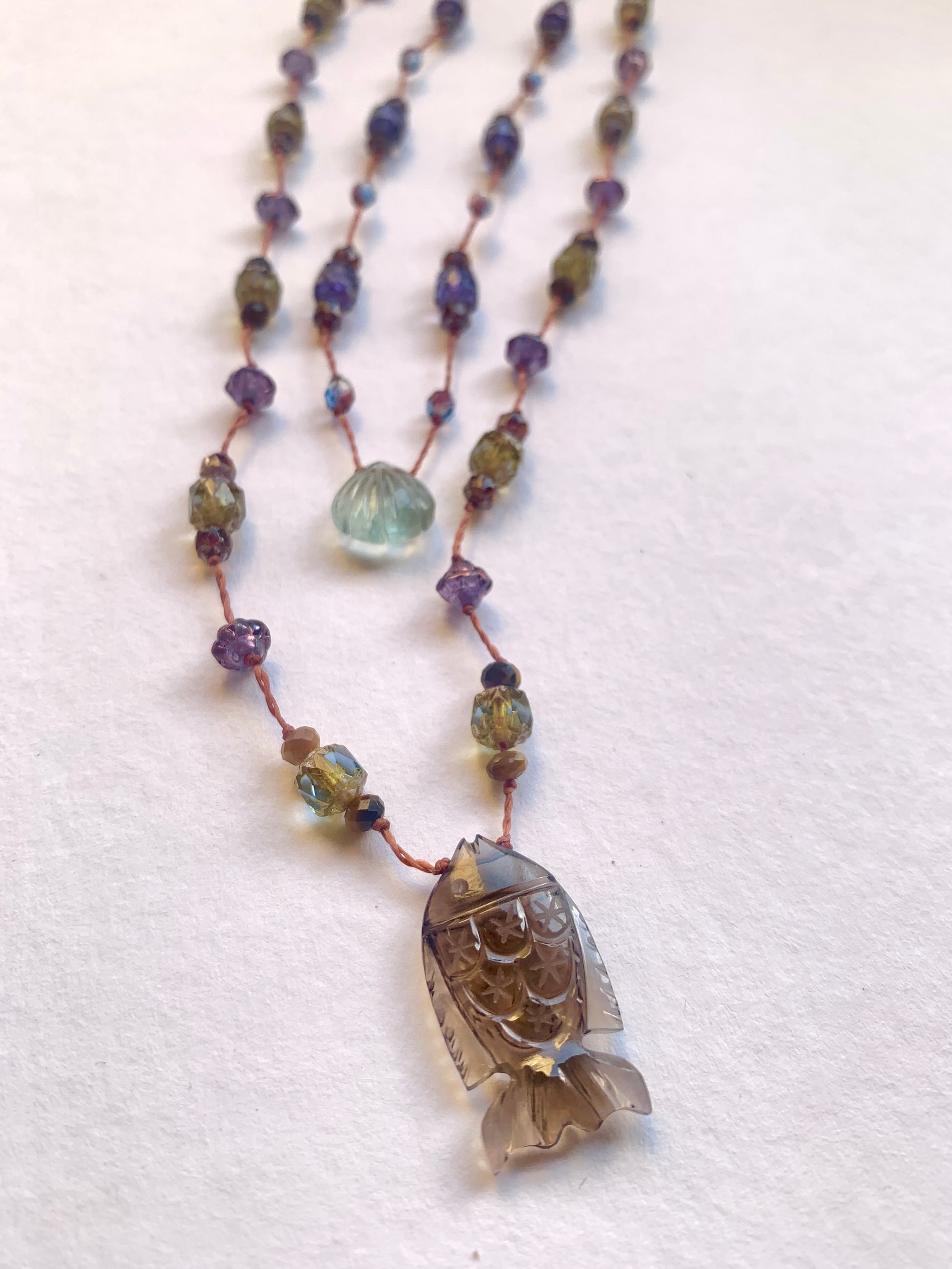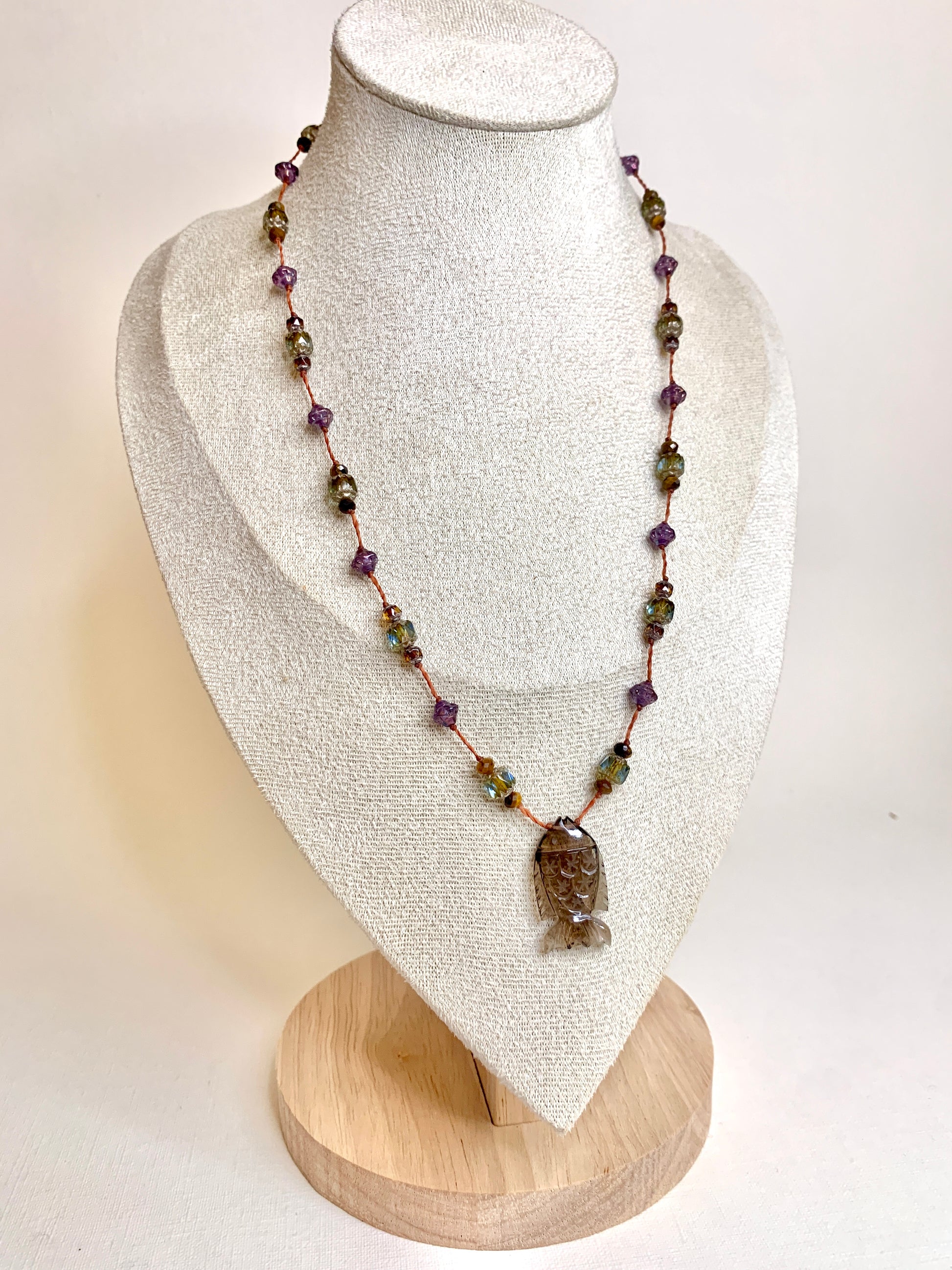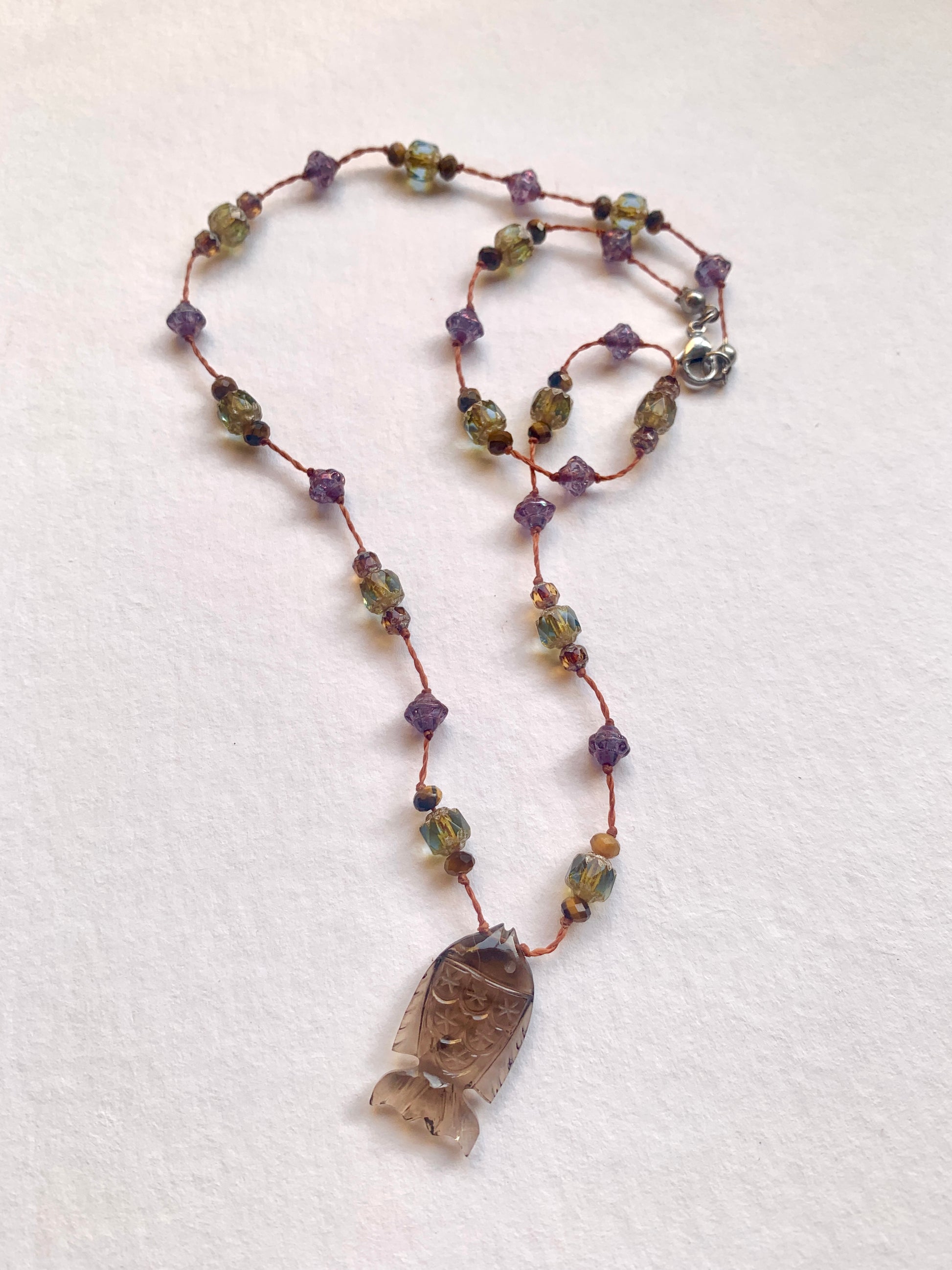 Son poisson en quartz fumé, sculpté à la main, apporte ancrage et clarté, comme une respiration profonde face aux vagues.