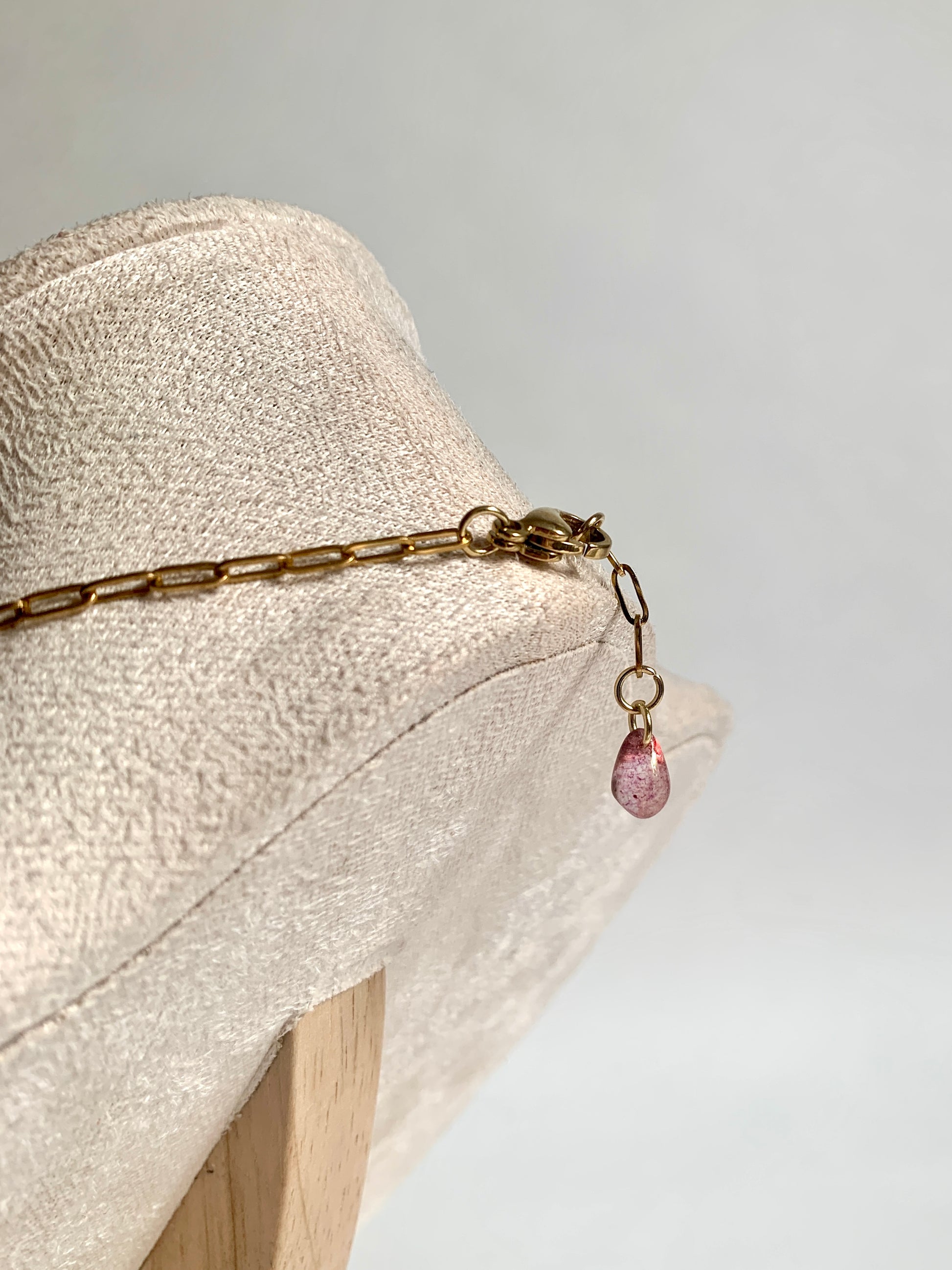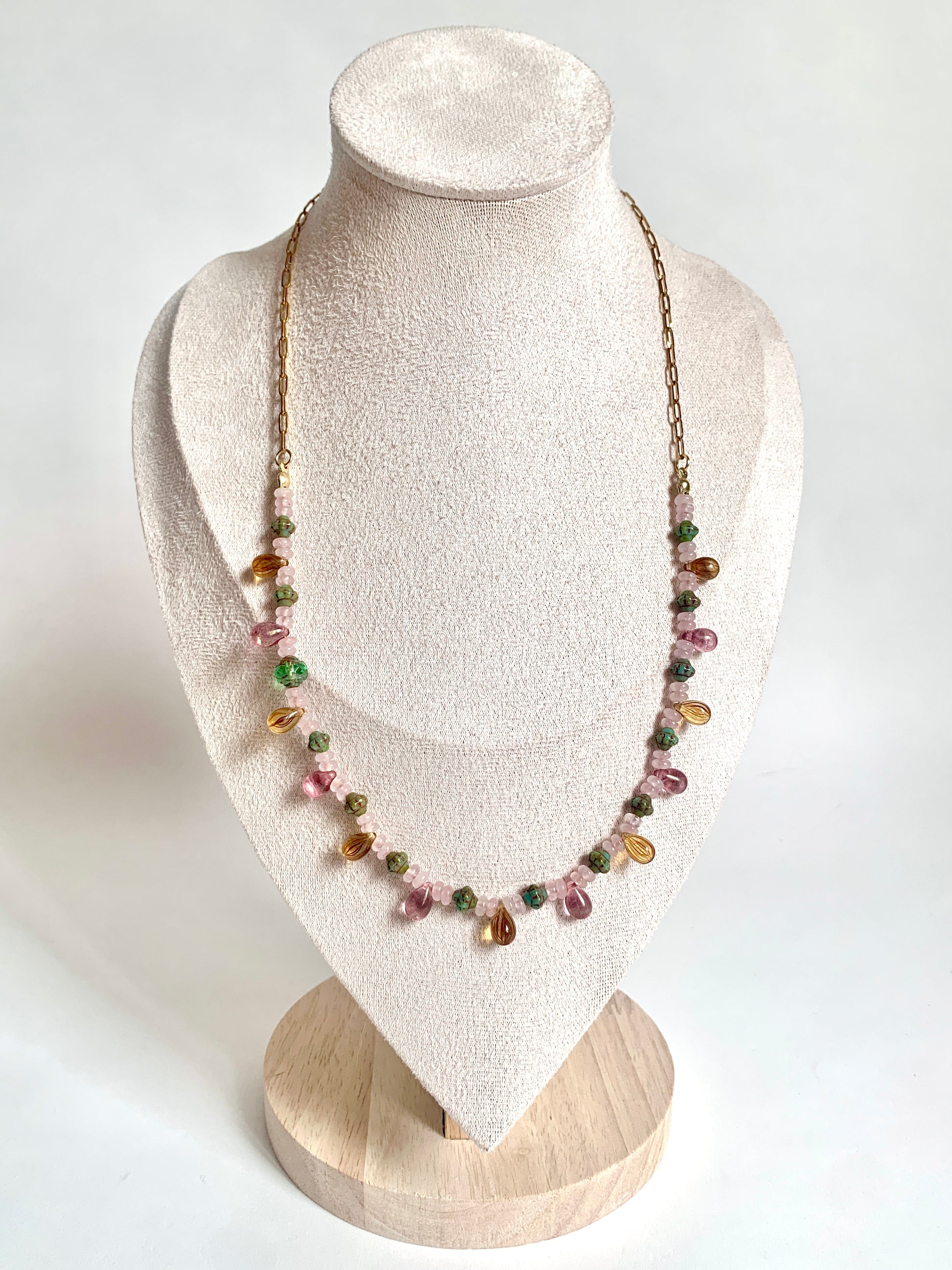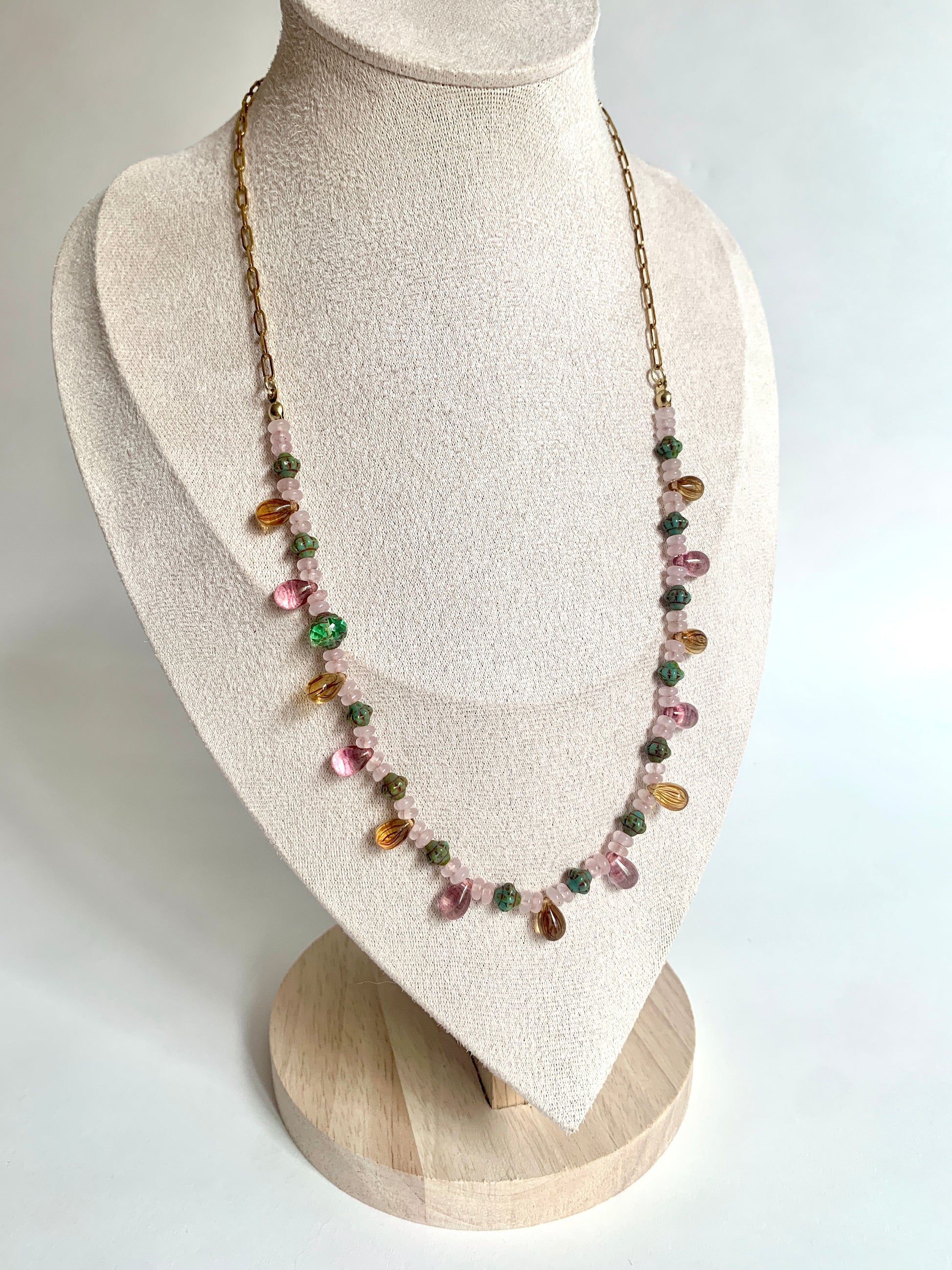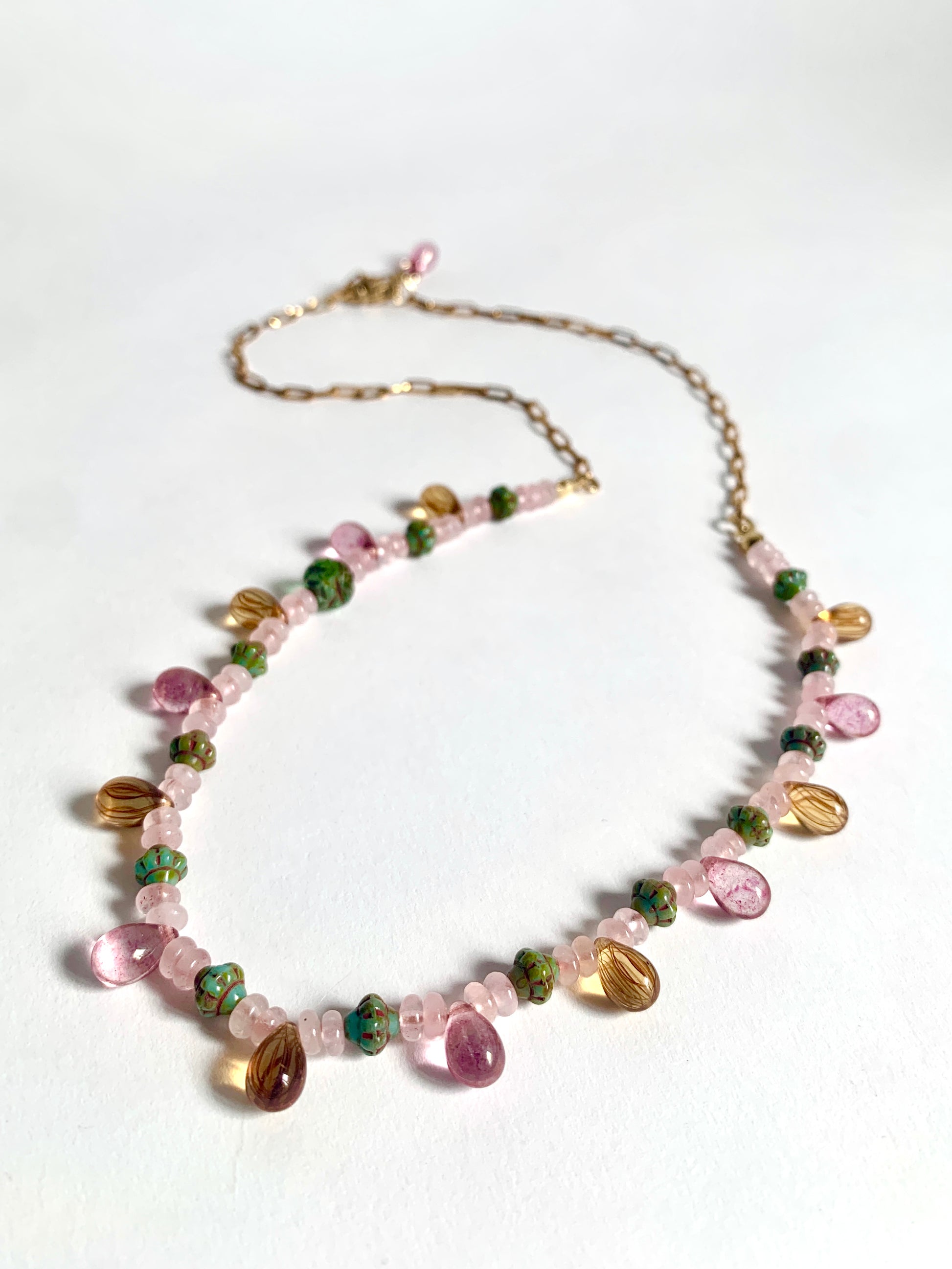 Ses gouttes de verre aux reflets miellés, ses touches vert émaillé et ses nuances de rose tendre s’accordent autour d’un fil invisible : celui du quartz rose. Pierre de l’amour, elle apaise, répare, enveloppe.