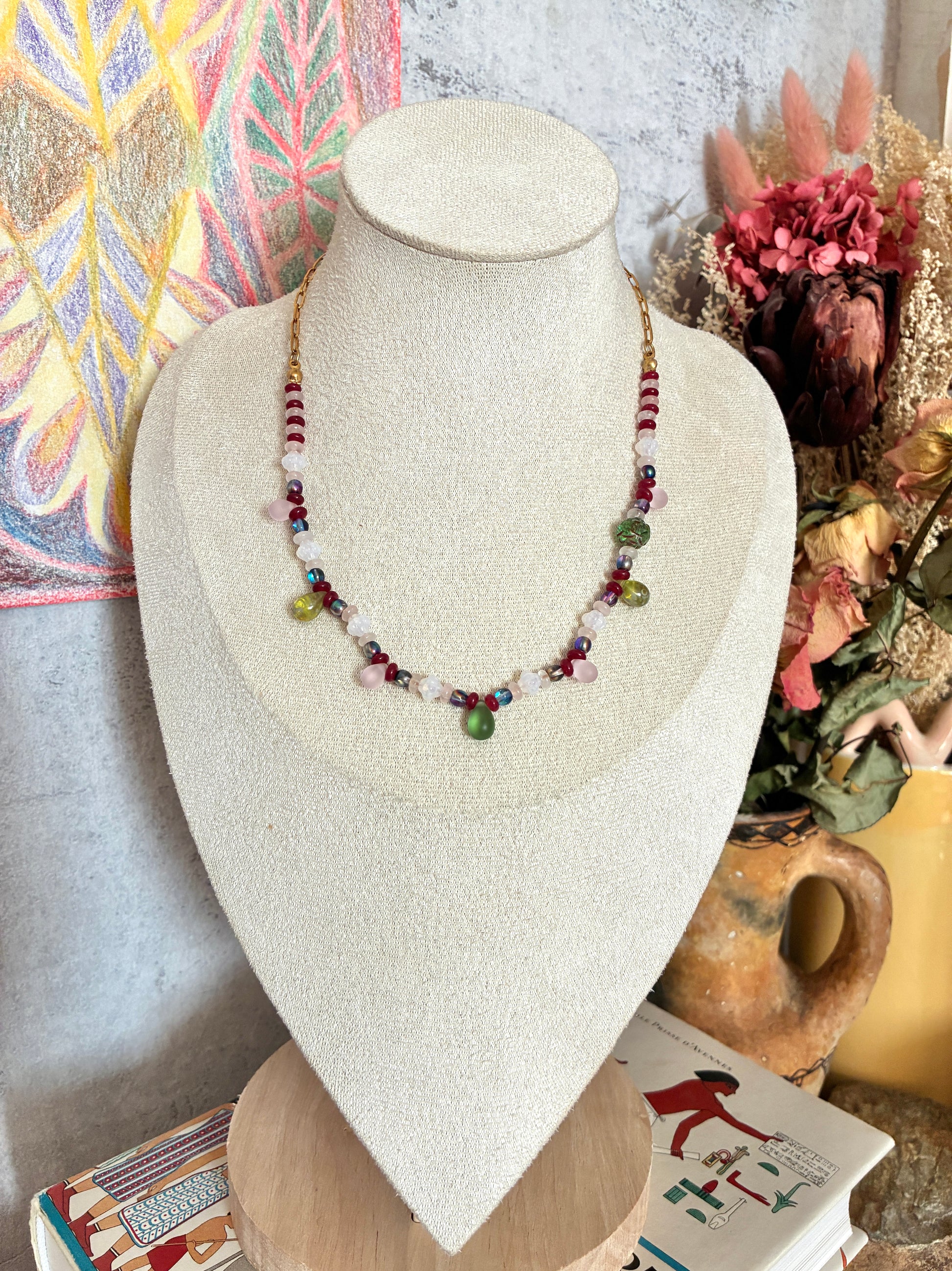 Le quartz rose invite à la paix intérieure, la calcédoine rouge réchauffe et équilibre les émotions et la perle bouton de rose, délicatement verte, glisse un mot d’espoir : tu es en train d’éclore.