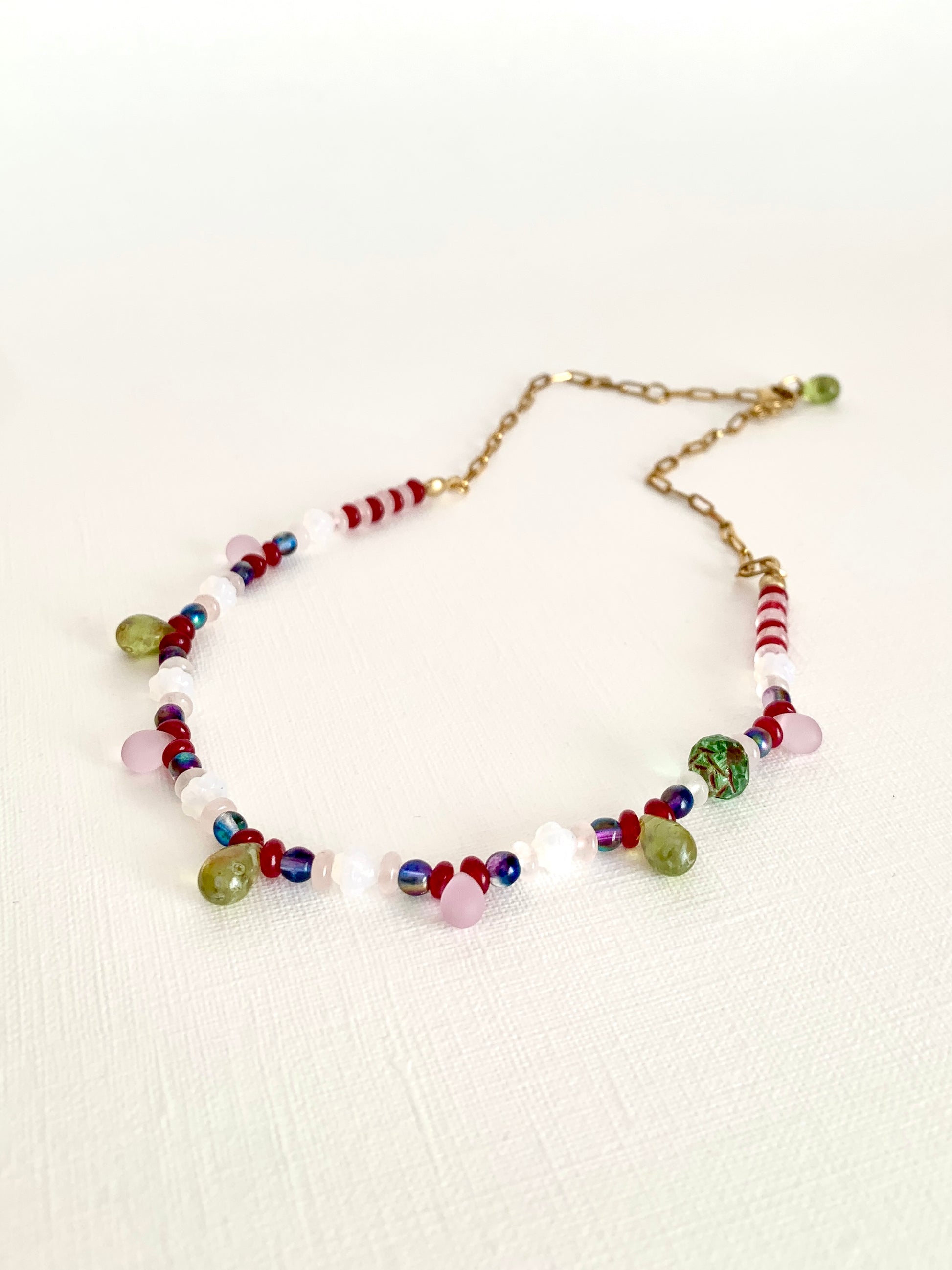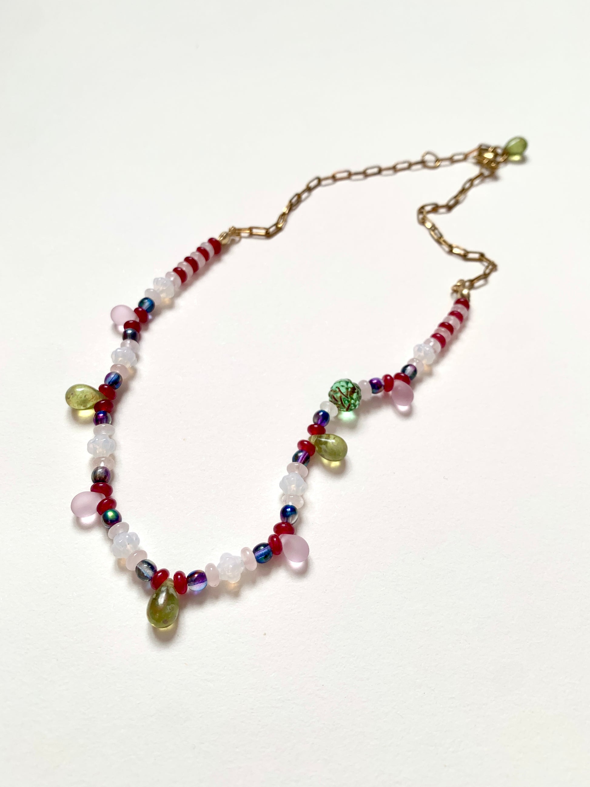 Perles de verre, Calcédoine rouge et Quartz rose.
