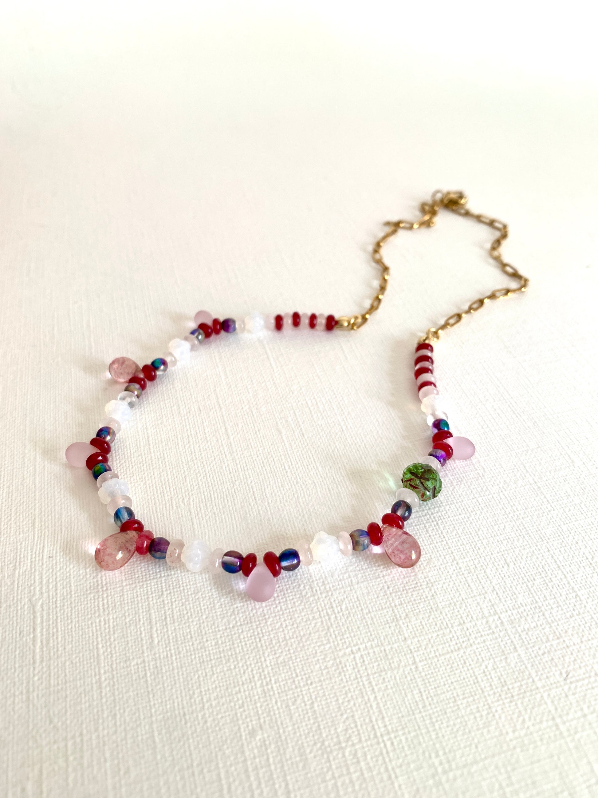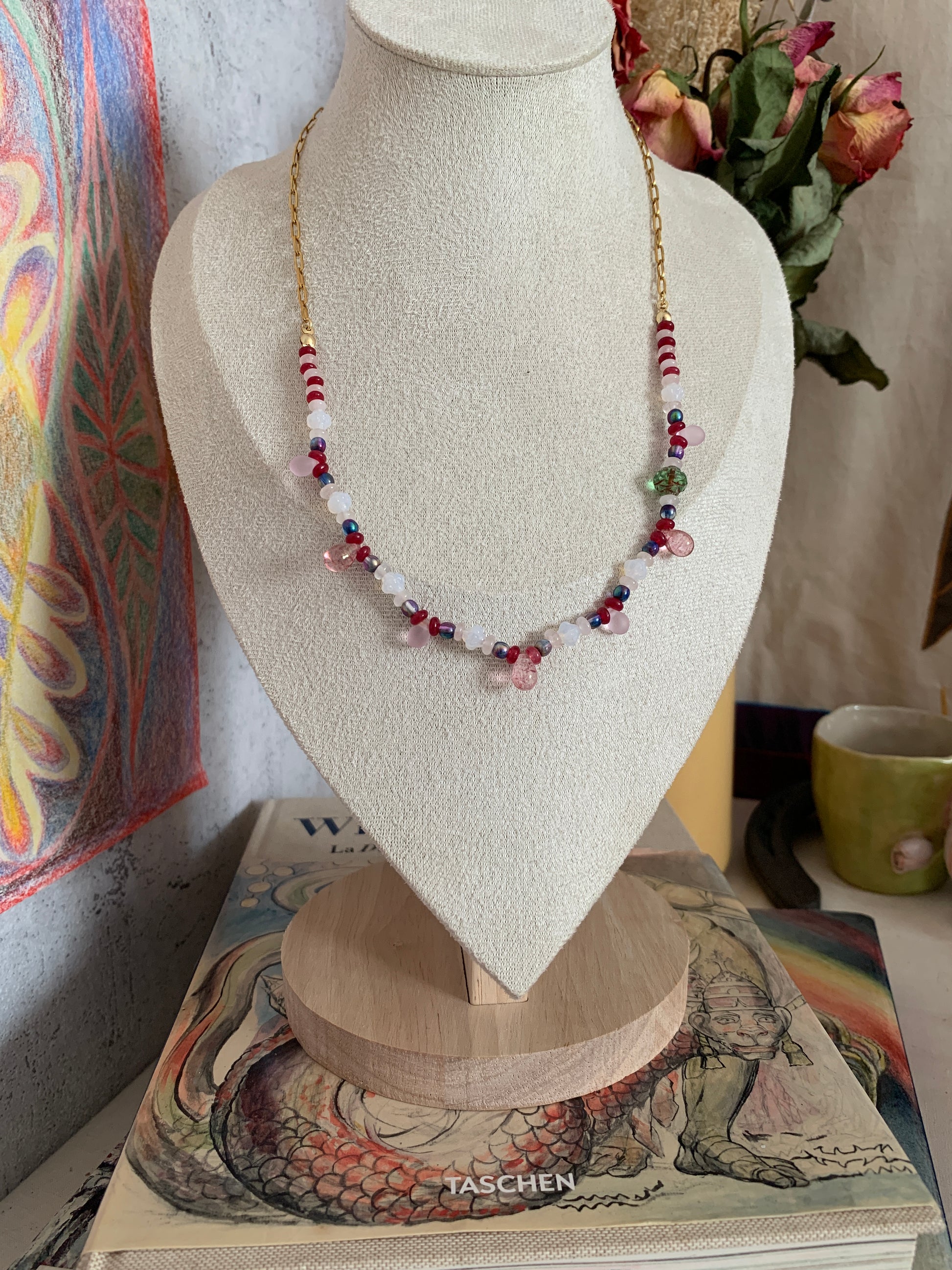 Perles de verre, Calcédoine rouge et Quartz rose.
