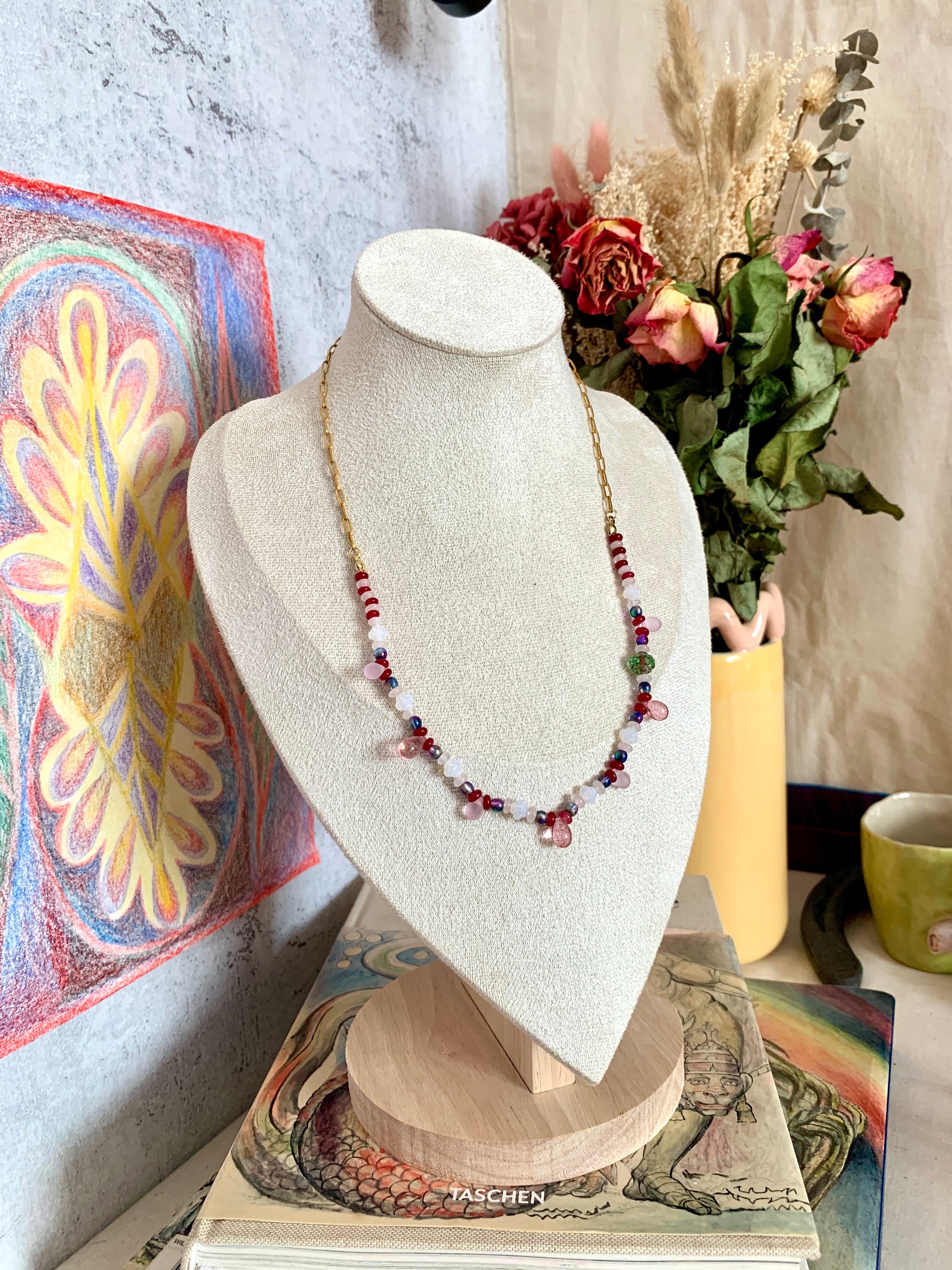 Le quartz rose invite à la paix intérieure, la calcédoine rouge réchauffe et équilibre les émotions et la perle bouton de rose, délicatement verte, glisse un mot d’espoir : tu es en train d’éclore.