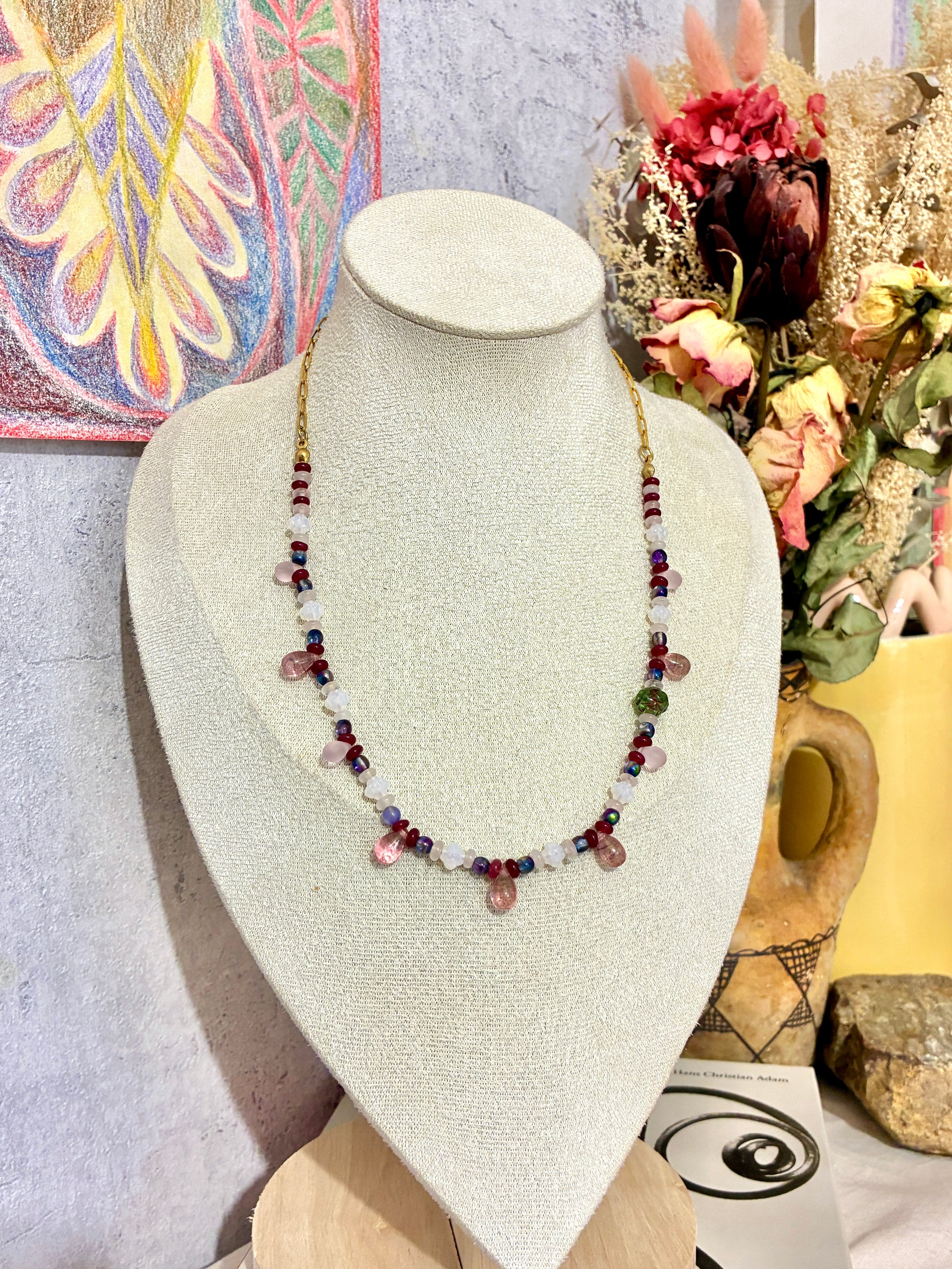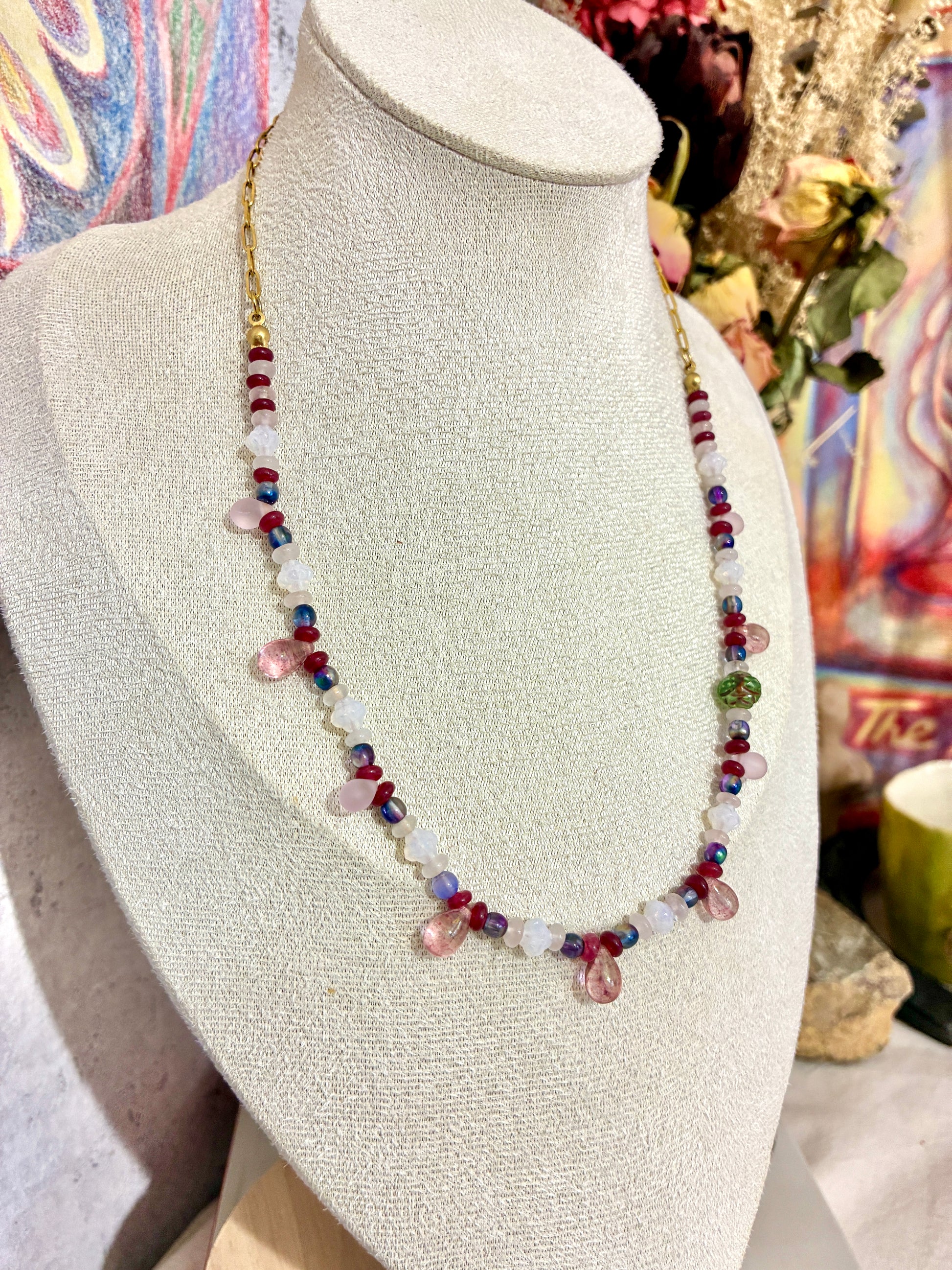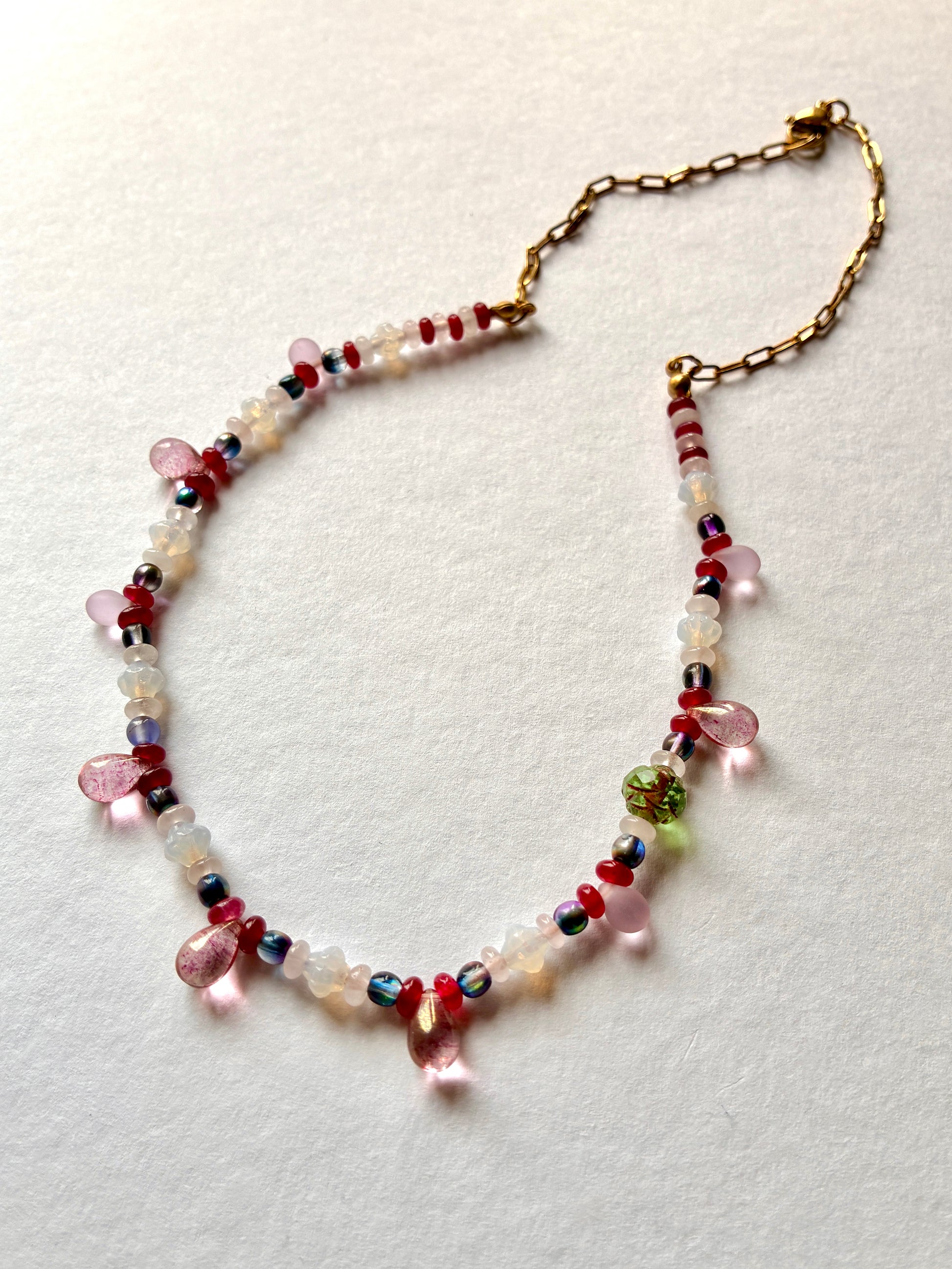 Perles de verre, Calcédoine rouge et Quartz rose.