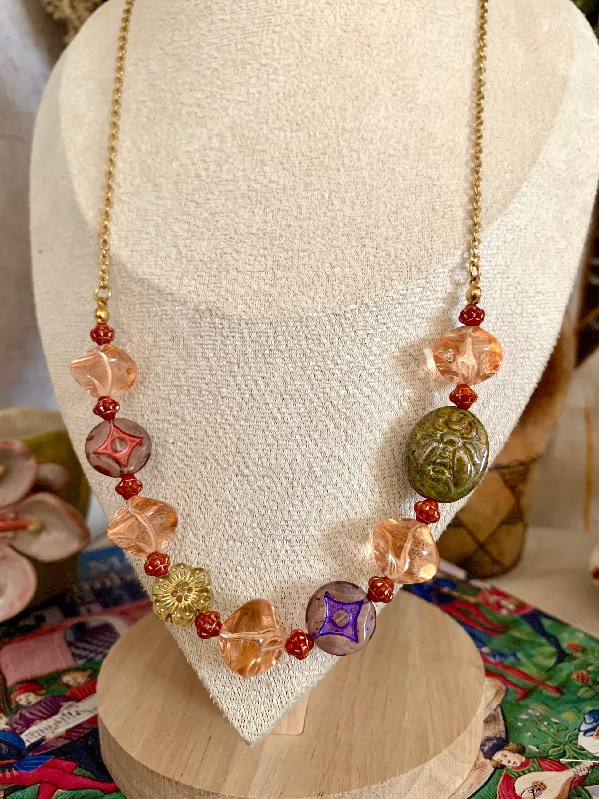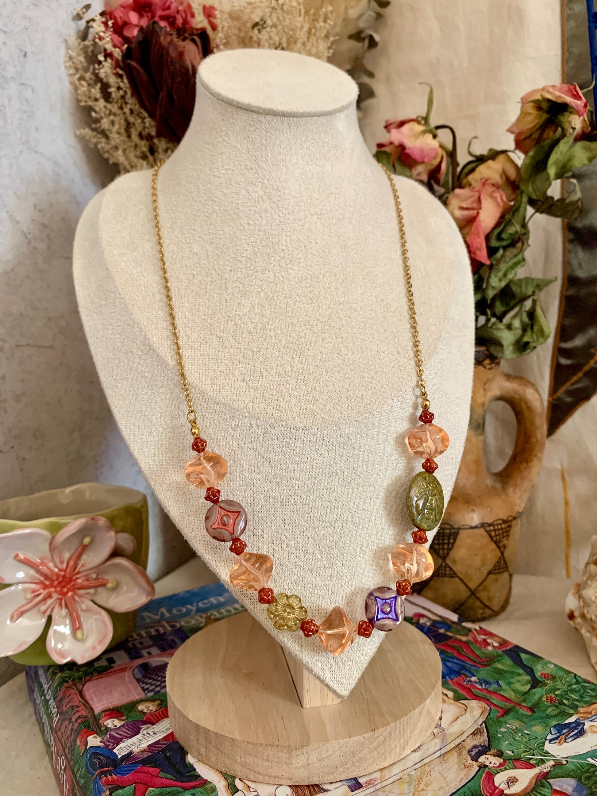 Chaque perle y raconte une renaissance : les perles de verre vintage, chinées puis restaurées, retrouvent leur éclat d’origine, tandis que les perles de Bohème, rares, introuvables aujourd’hui, diffusent leurs reflets flamboyants.