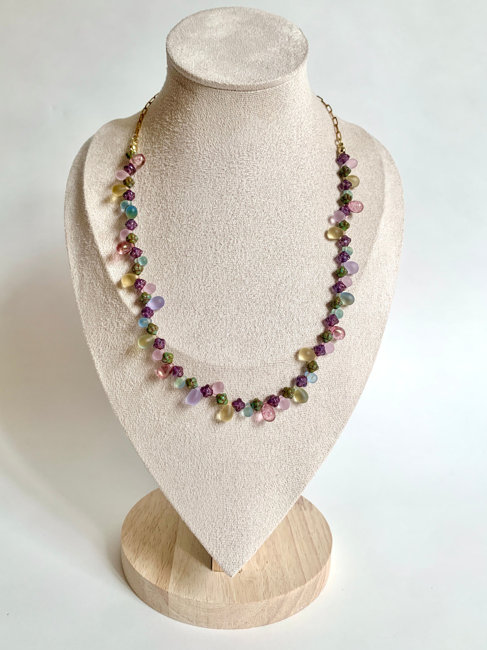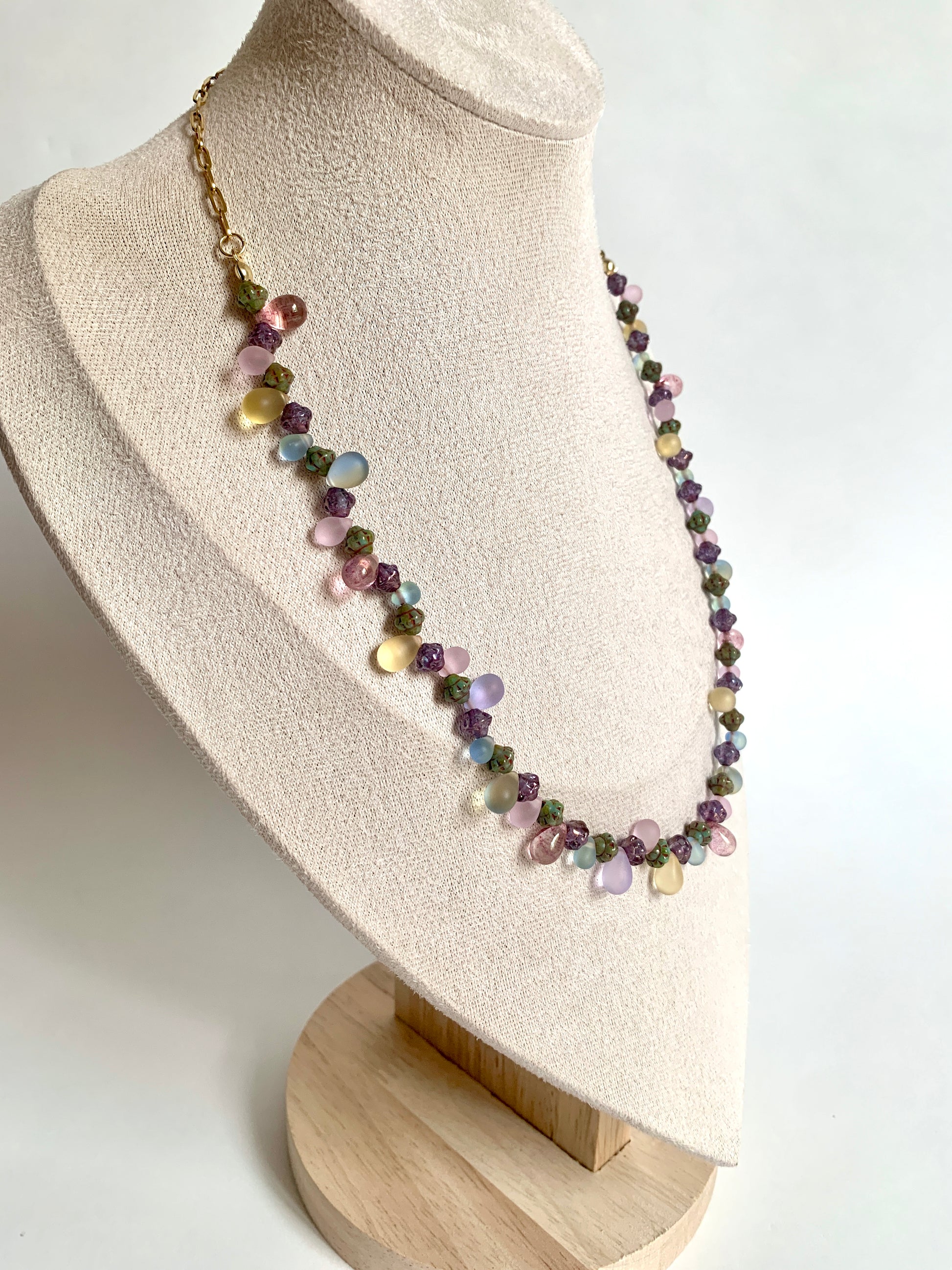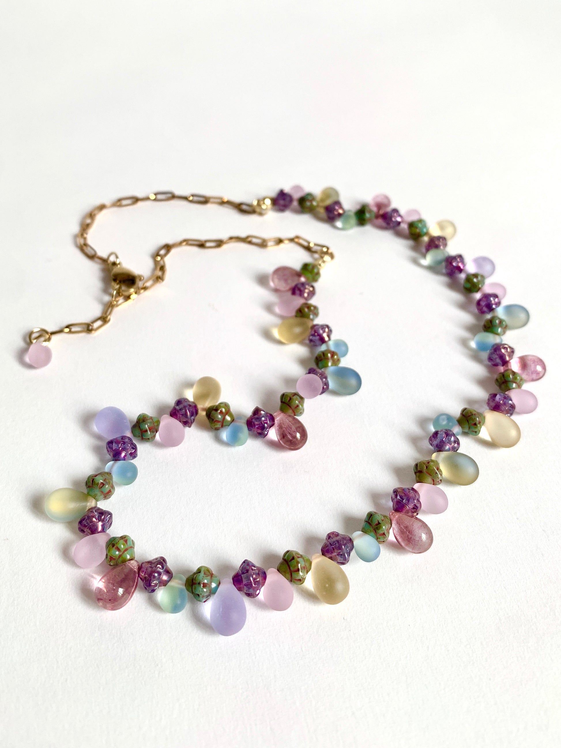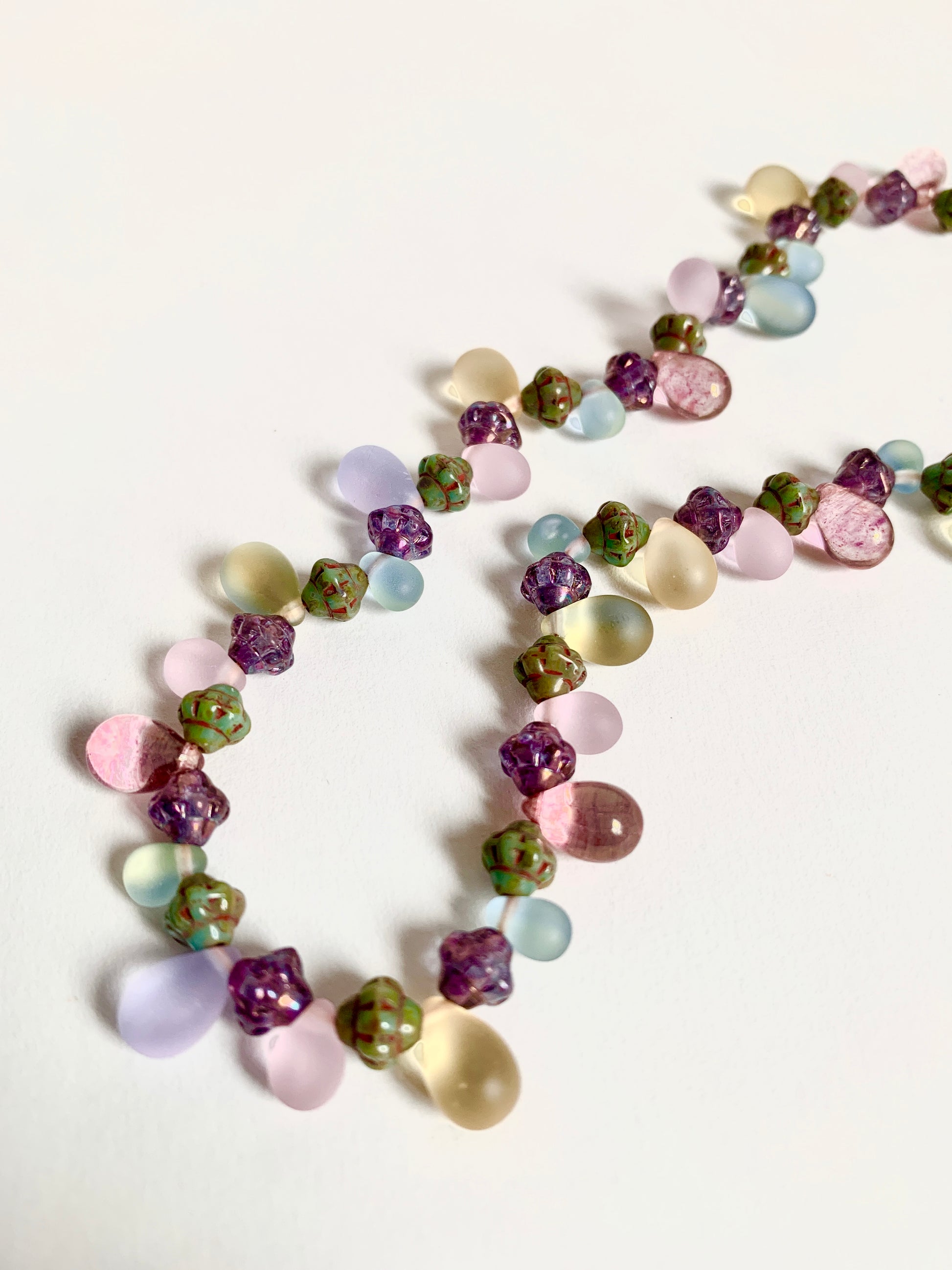 Ses perles de verre évoquent les teintes tendres d’un matin en Provence ou d’un bal au cœur de l’été : lavande, lilas, rosée laiteuse, vert mousse…