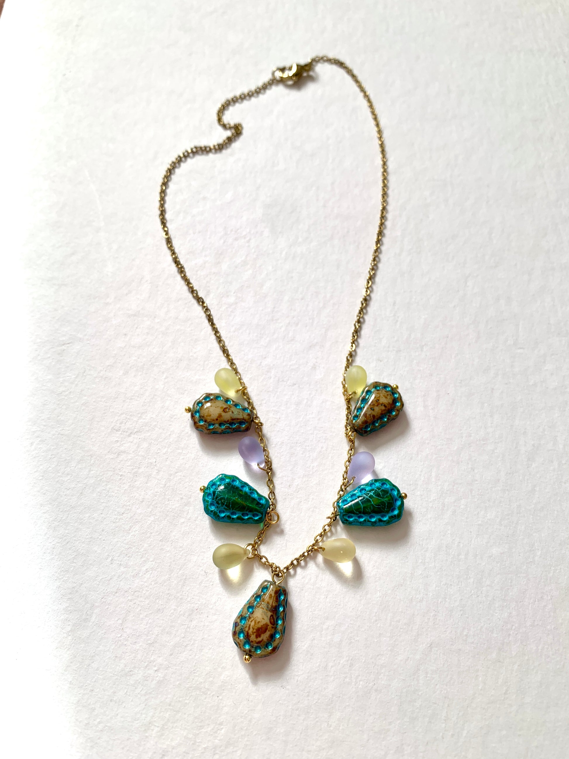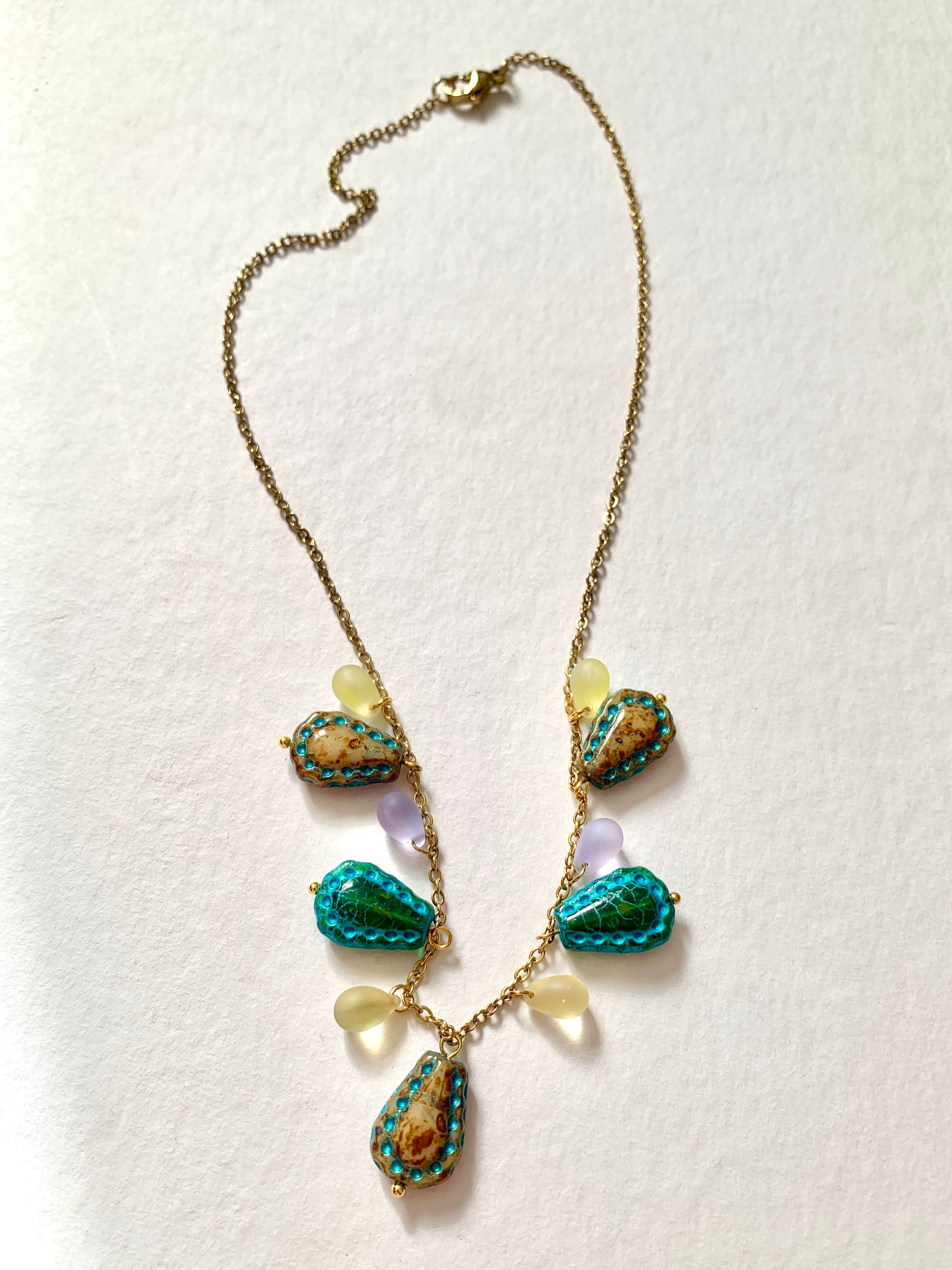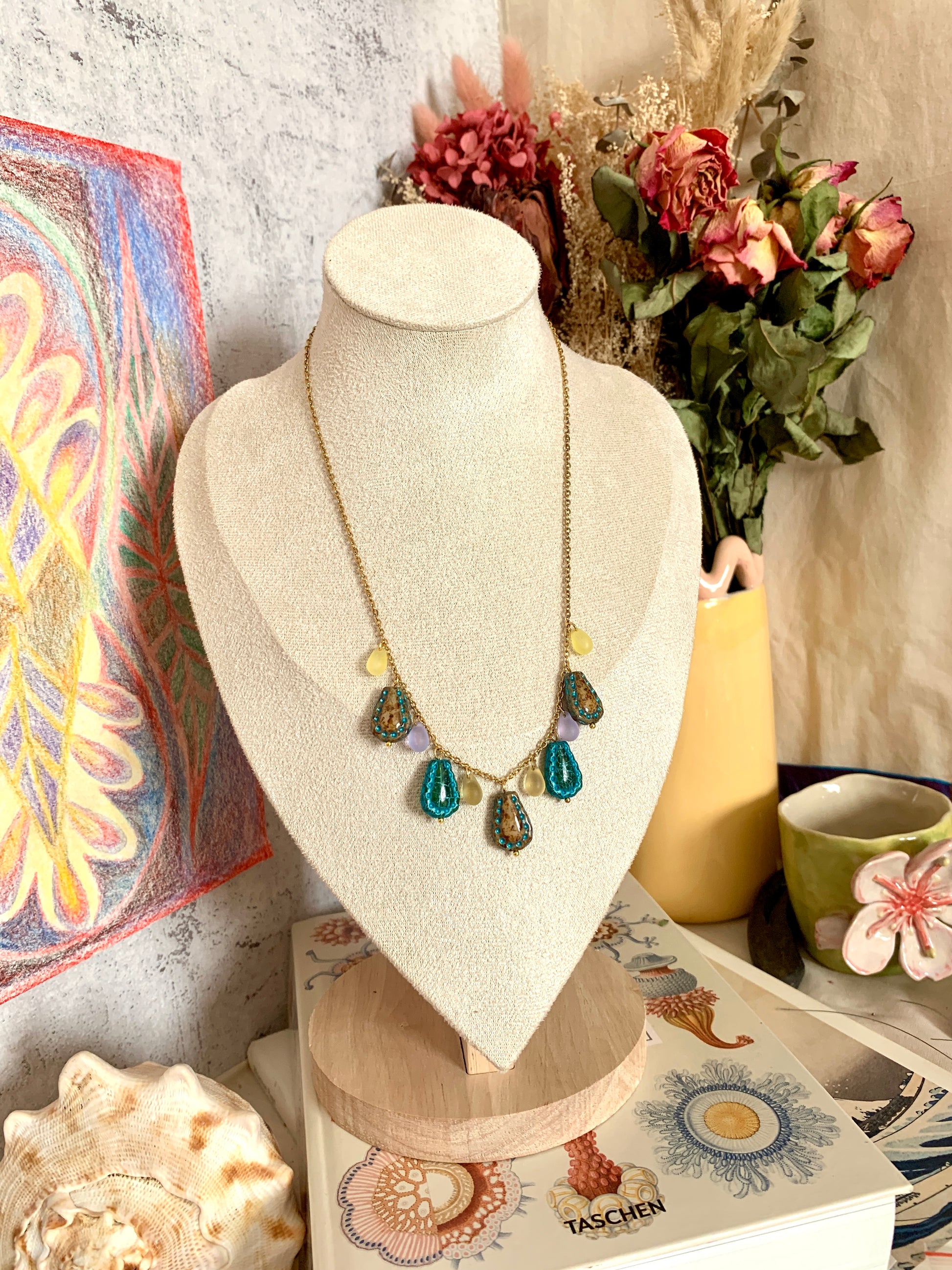 Les perles jaunes pâles captent la lumière comme des éclats solaires, les turquoise-vert évoquent les eaux profondes et mystérieuses, tandis que les bruns mouchetés rappellent la puissance fertile des sols.
