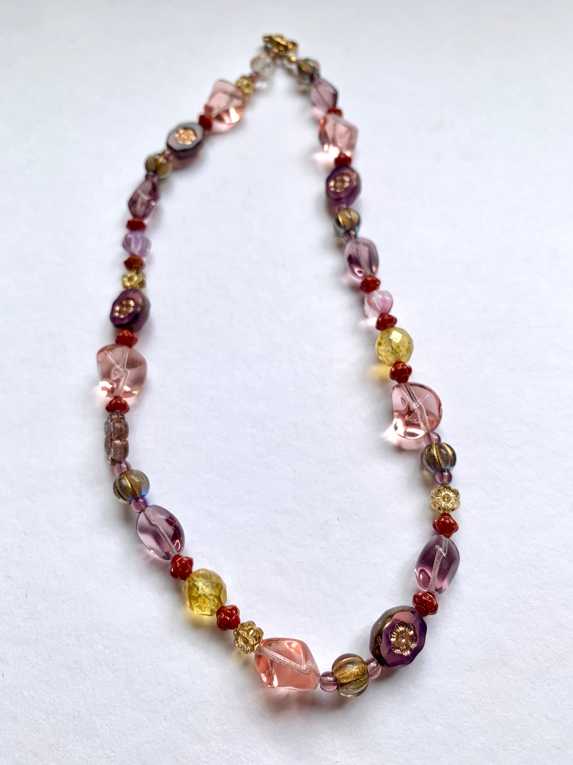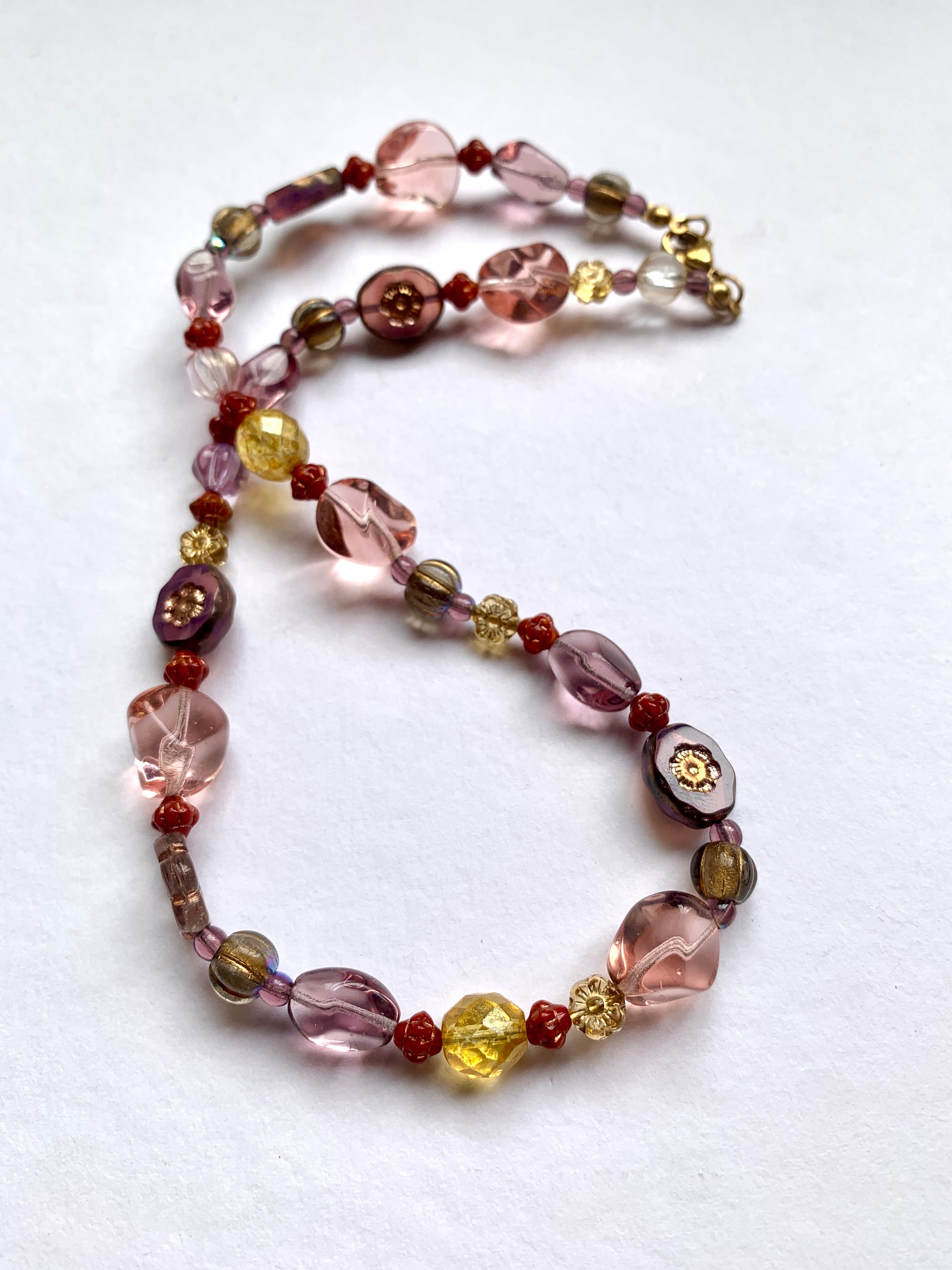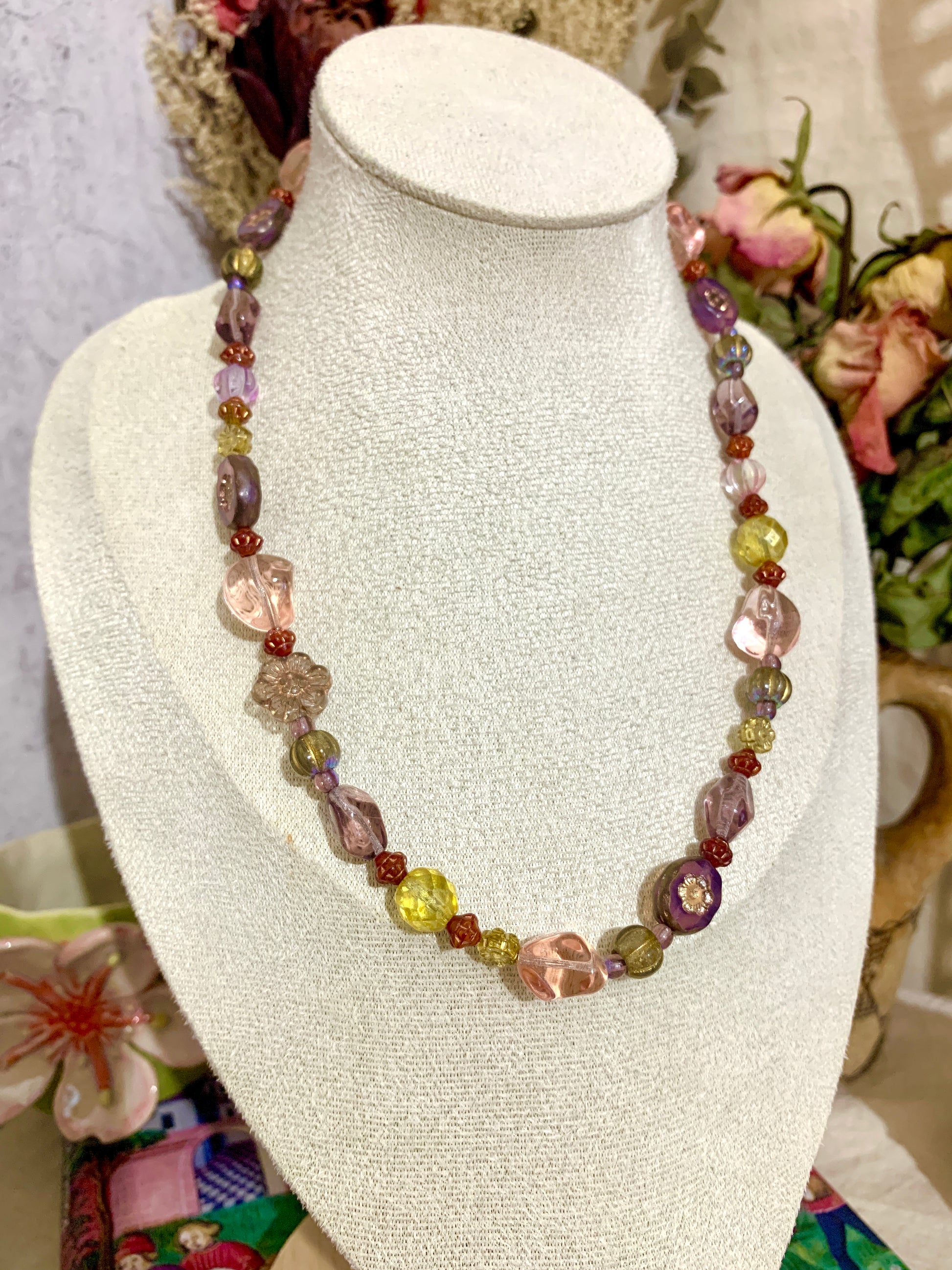 Mémoire Fleurie est une promenade hors du temps. Chaque perle ancienne ou actuelle raconte une histoire, comme si elles avaient été cueillies dans un jardin de souvenirs. Verre sculpté, éclats de fleurs figés dans la transparence, teintes rosées, dorées et prune… Ce collier compose un poème silencieux.
