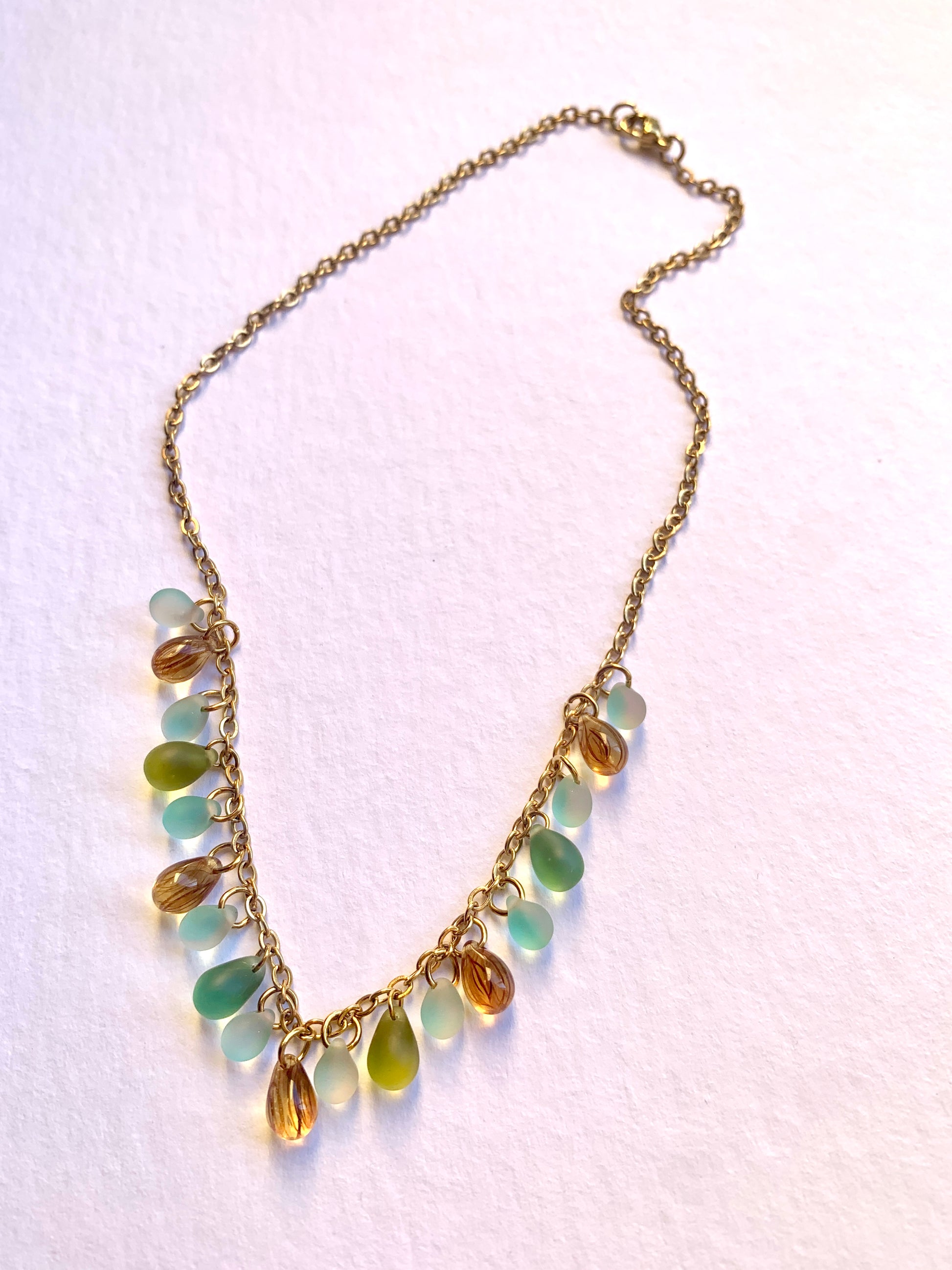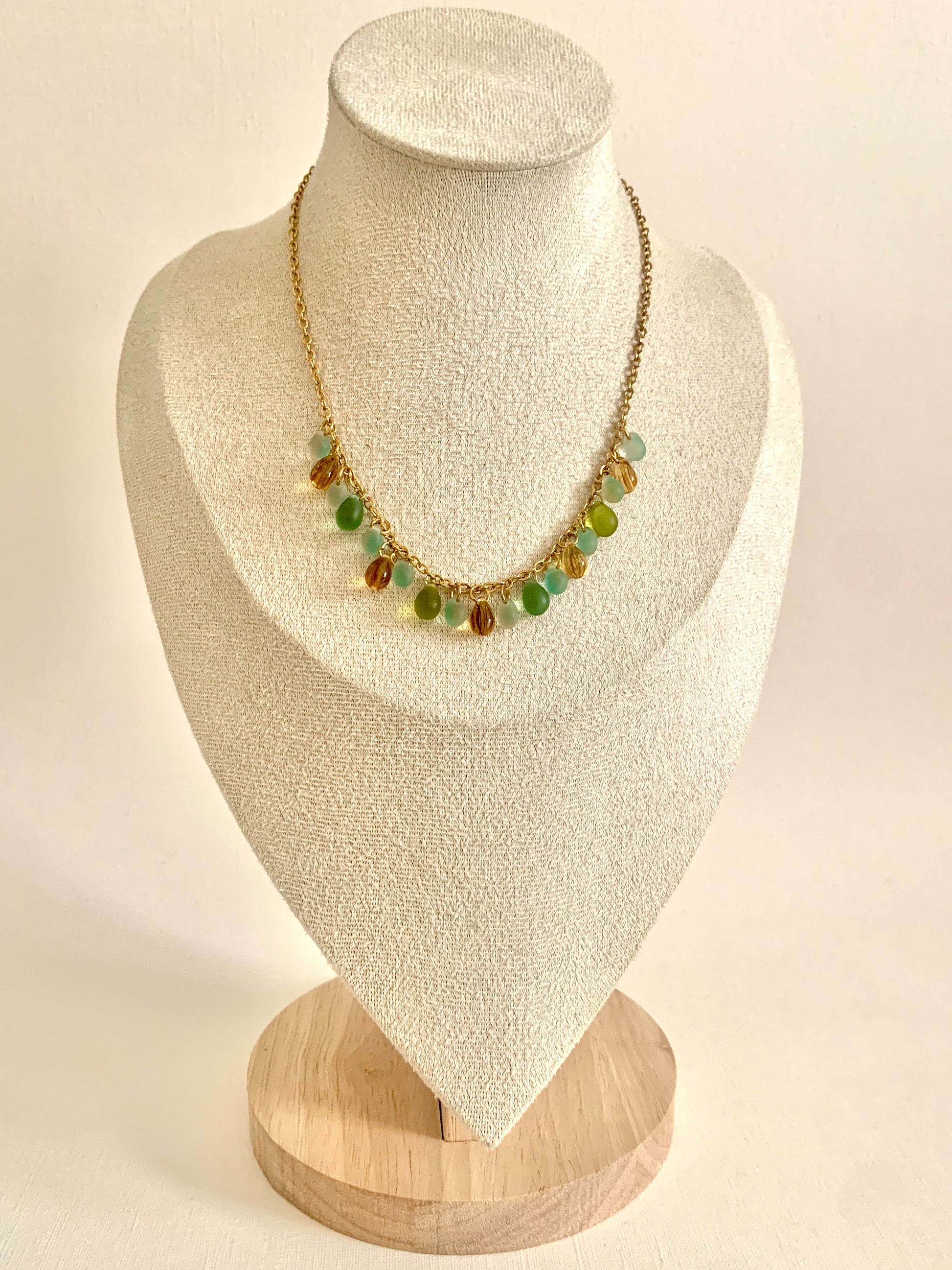 Ce collier, façonné en perles de verre, capture la sensation d’une brise mentholée qui traverse le désert et rencontre la chaleur du soleil.
