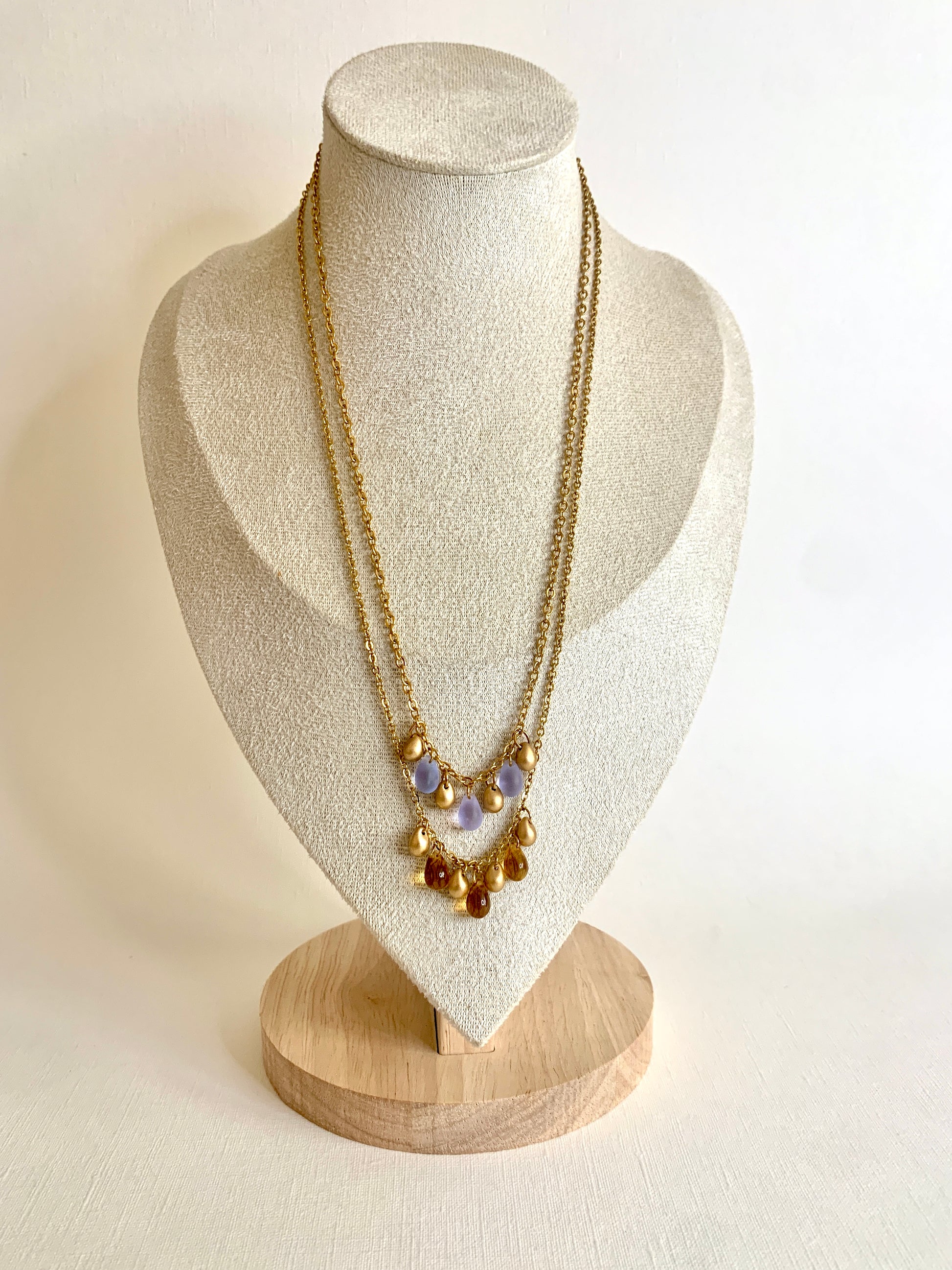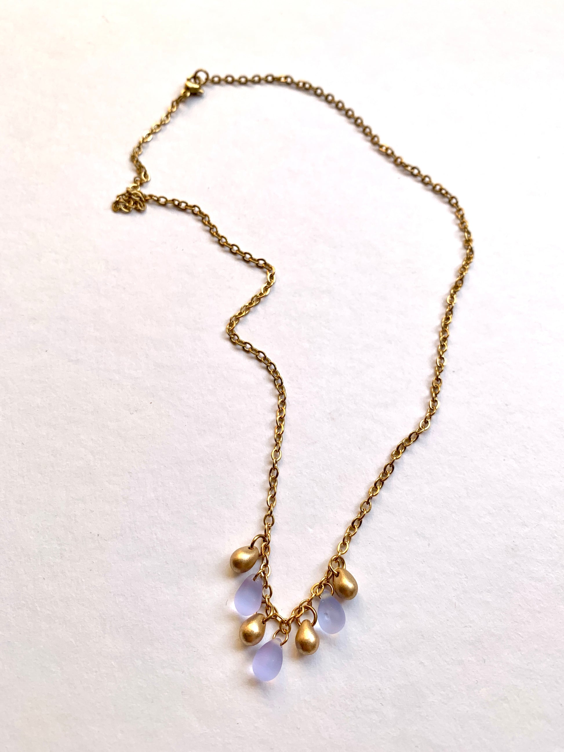 Perles de verre montées sur une chaine en acier inoxydable.
