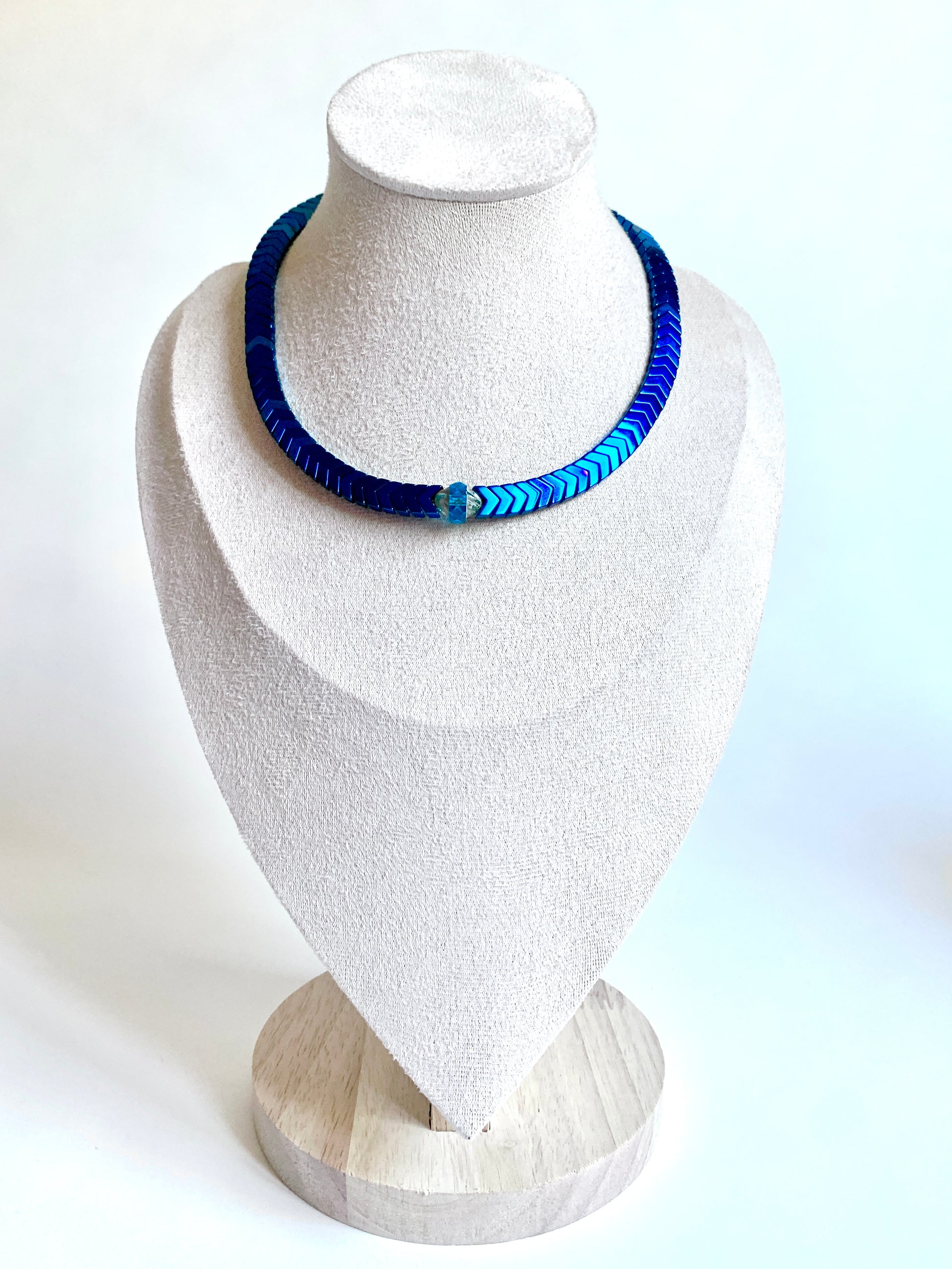 Plongez dans une traversée sensorielle, entre reflets métalliques et éclat cosmique. Odyssée Bleue est un collier ras-du-cou sculpté comme une ligne d’horizon. Ses hématites bleu nuit, finement facettées, évoquent les écailles d’une créature céleste ou la trajectoire silencieuse d’un vaisseau galactique.
