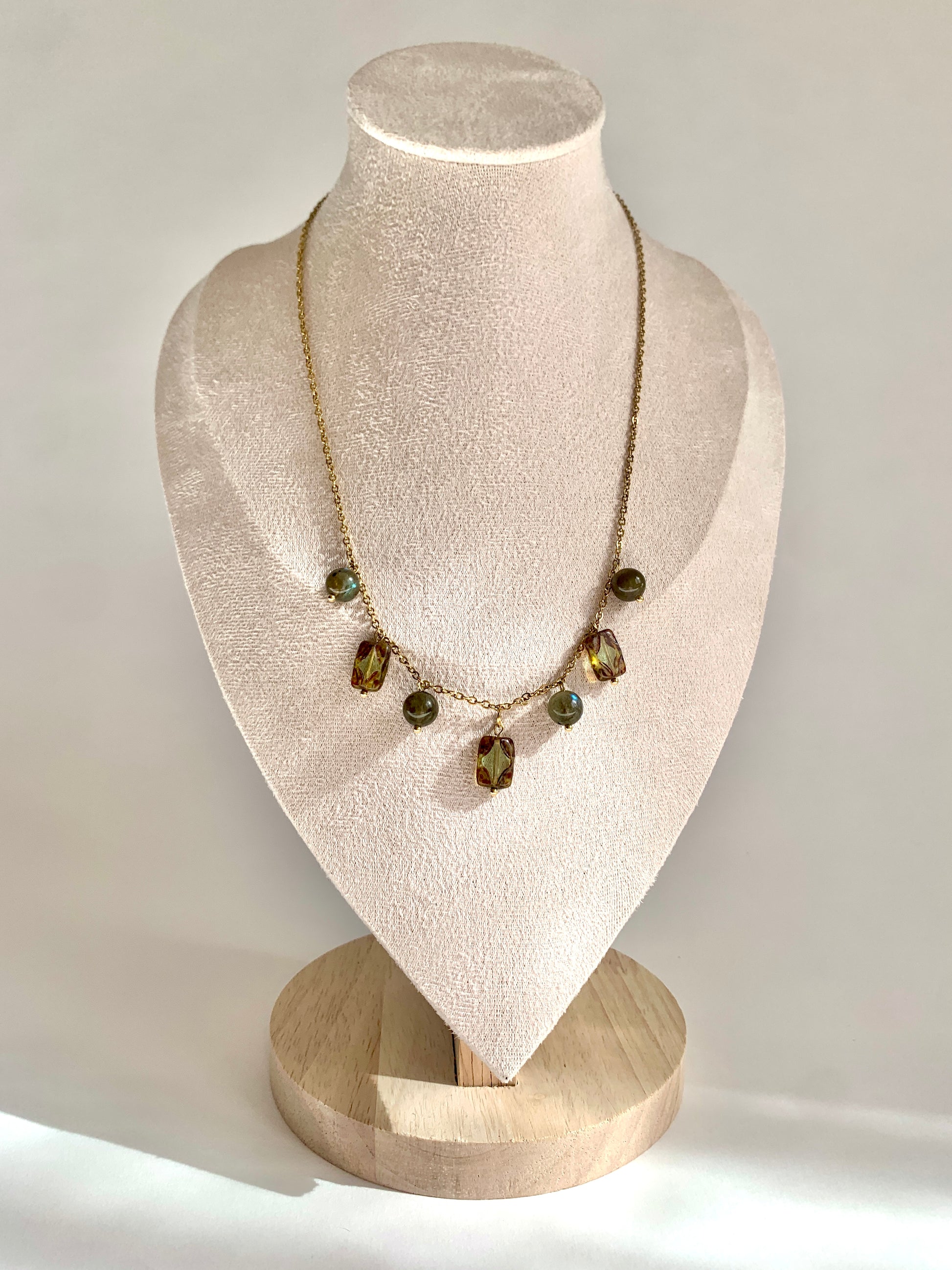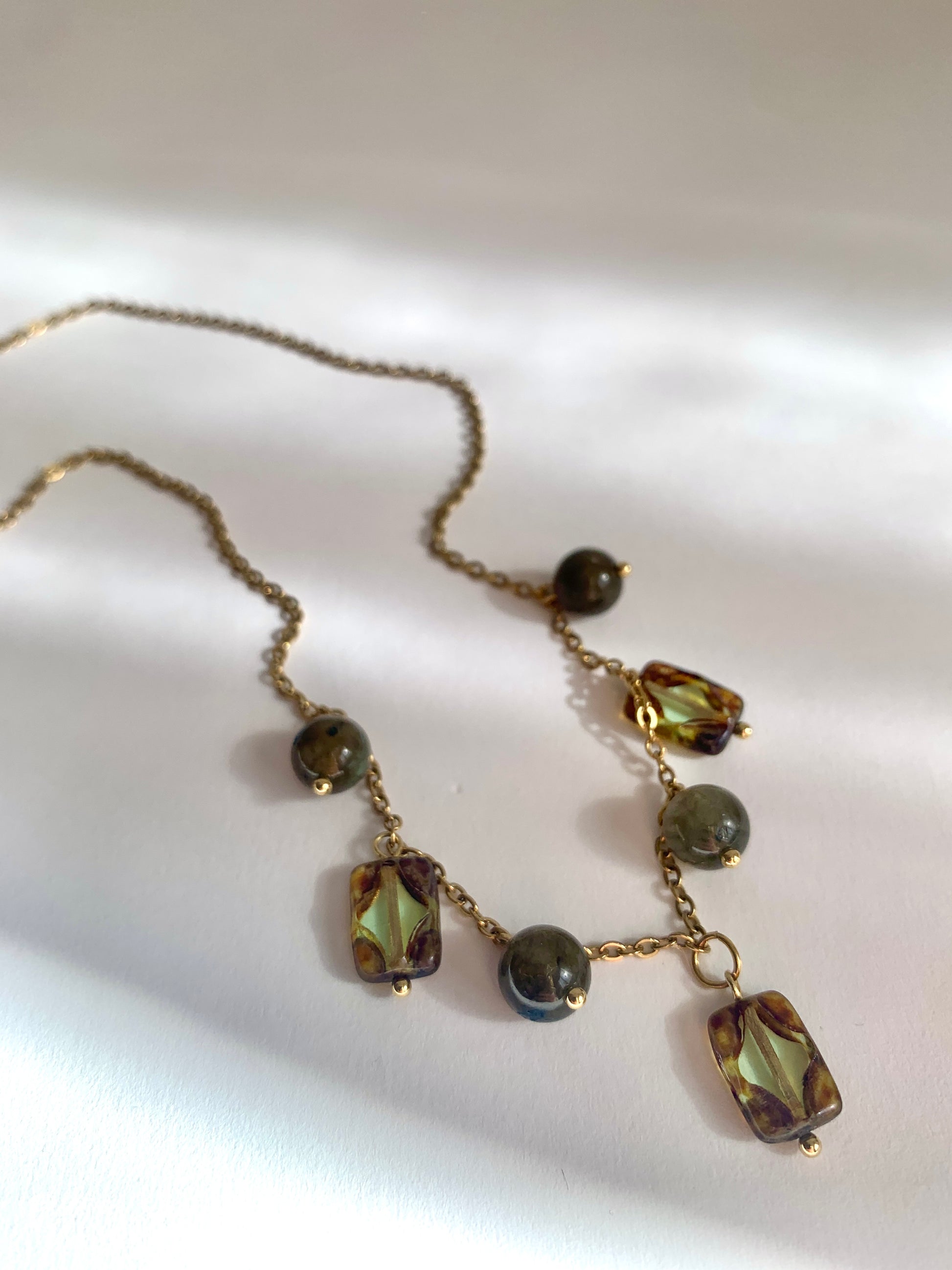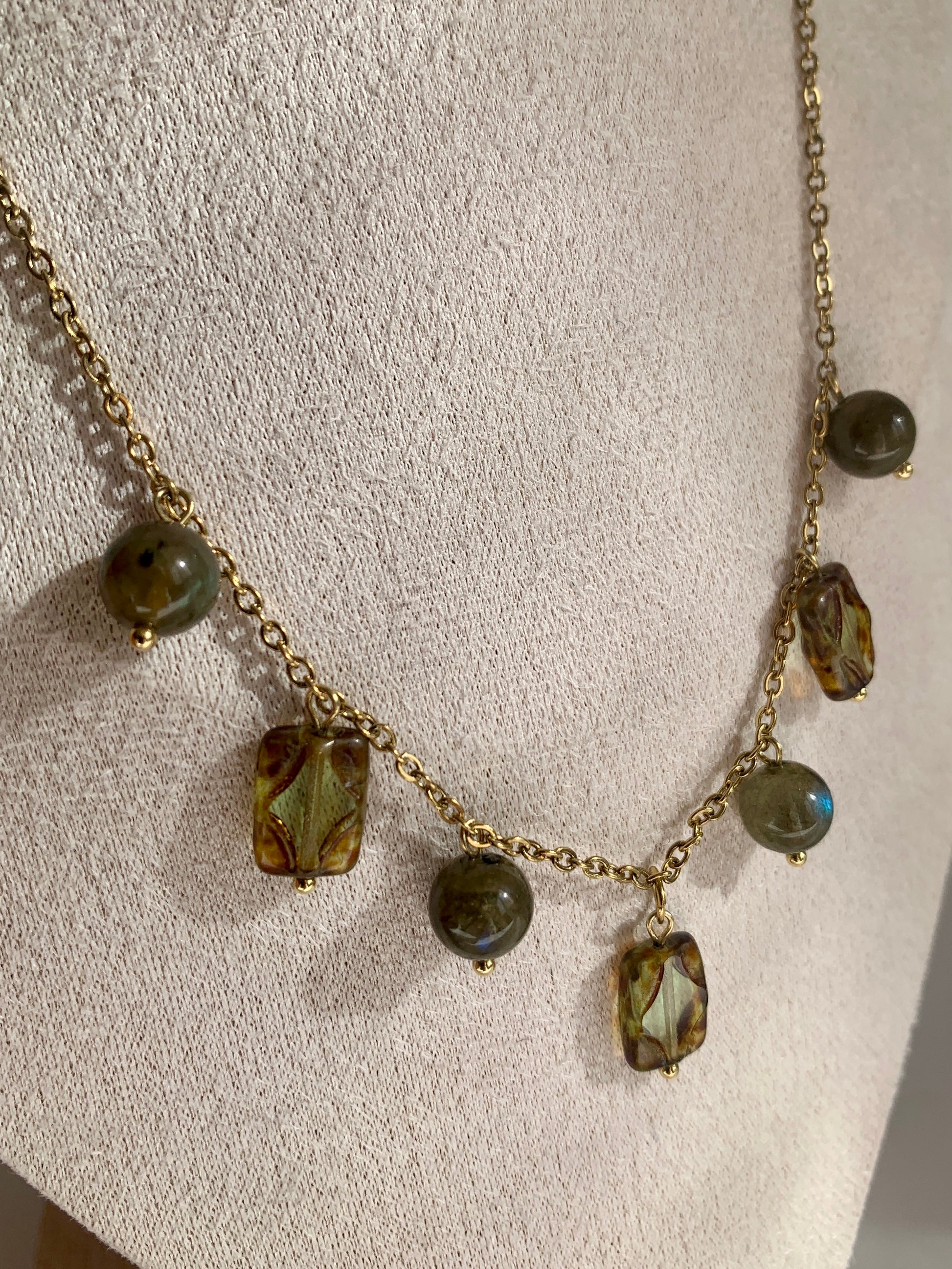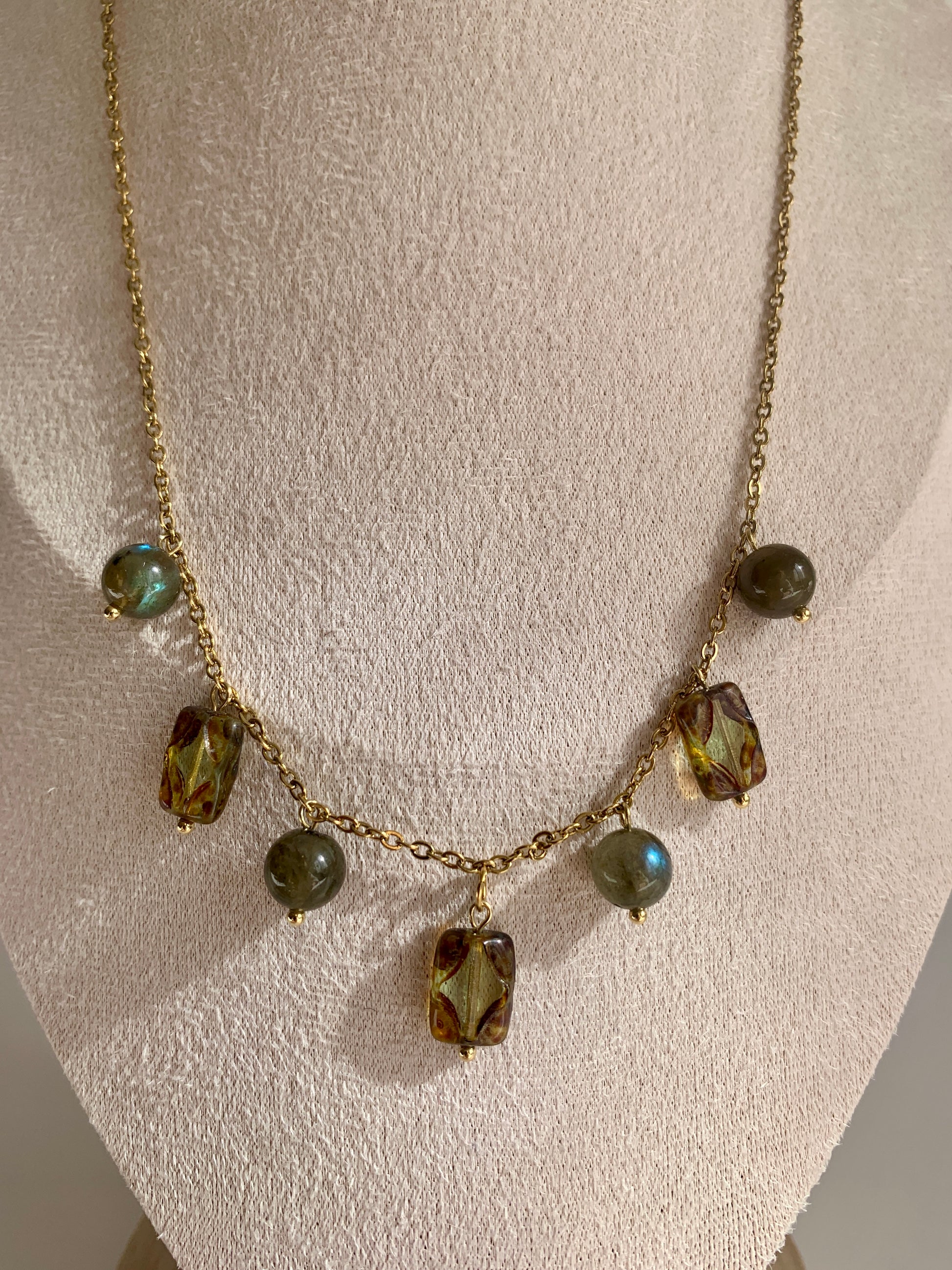 Ce collier délicat mêle l’éclat vintage des pampilles à la profondeur subtile de la labradorite verte, pierre d’intuition et de protection douce.