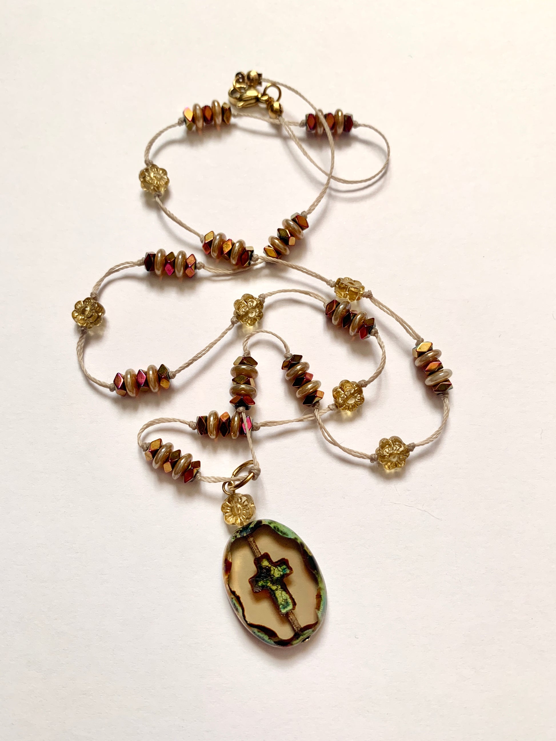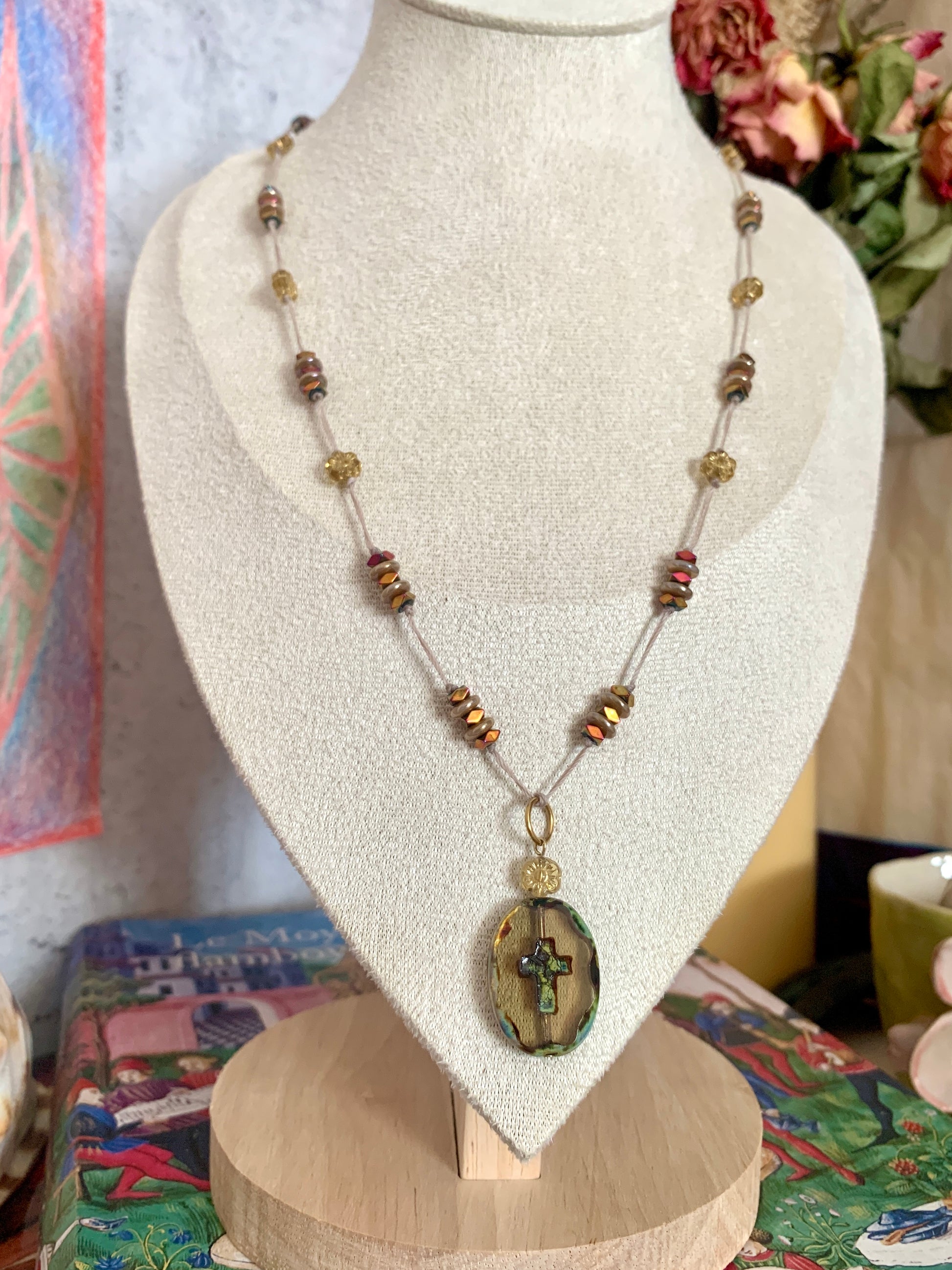 Chaque détail raconte une histoire : les perles de verre délicatement façonnées en petites fleurs murmurent la beauté des jardins anciens, les perles d’hématite iridescentes accrochent la lumière comme des éclats de ciel changeant, et la croix centrale, douce et discrète, devient un symbole personnel, une boussole intime pour les âmes en chemin.