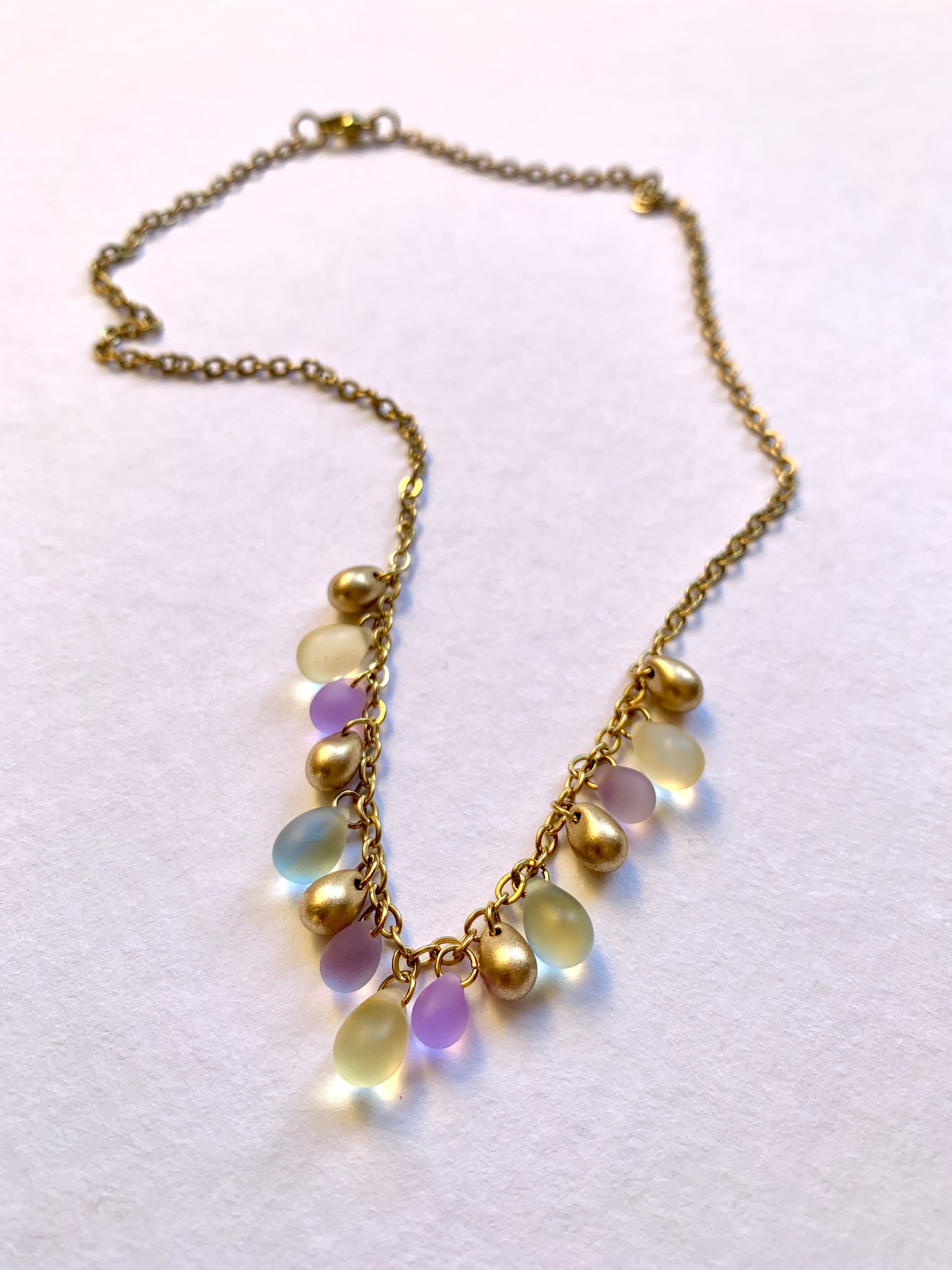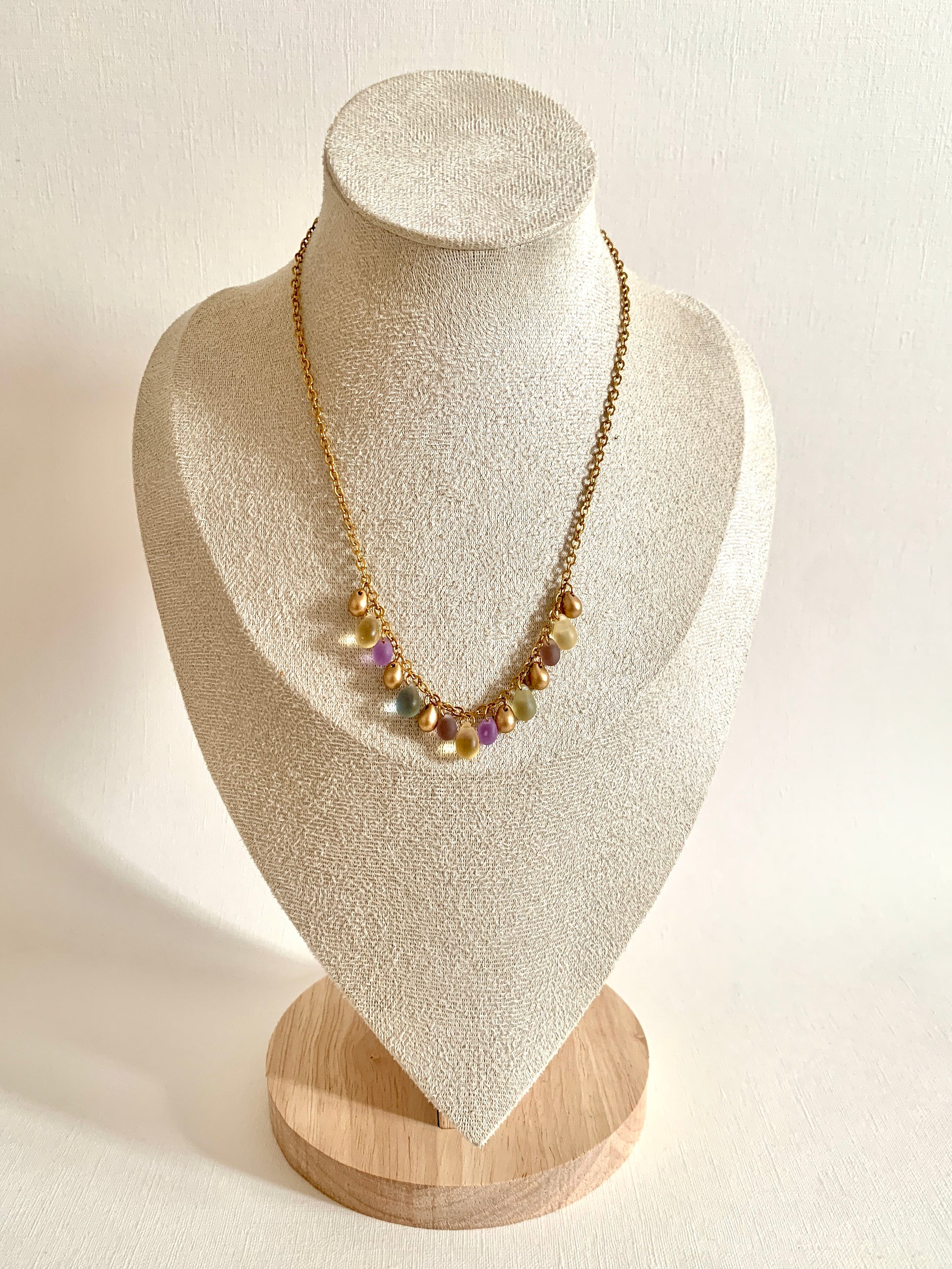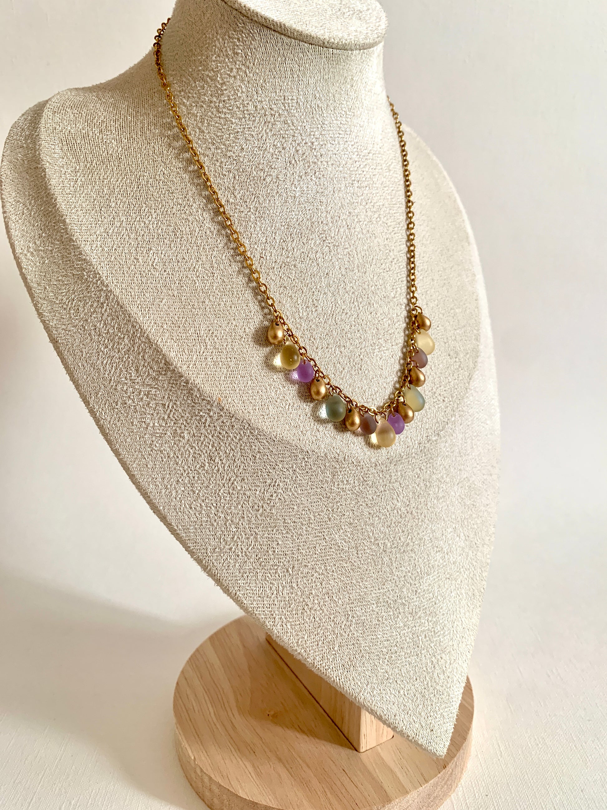 Les perles de verre sont délicates, comme des petites gouttes précieuses, elles demandent de l'attention. Evitez de le jeter au fond d'un sac ou de le faire tomber. Le verre aussi joli soit-il, reste fragile.