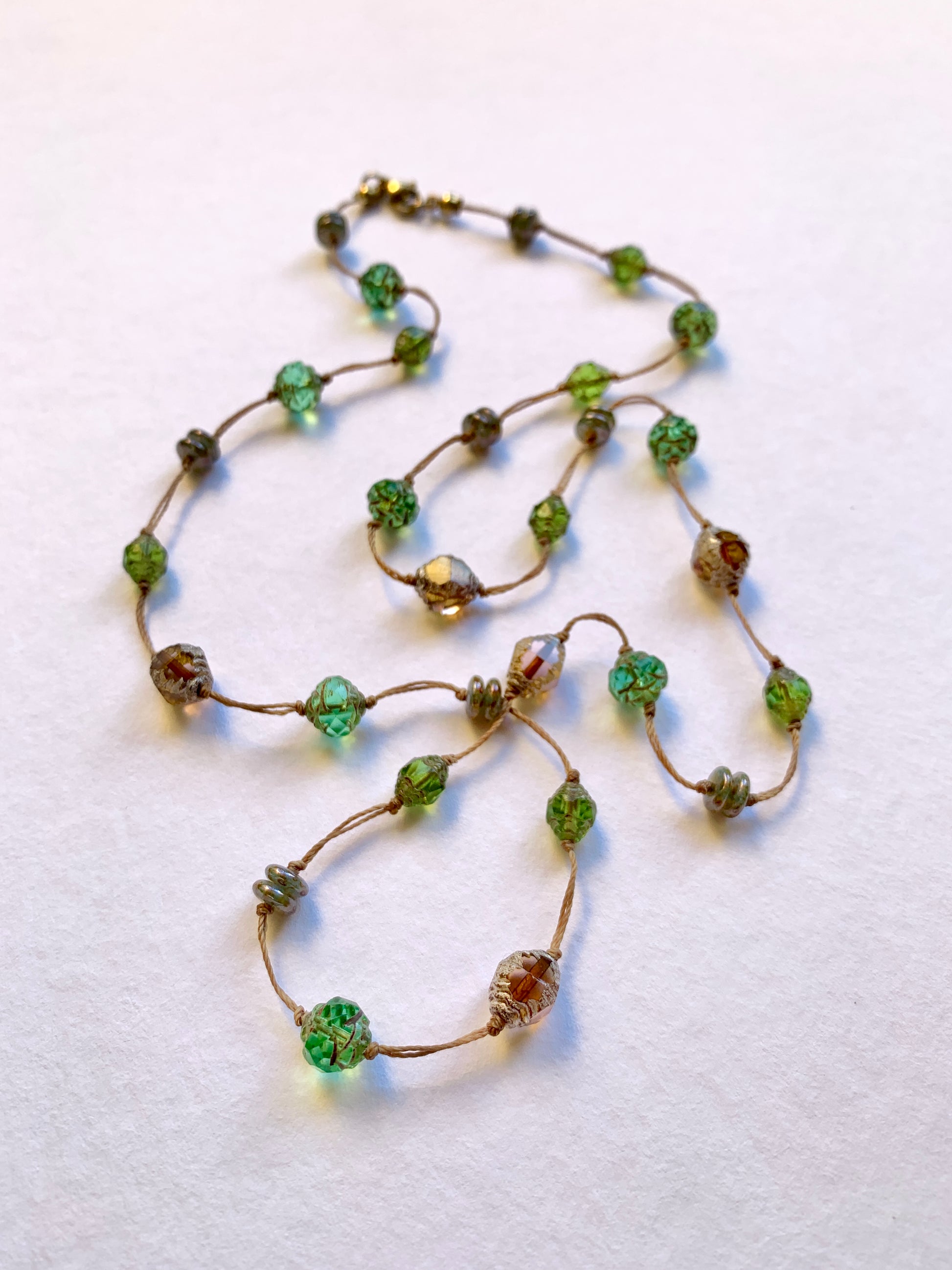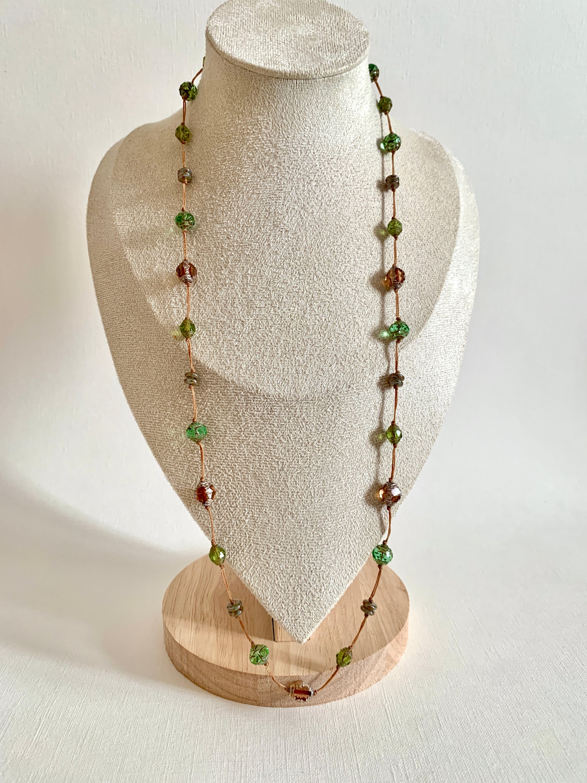 Ses perles de verre vertes et ambrées évoquent la force tranquille de la nature, celle qui relie la terre à la vie, la racine au souffle.