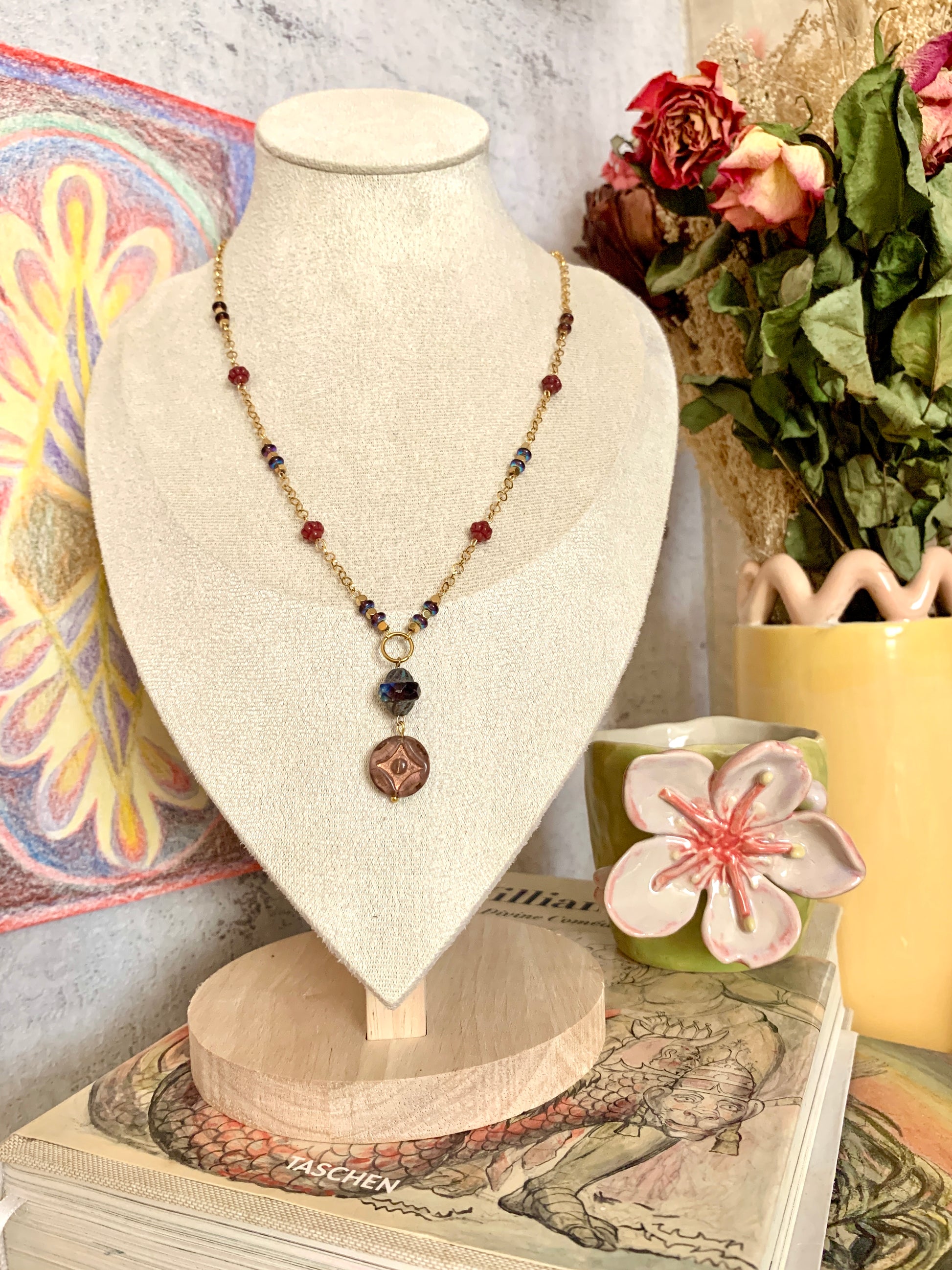 Suspendue à une chaîne dorée, la perle centrale capte chaque rayon comme un mirage au bord du sable. Éclat de Dune est une étoile tombée du ciel pour guider les pas rêveurs. À chaque reflet, elle raconte une halte au milieu des dunes, là où naissent les secrets.