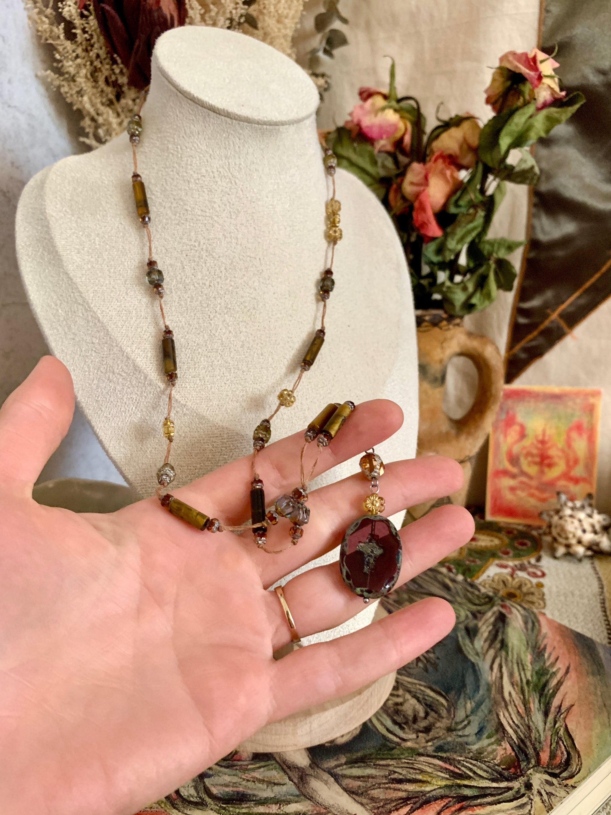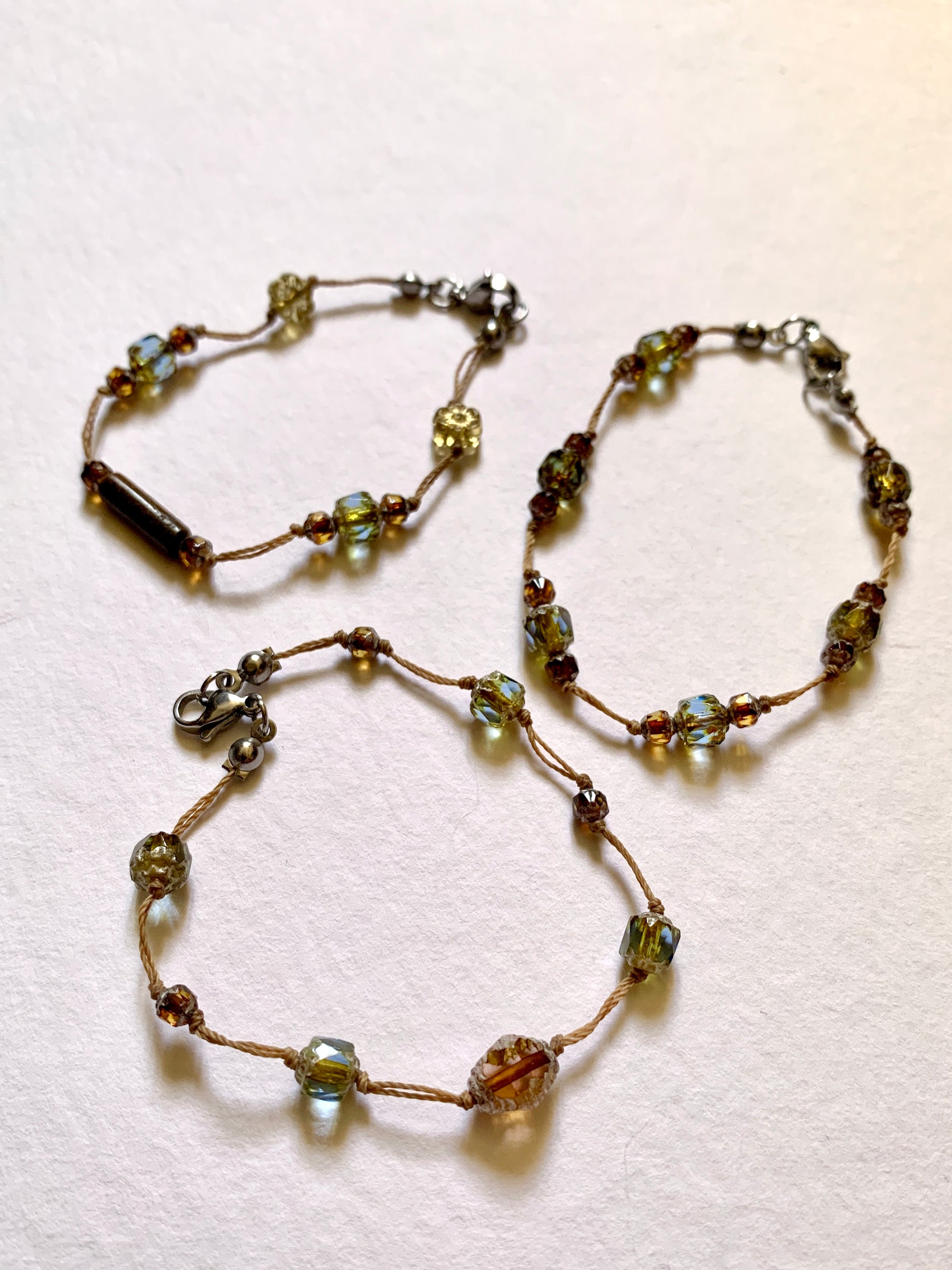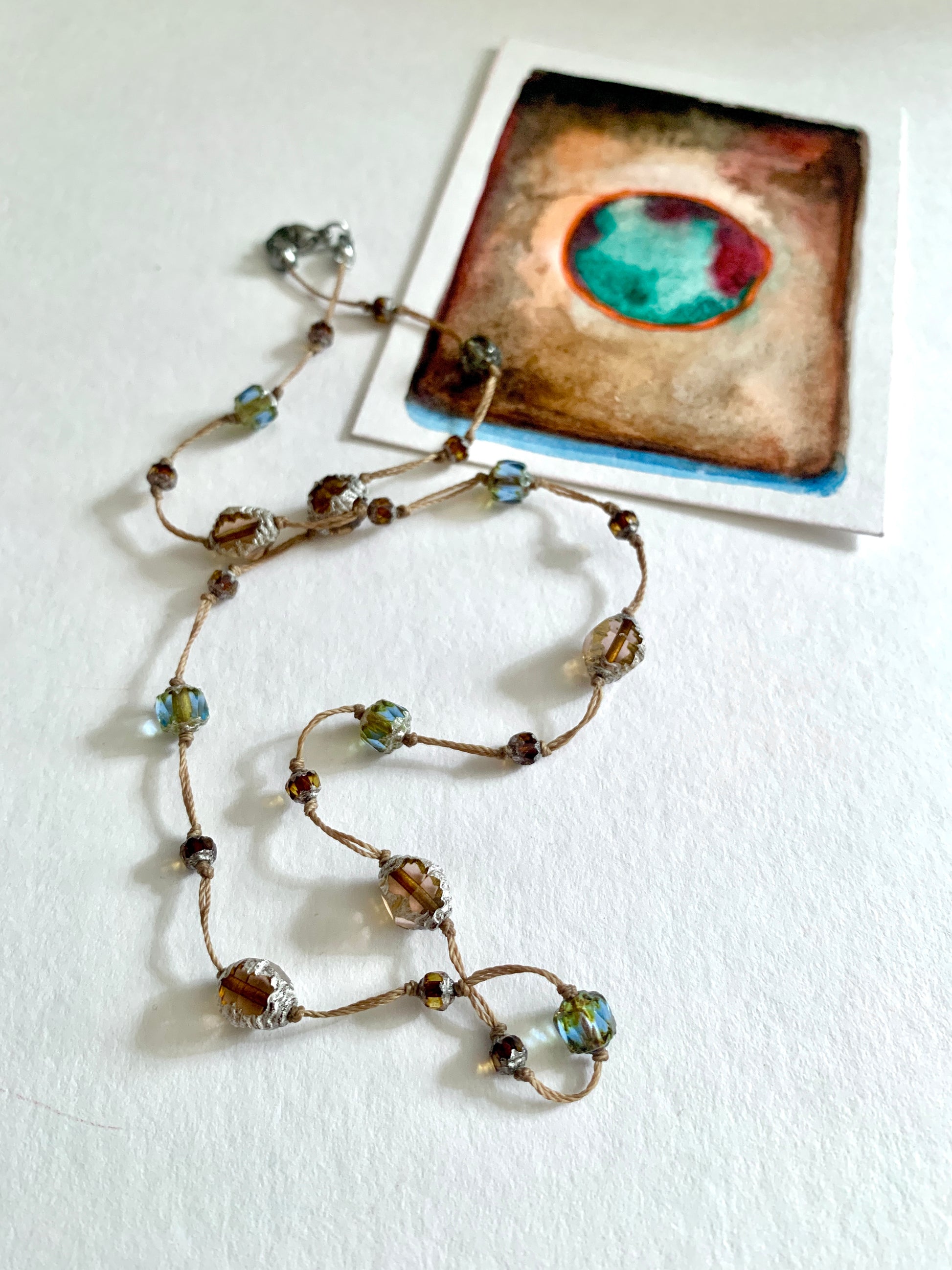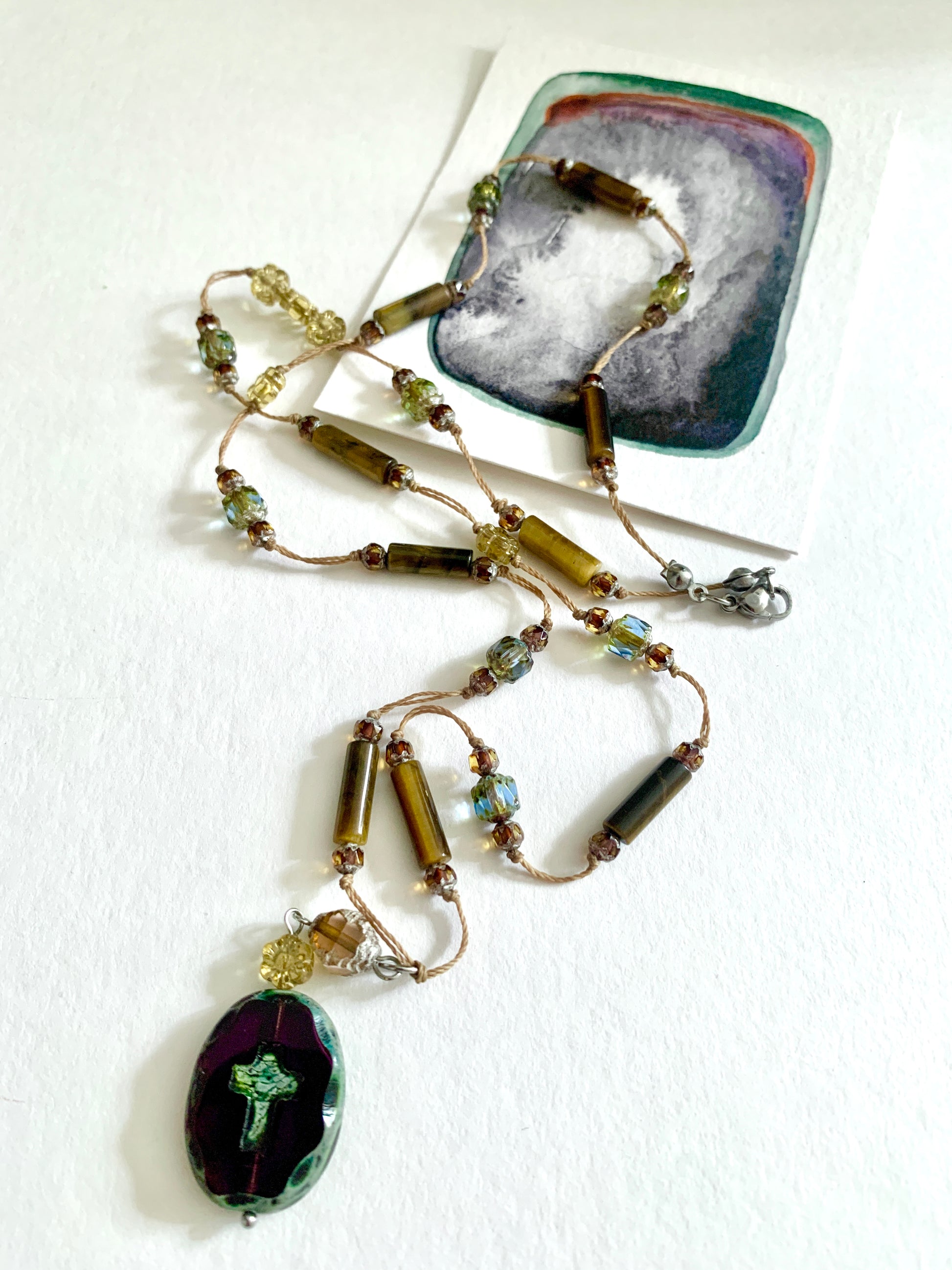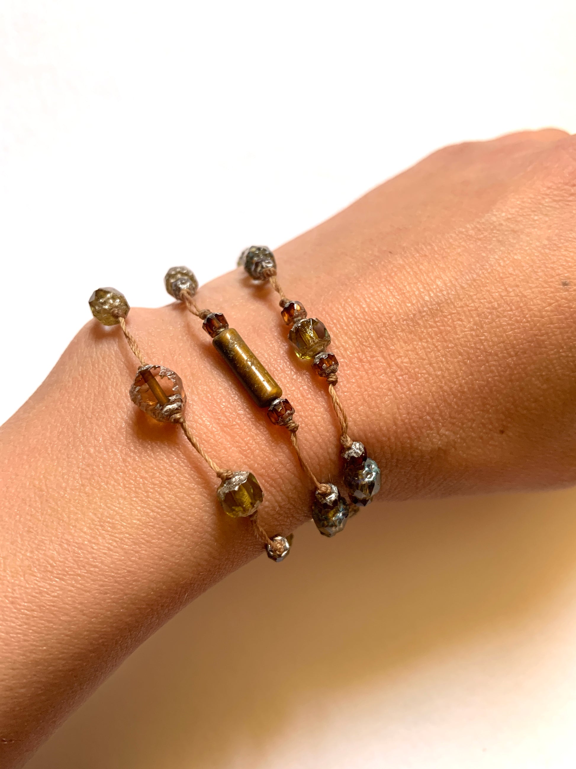 Perles de verres tchèque et oeil de tigre montées sur une corde cirée résistante.