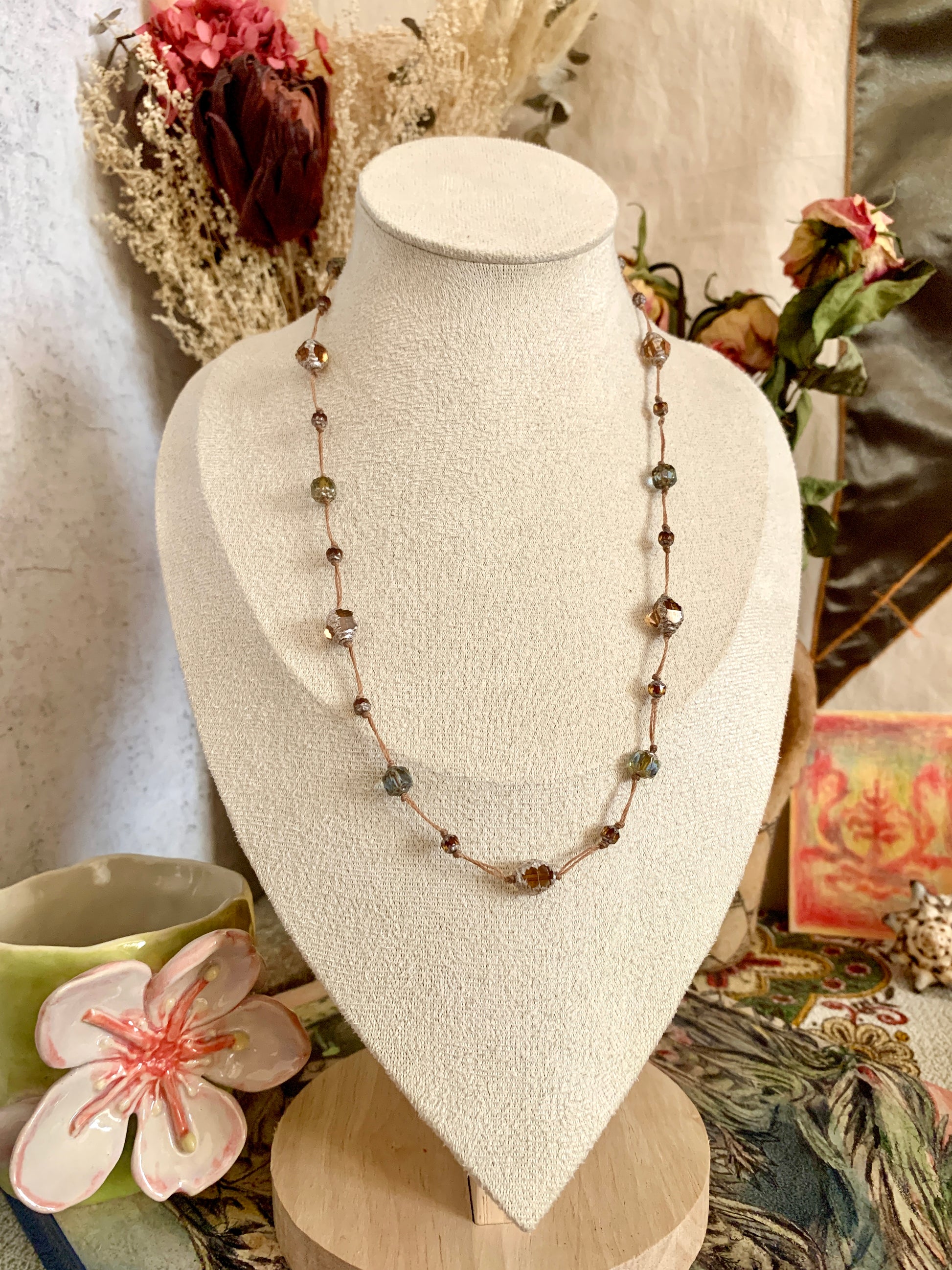 Les perles bleues, éclats de ciel, se mêlent aux teintes ambrées et brunes de la terre. Les petites fleurs de verre rappellent les fragiles miracles de la nature, tandis que l’œil de tigre protège et guide le chemin.